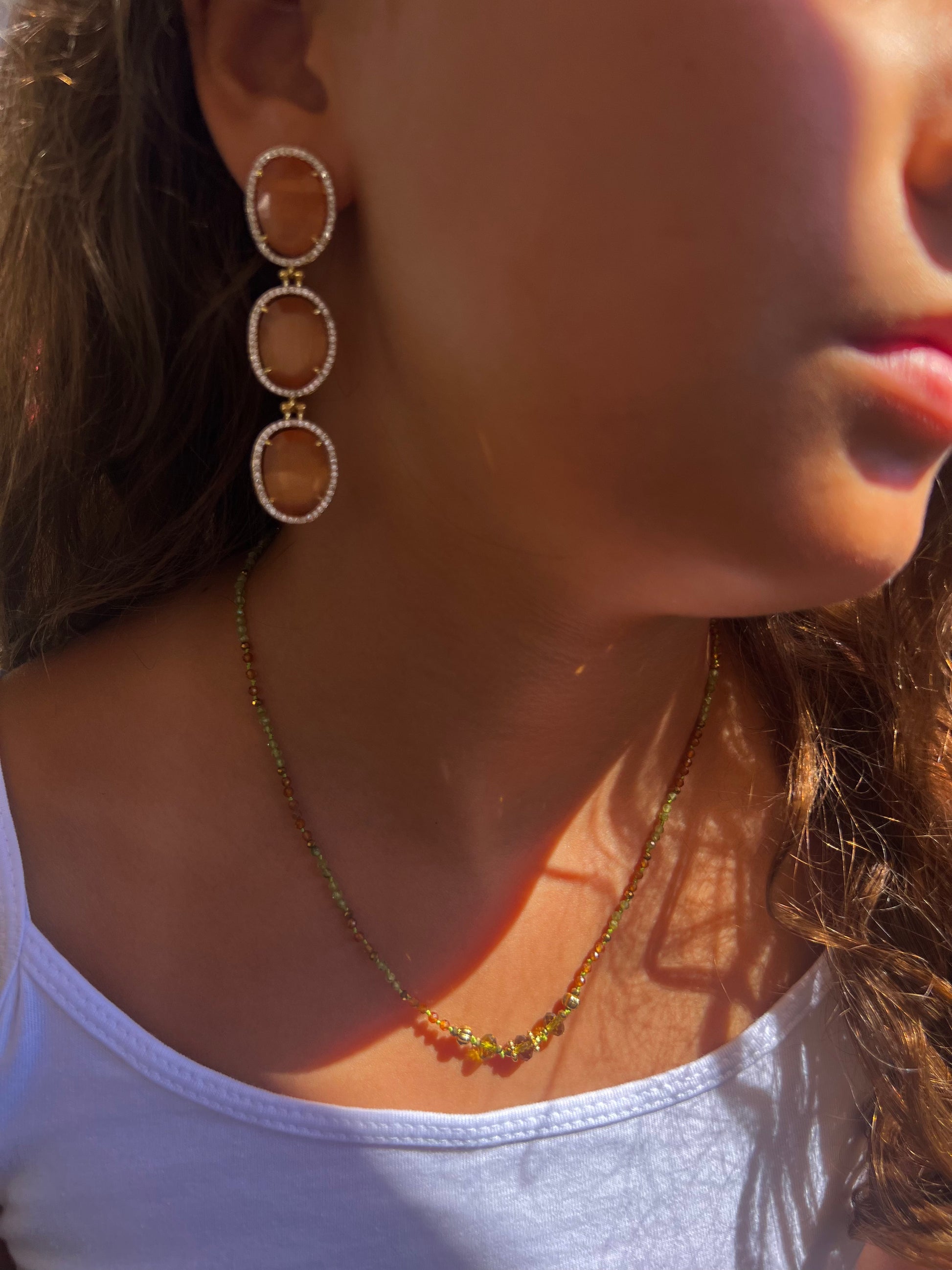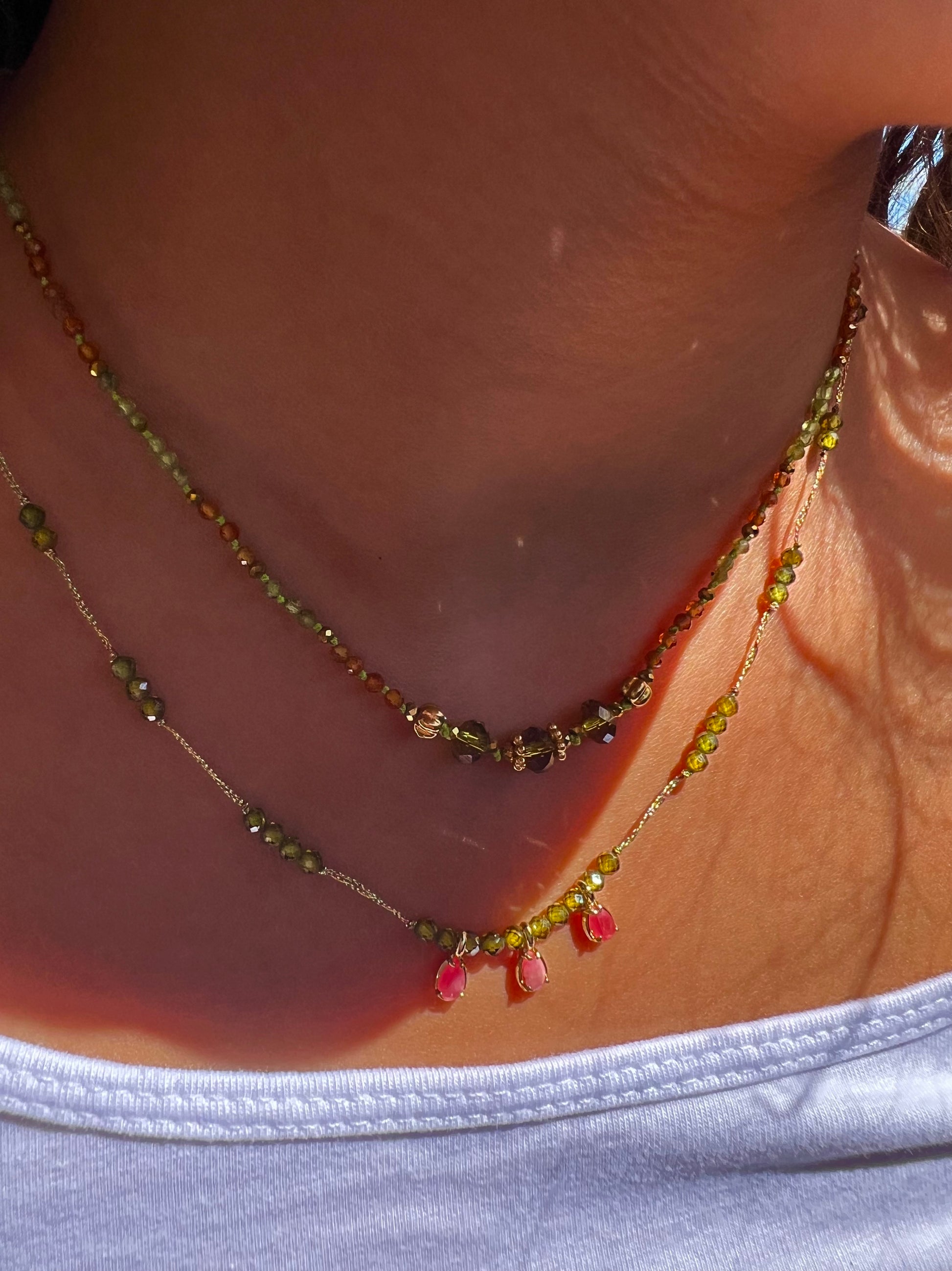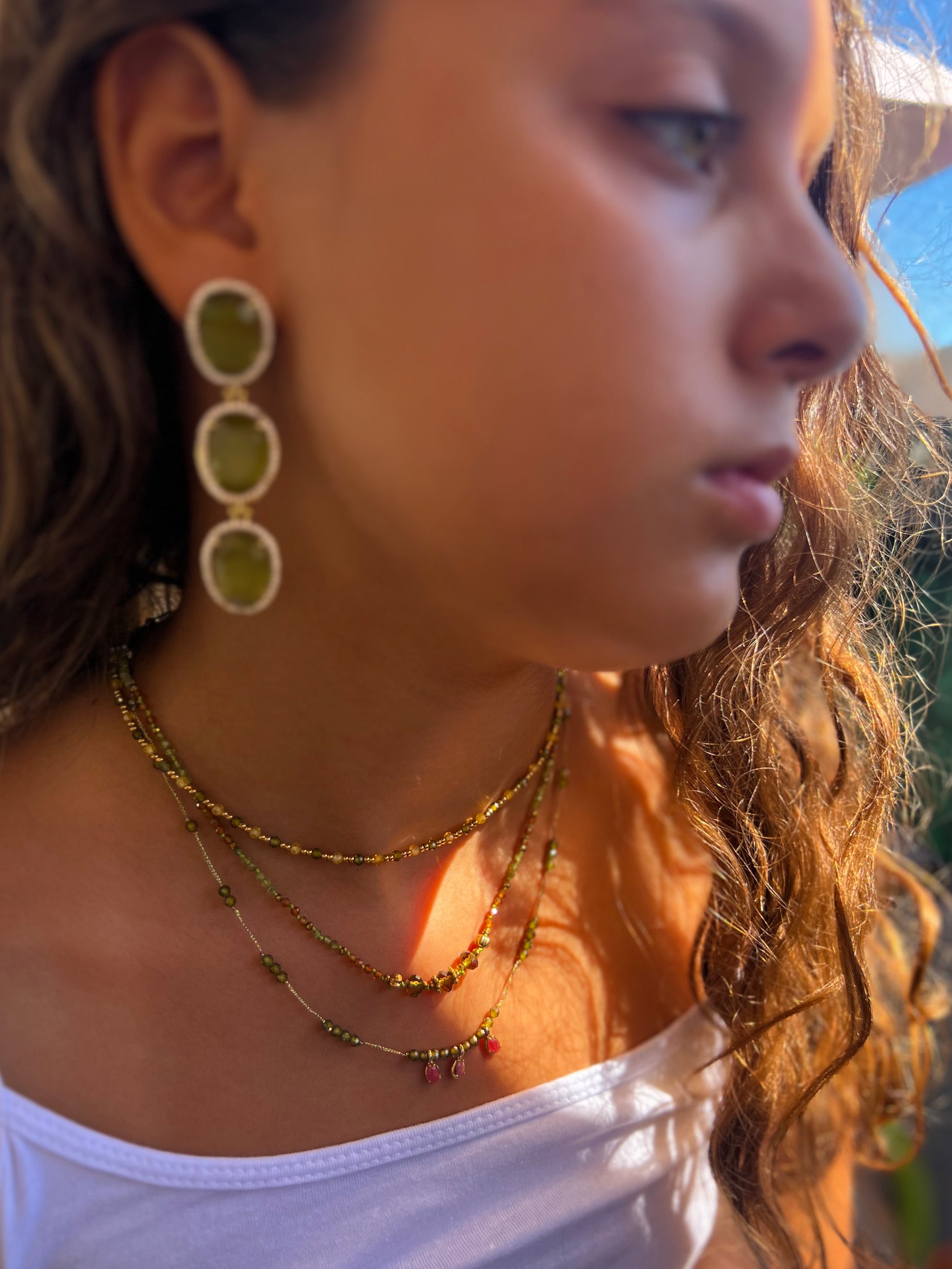 Le collier Mathilde séduit par son style raffiné et naturel 🌸. Composé de perles en préhnite, de quartz marron et de trois rondelles vertes, il apporte une touche d’élégance minérale à vos tenues. Un bijou unique qui mêle douceur et authenticité.