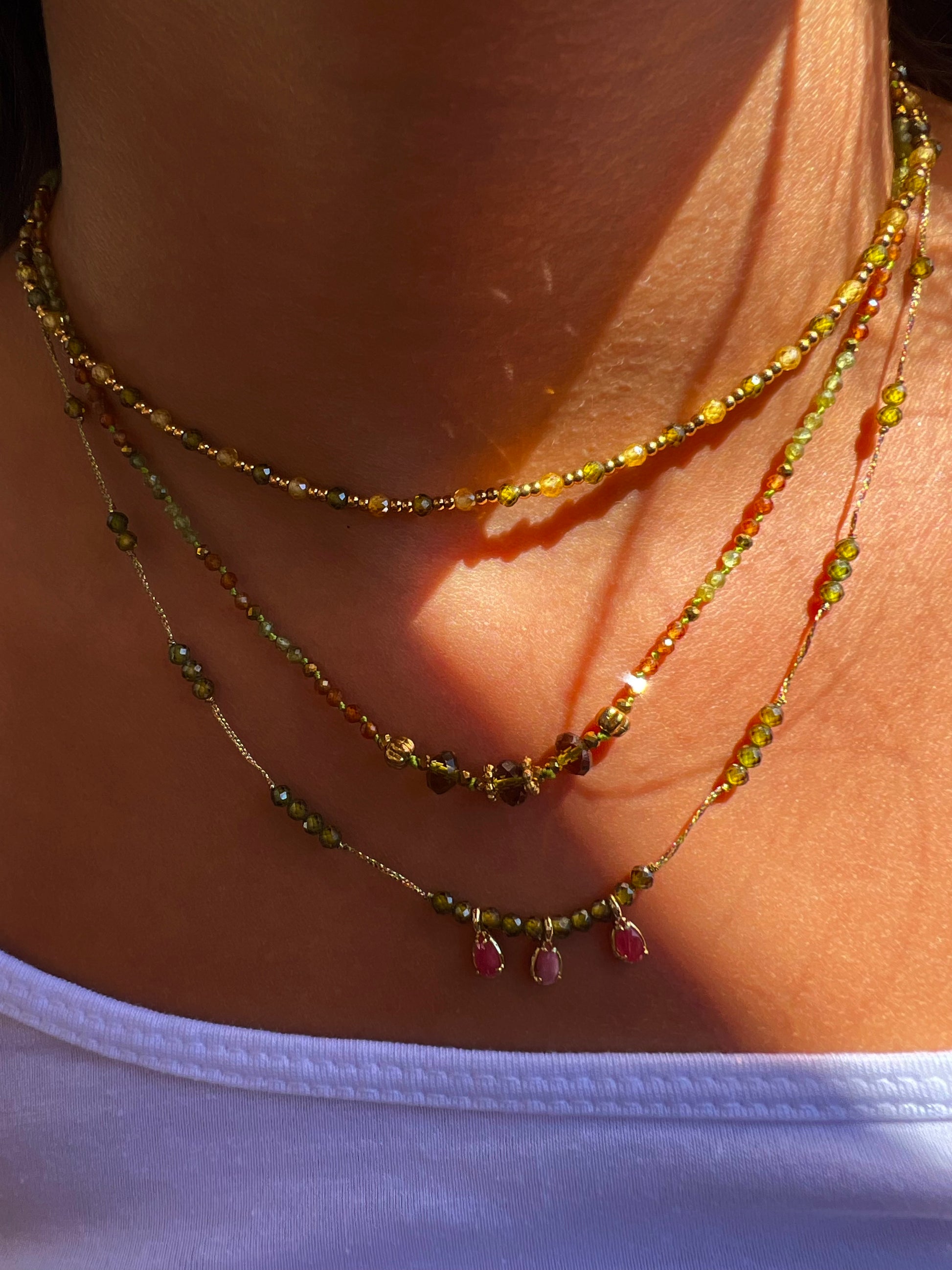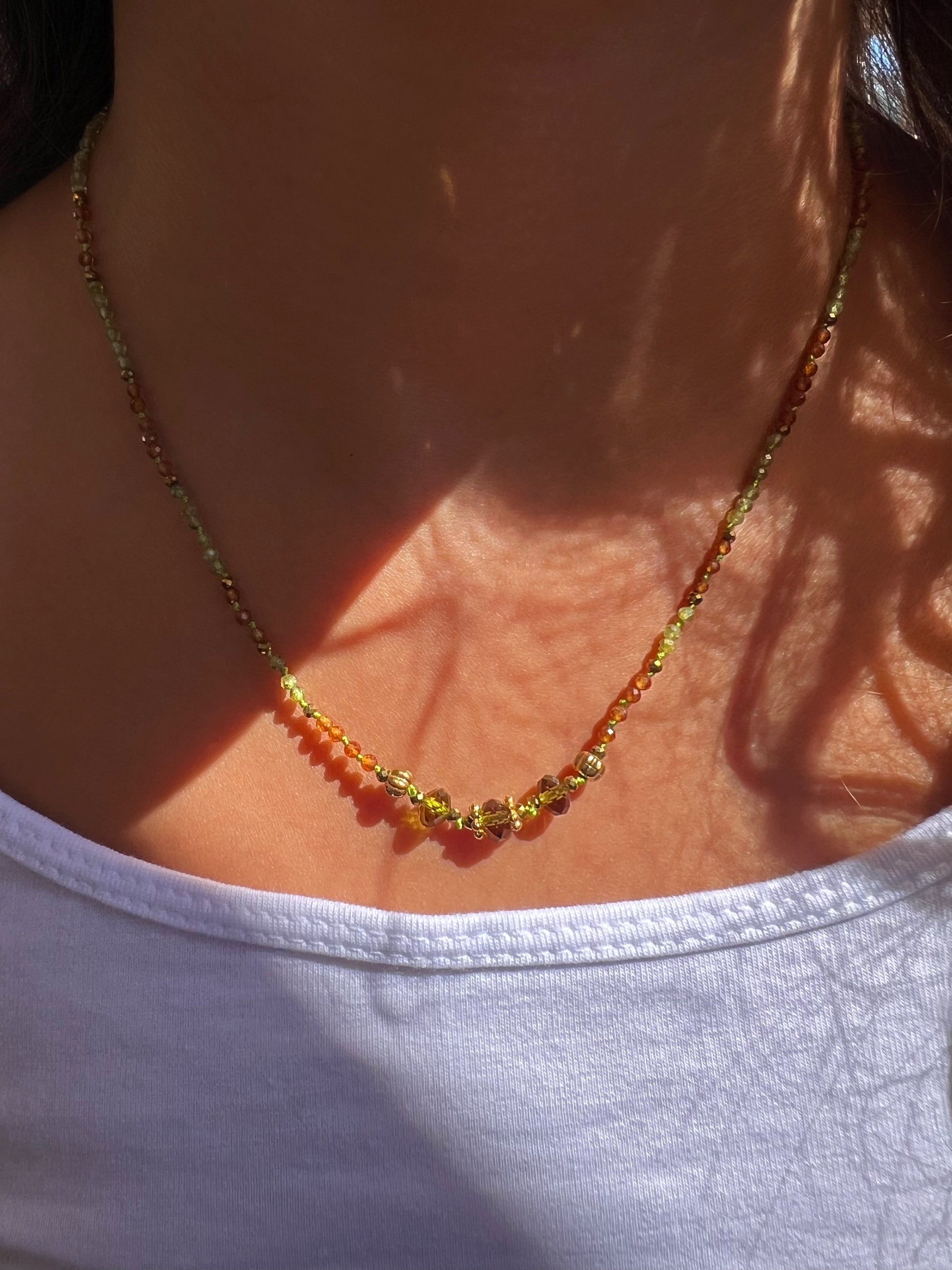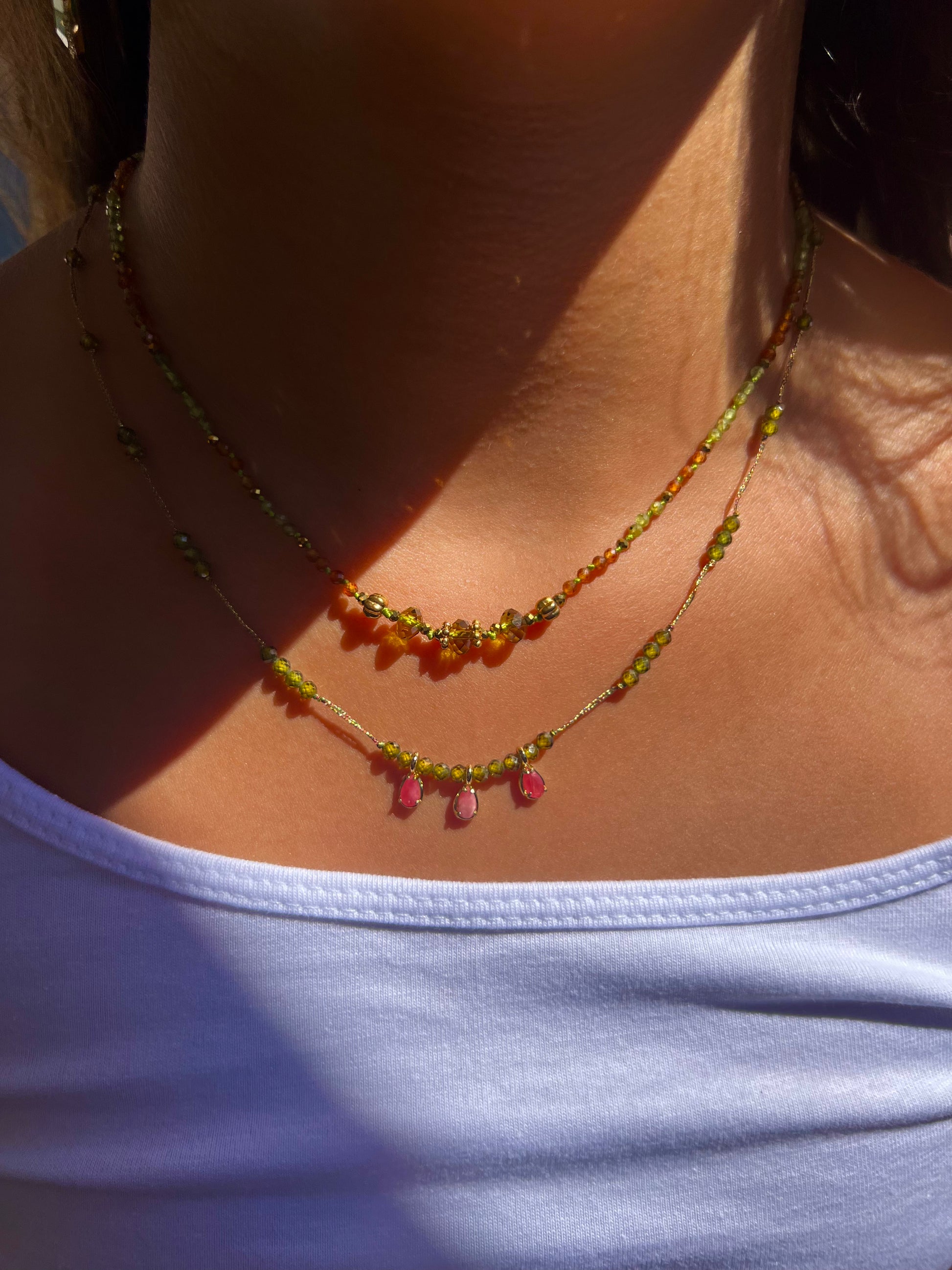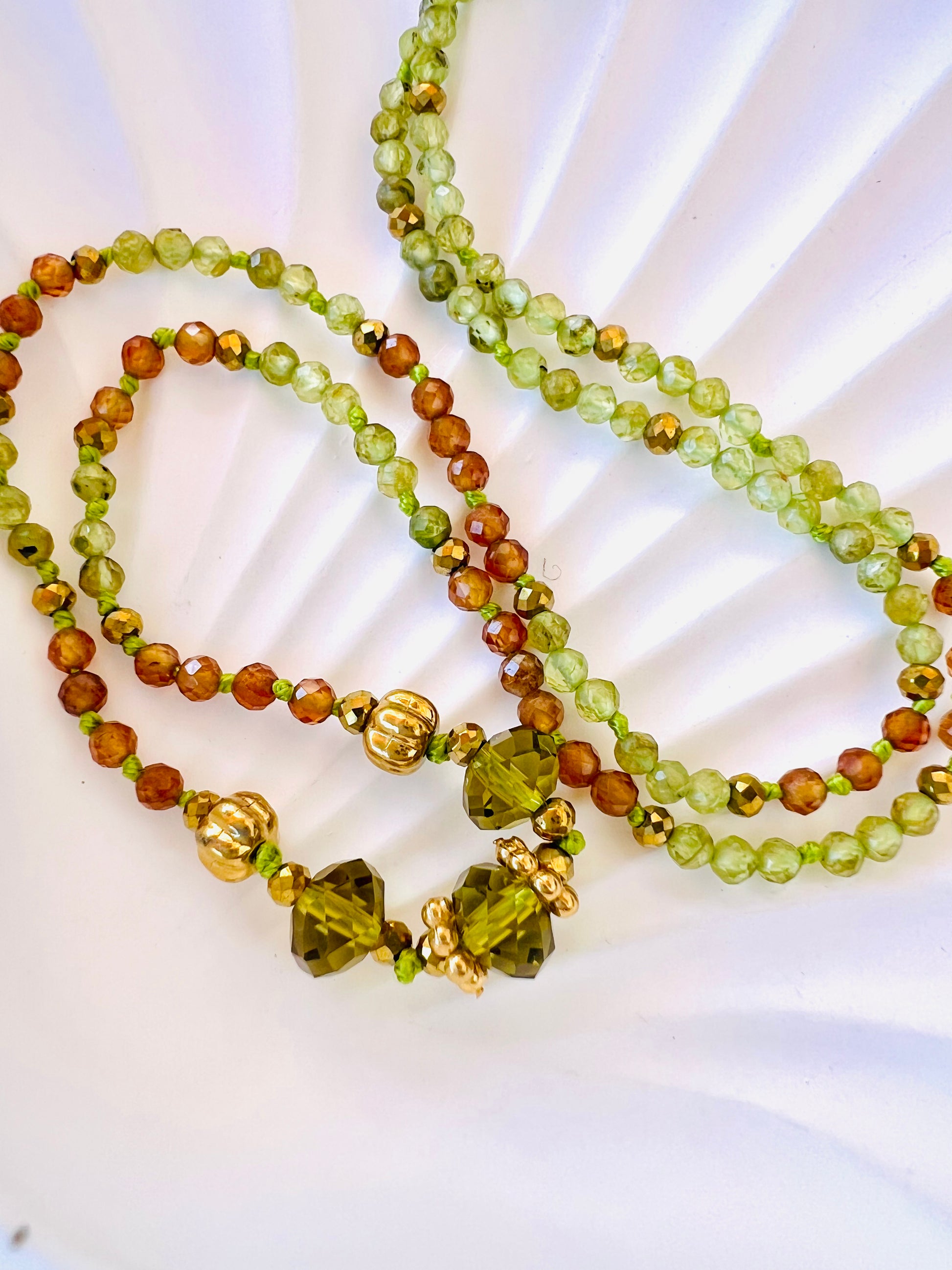 Le collier Mathilde séduit par son style raffiné et naturel 🌸. Composé de perles en préhnite, de quartz marron et de trois rondelles vertes, il apporte une touche d’élégance minérale à vos tenues. Un bijou unique qui mêle douceur et authenticité.
