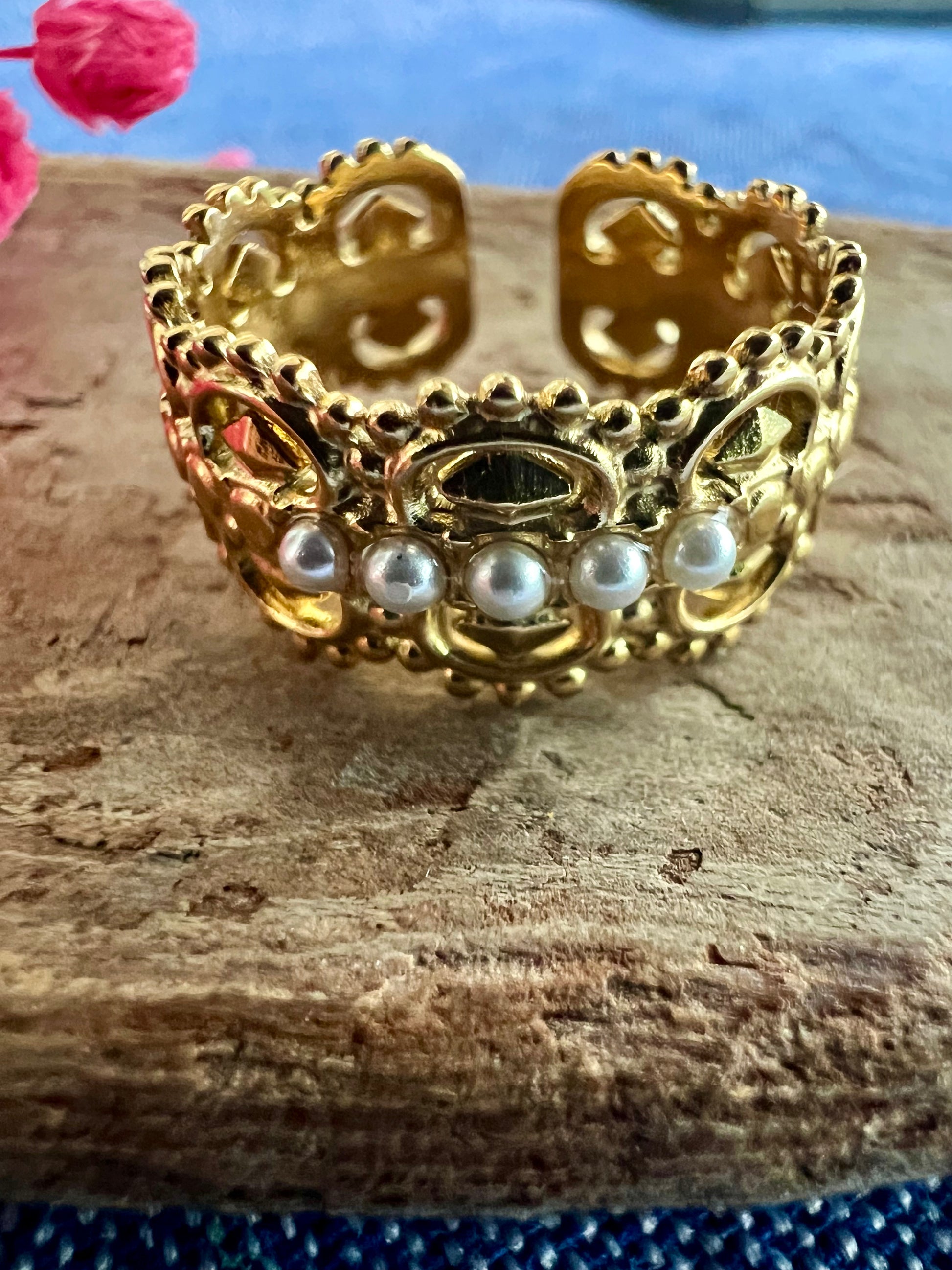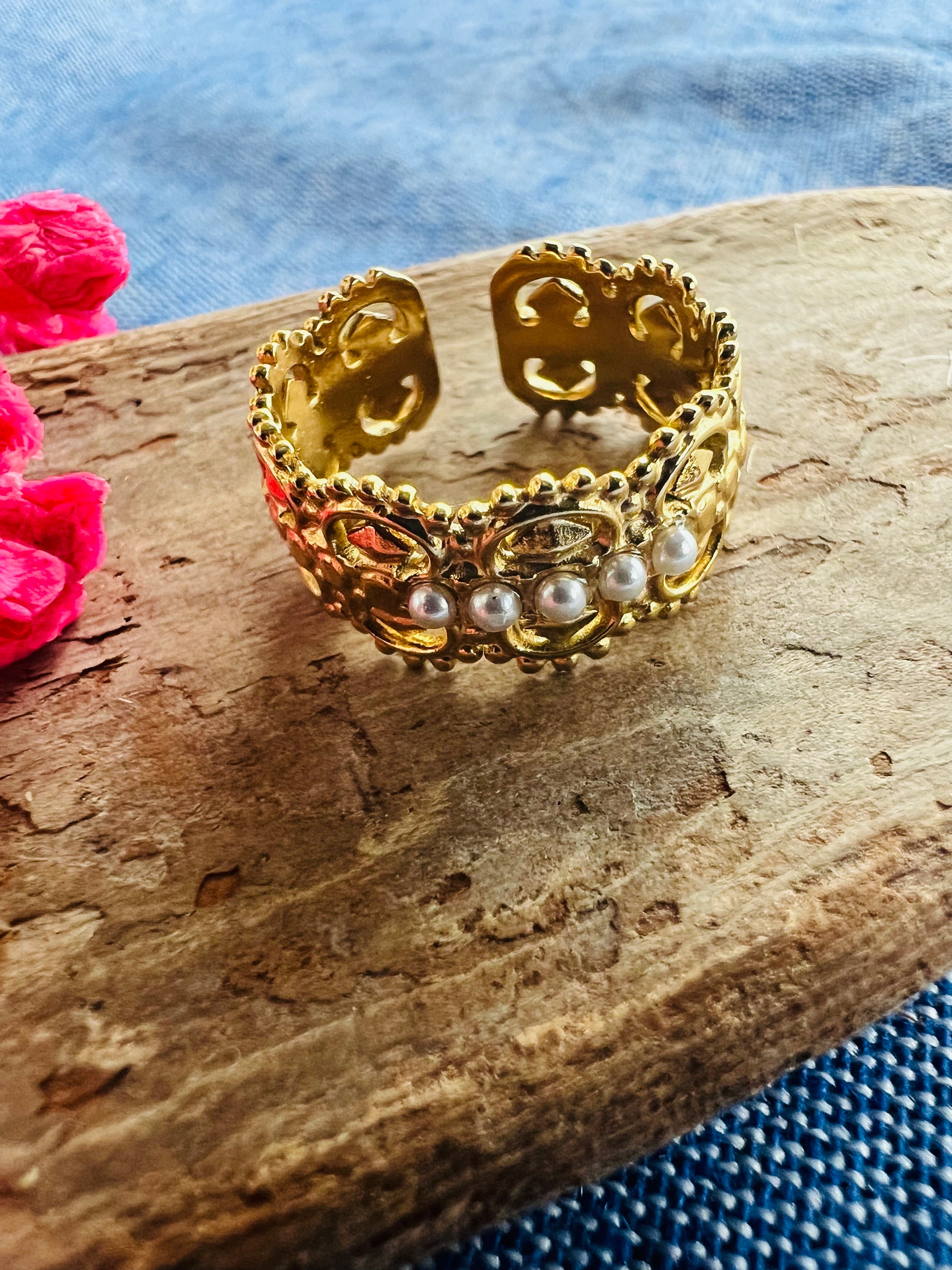 ✧ Bague dorée en acier inoxydable et perles nacrées.