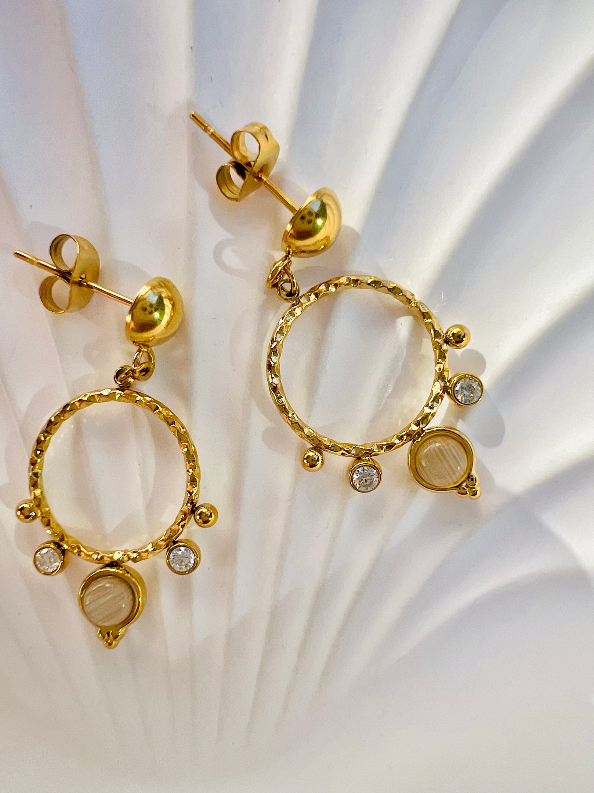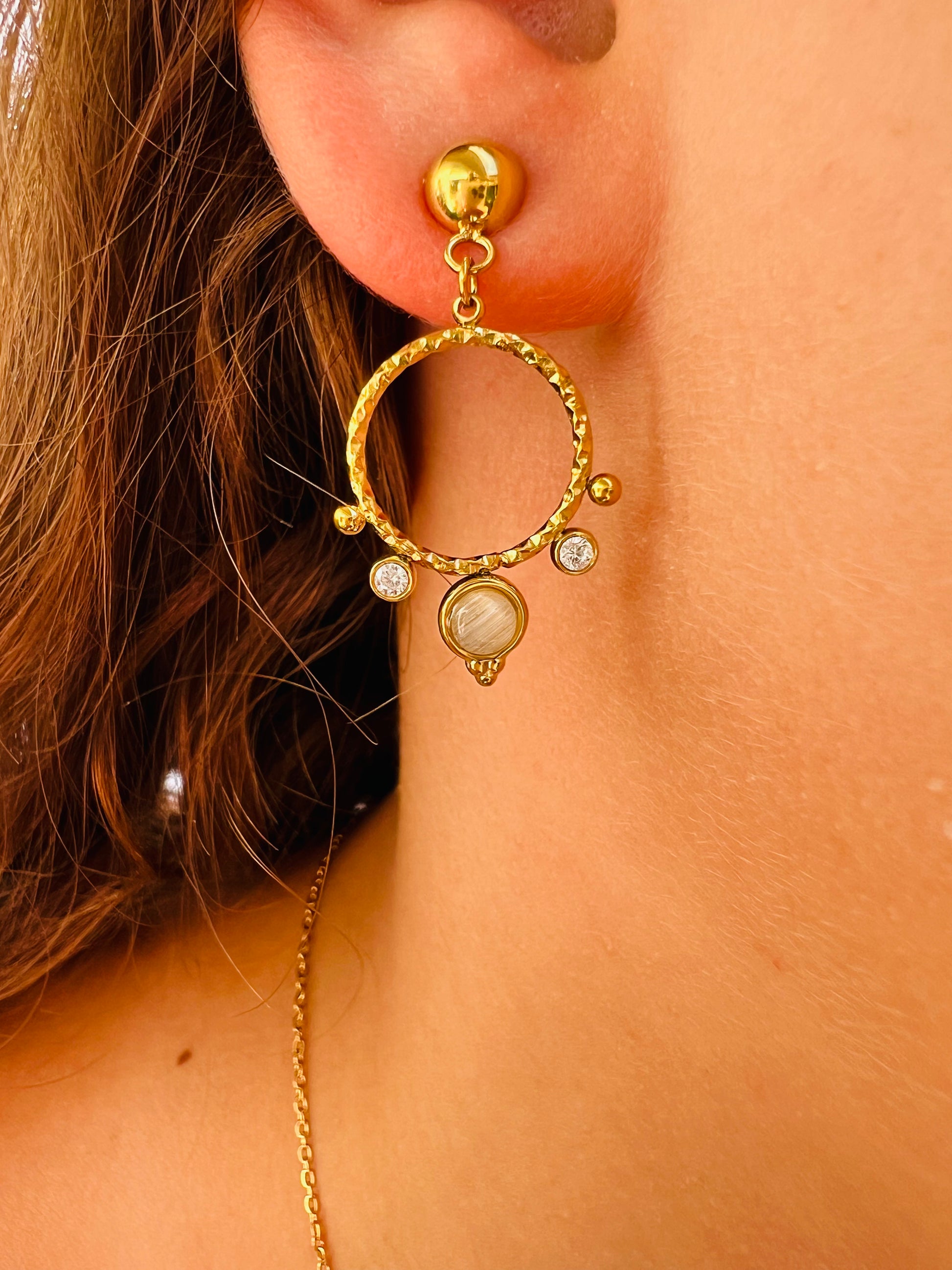 ✧ Boucles dorées pendantes en acier inoxydable doré, pierre naturelle et oxyde de zirconium.