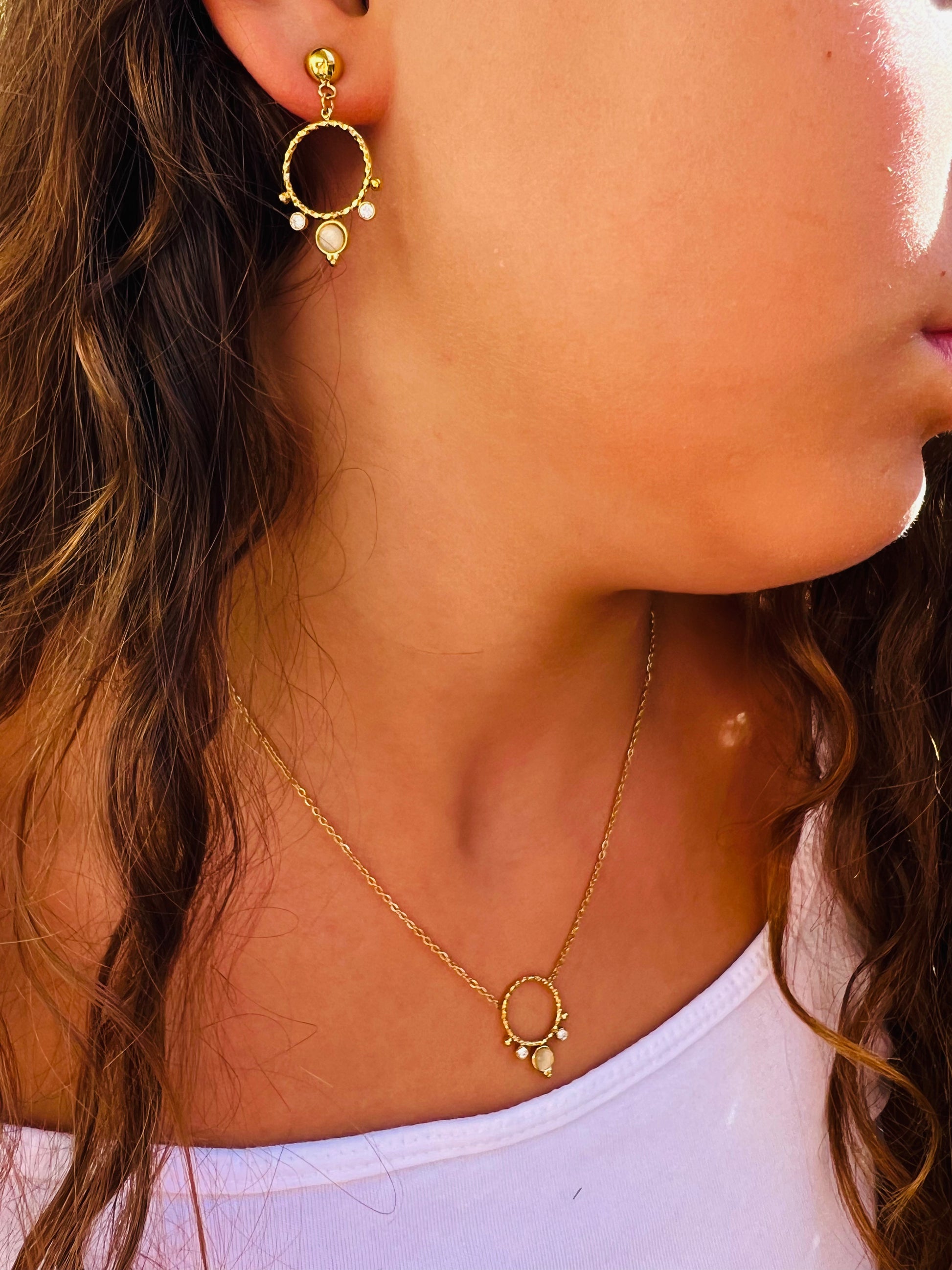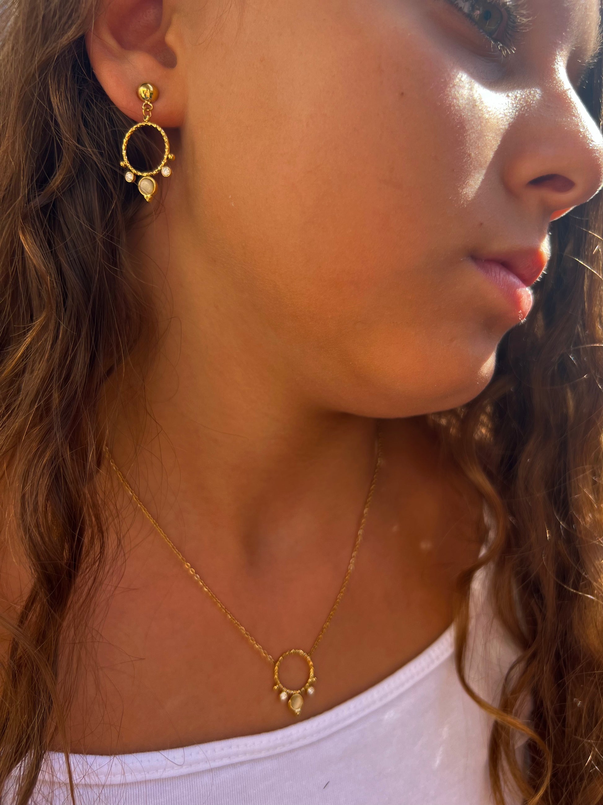 Les boucles Mira scintillent grâce à leur rond orné d’oxydes de zirconium et d’une pierre en œil de chat orange au centre. Elles se déclinent également en collier pour une élégante parure 🌟.