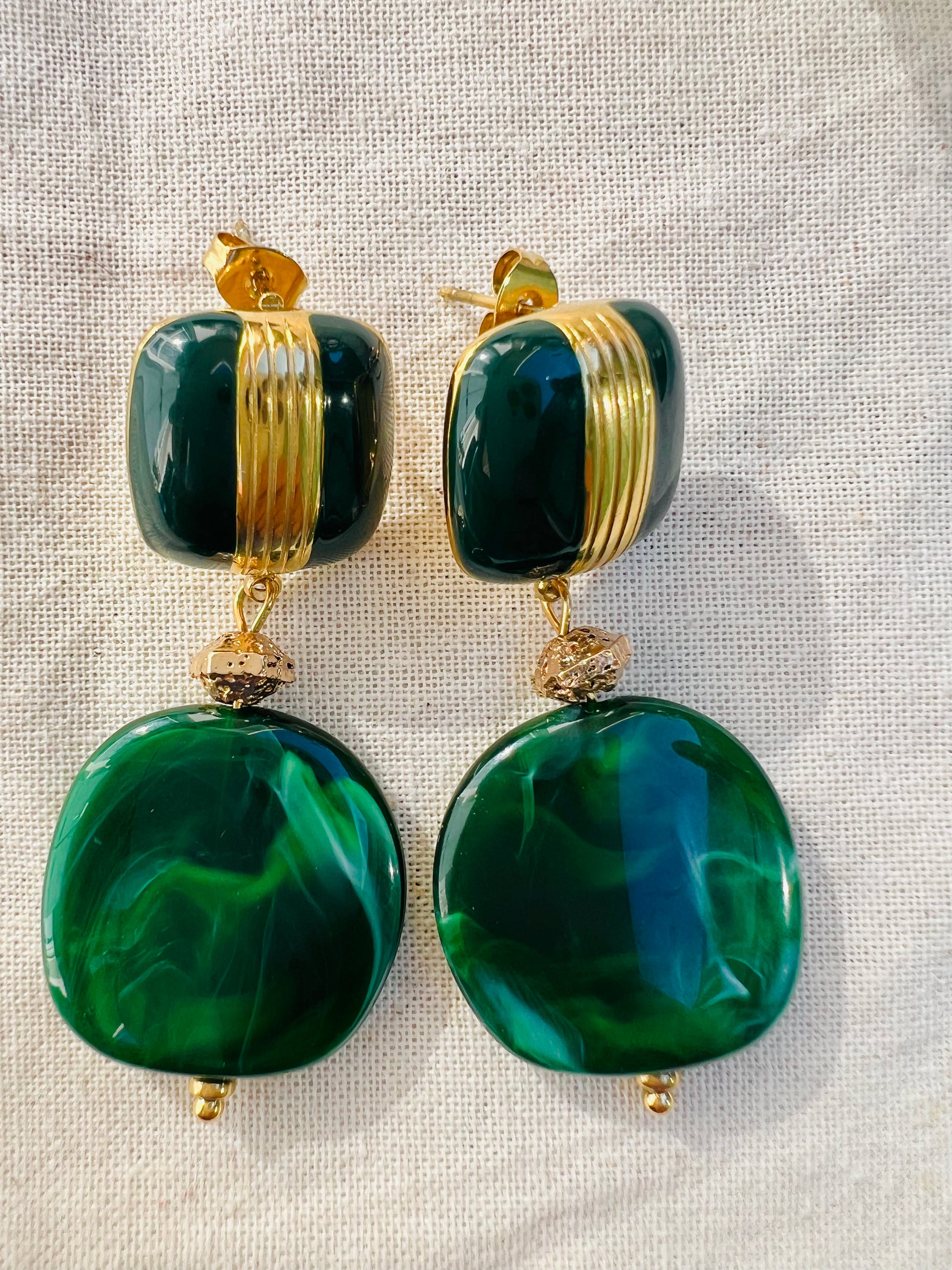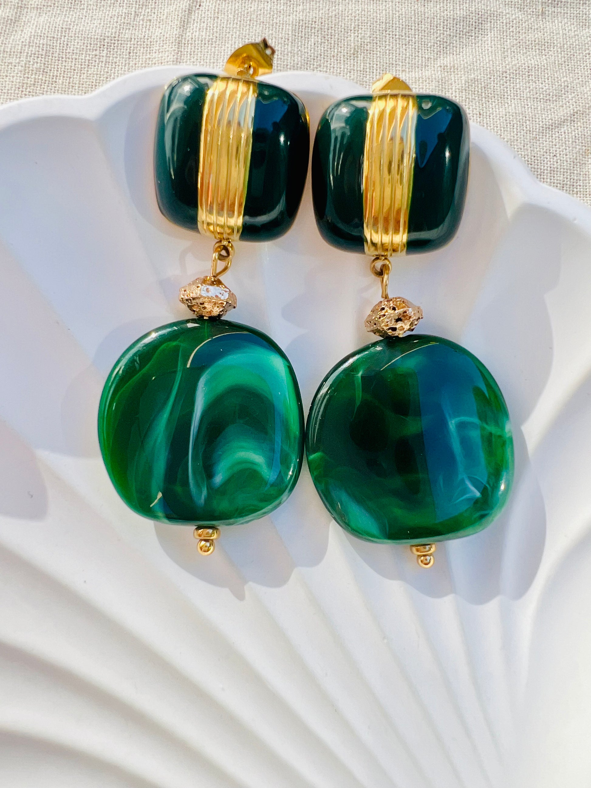 Les boucles Mirabelle séduisent par leur originalité. Composées de deux carrés, un en émail et l'autre en résine, elles existent en vert ou en marron pour un style audacieux et coloré 🎨.