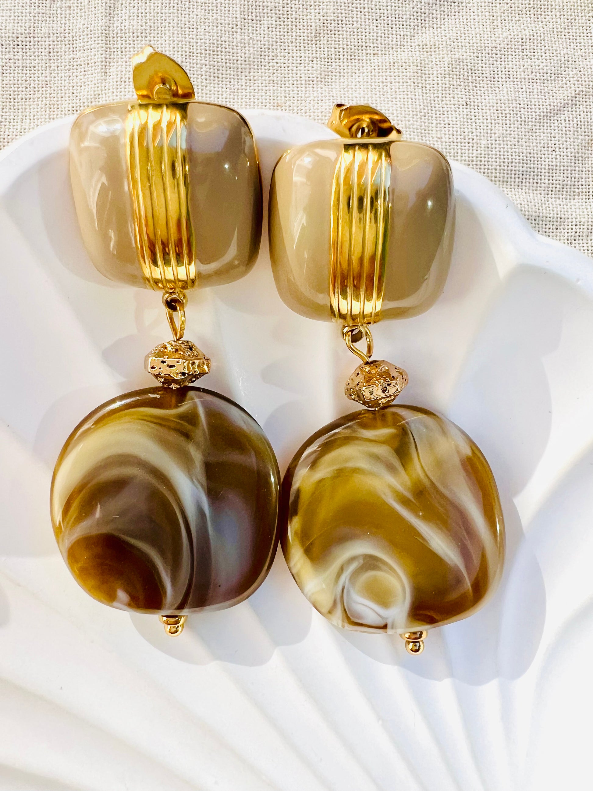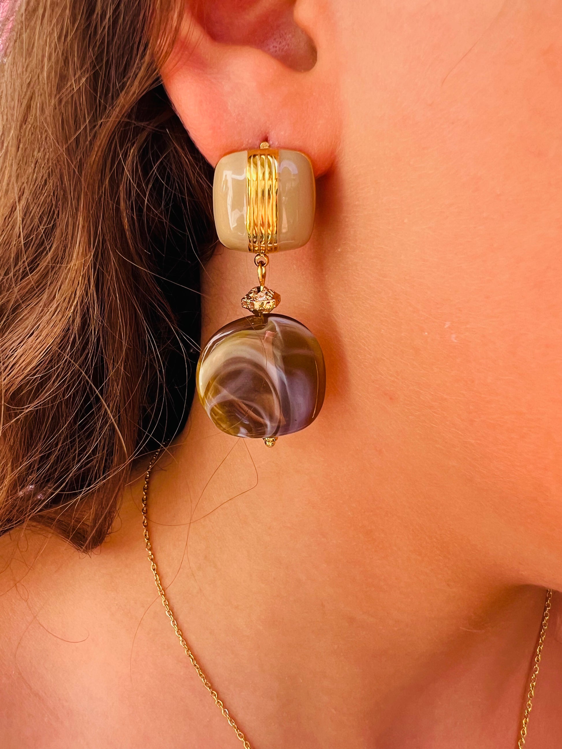 ✧ Boucles dorées pendantes en acier inoxydable doré, émail et résine.