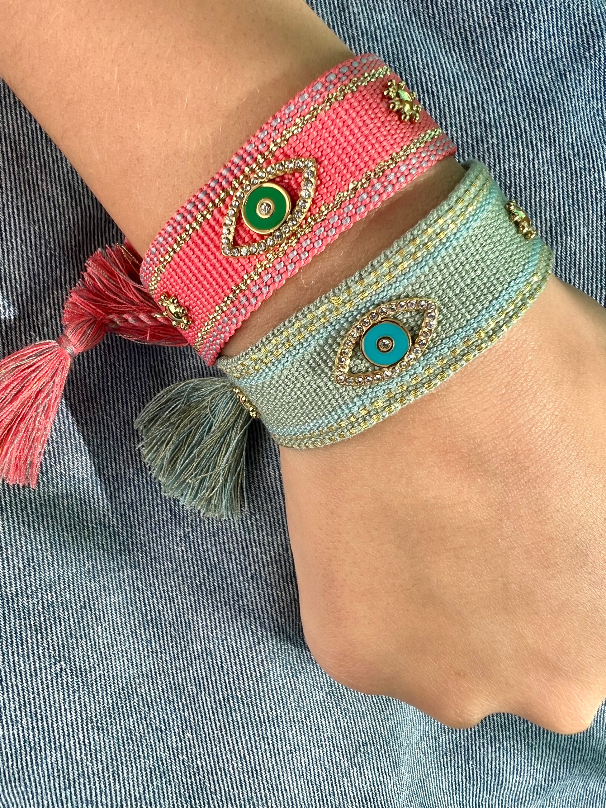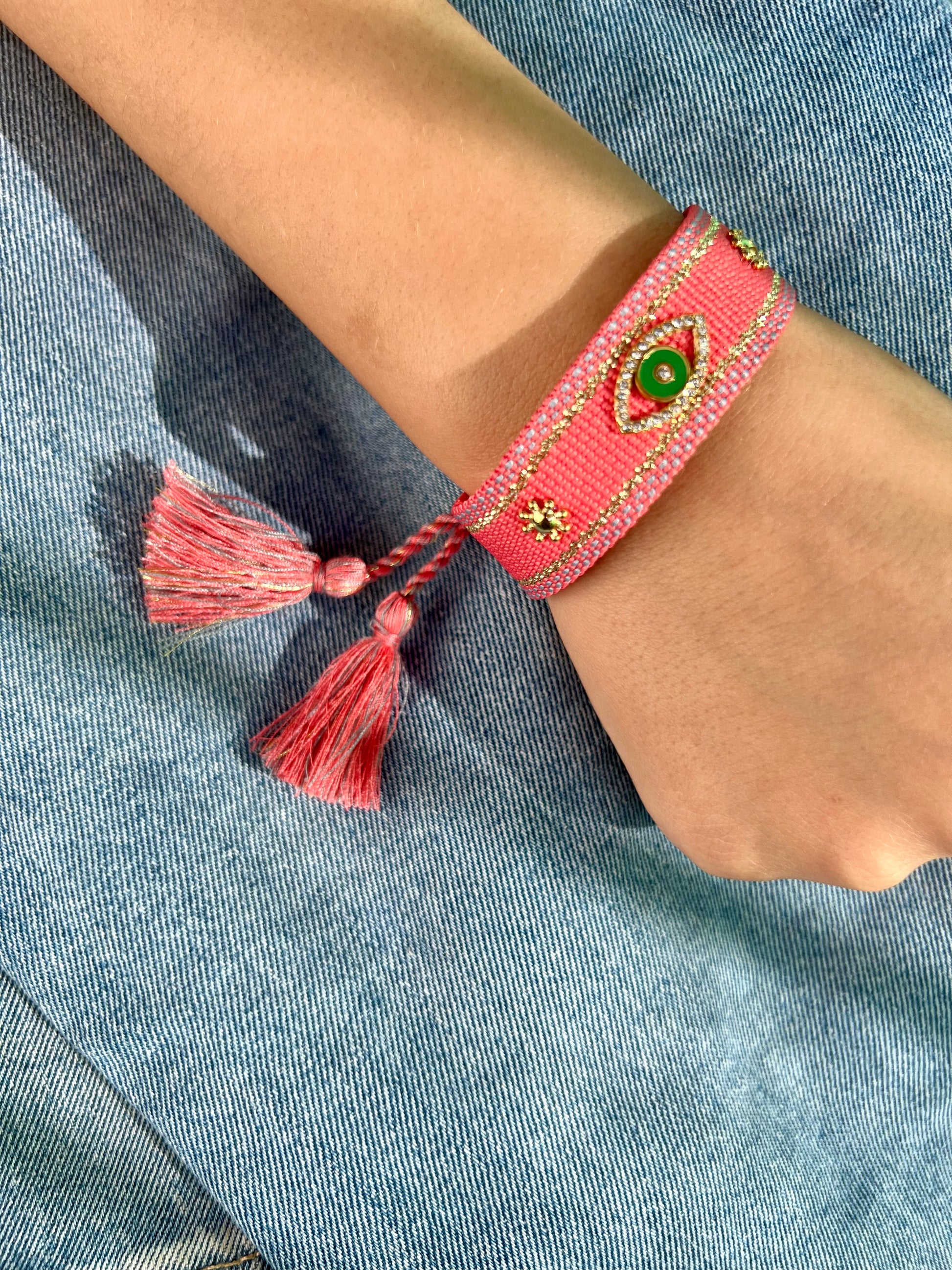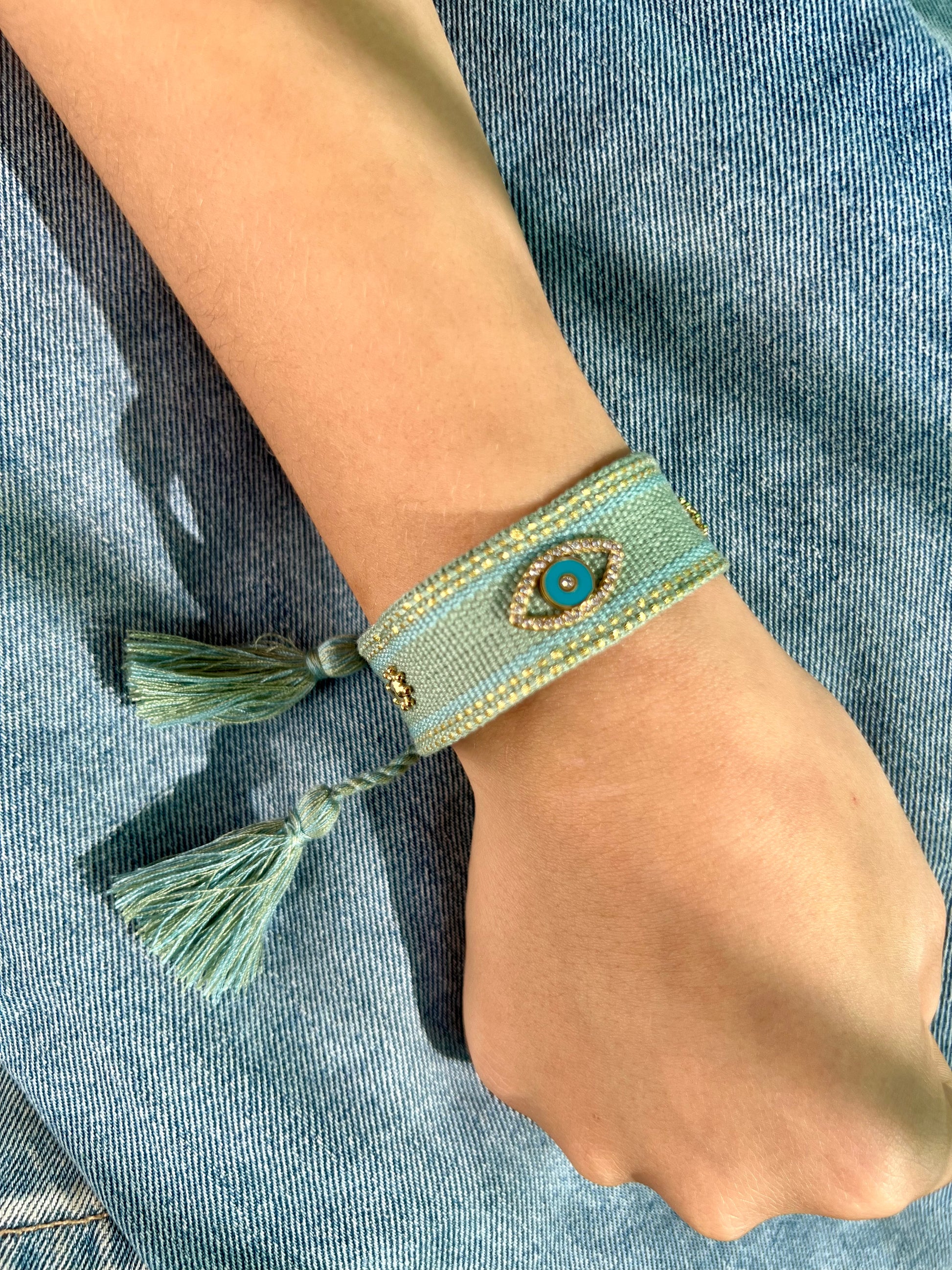 ✧ Bracelet en tissu composé de pièces (oeil et étoile) en acier inoxydable ornées d'oxydes de zirconium.