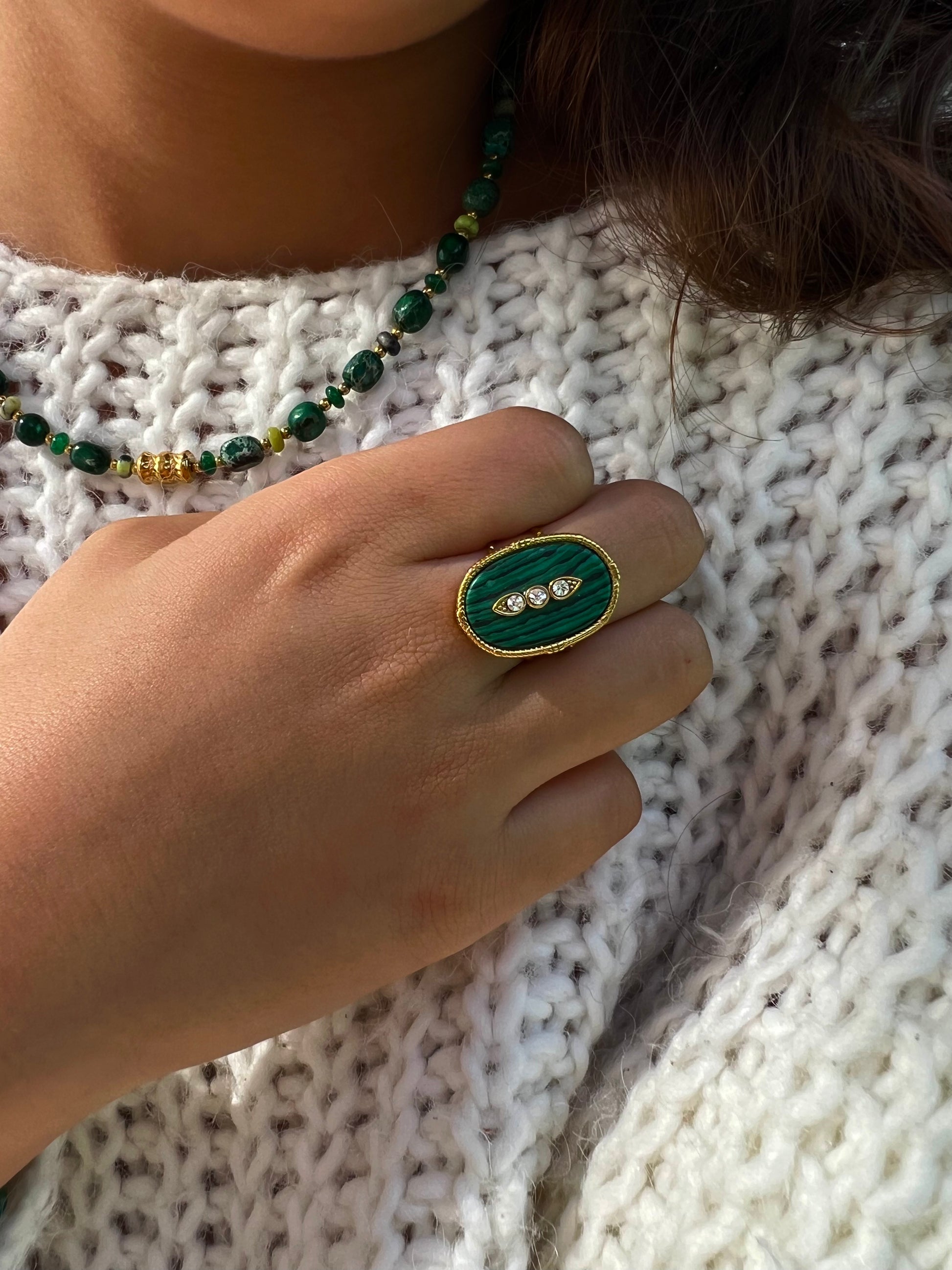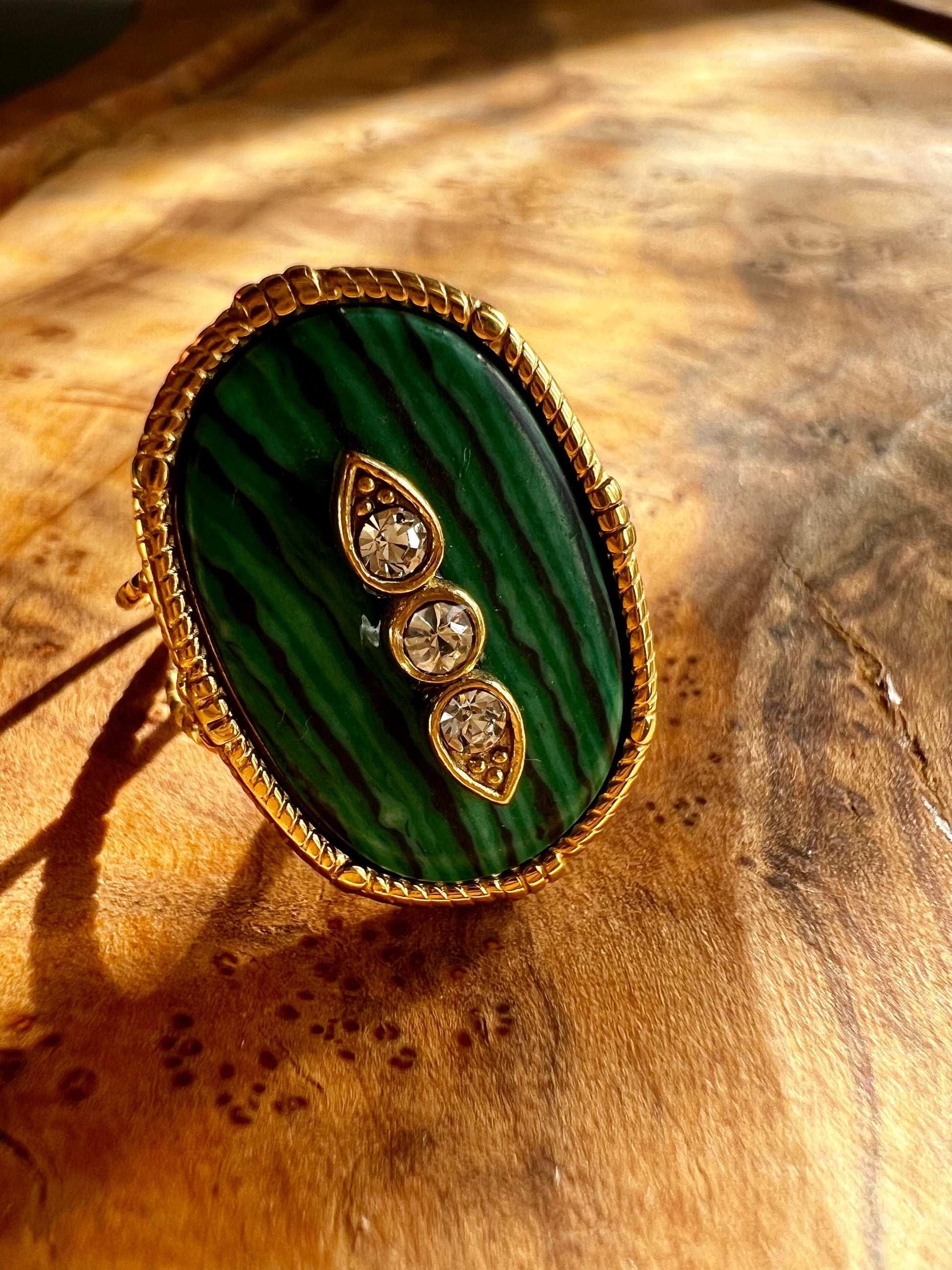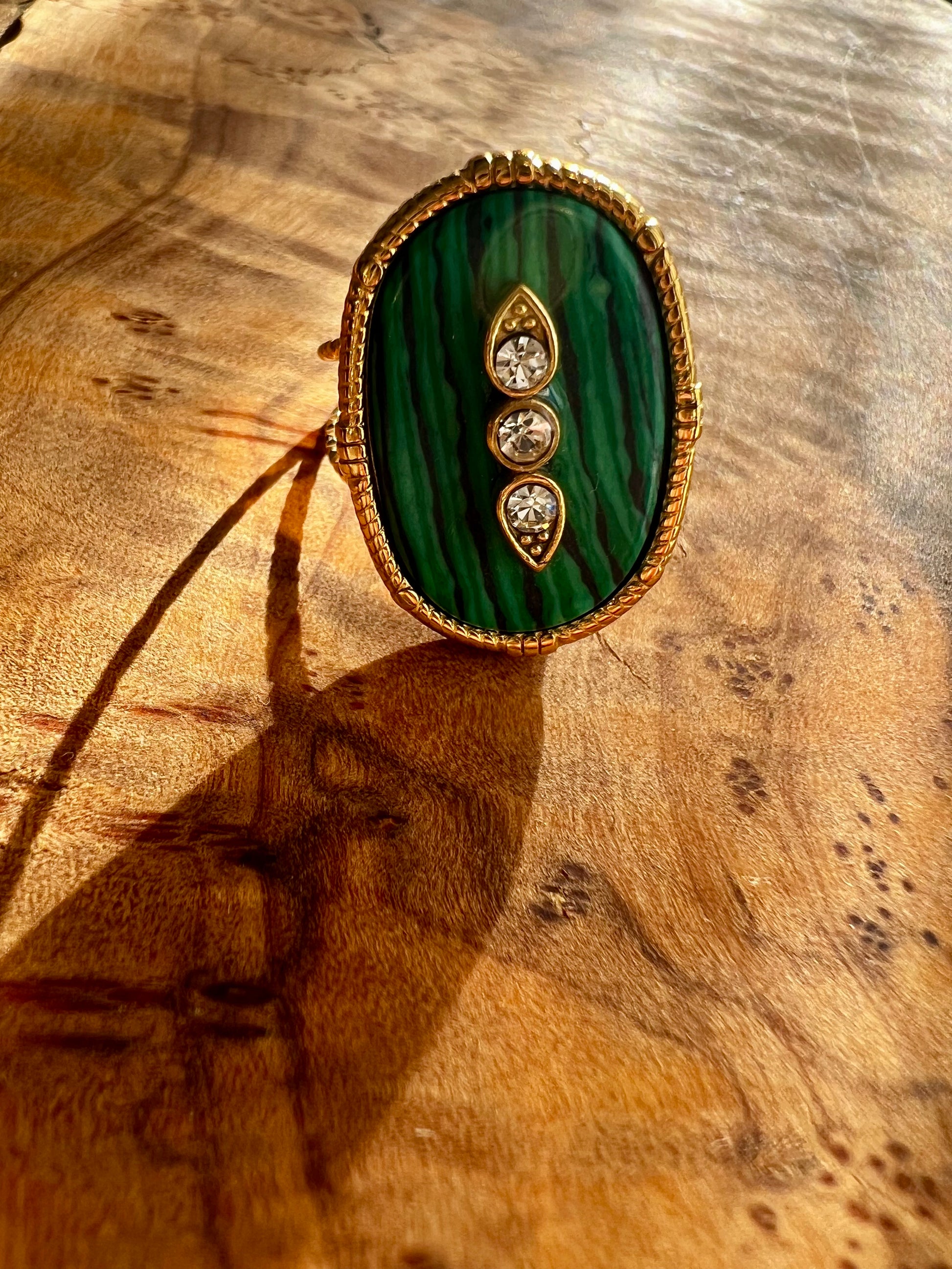 ✧ Bague dorée en acier inoxydable, malachite et oxyde de zirconium.