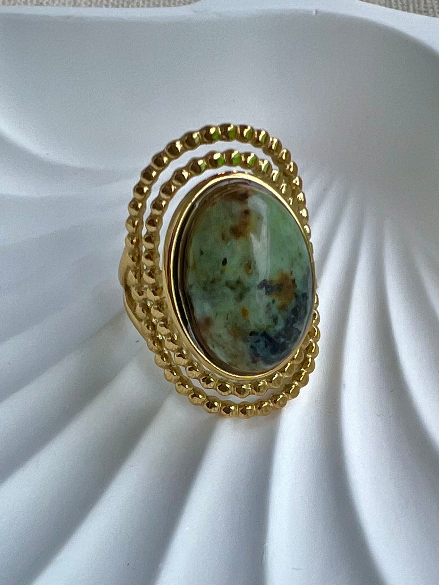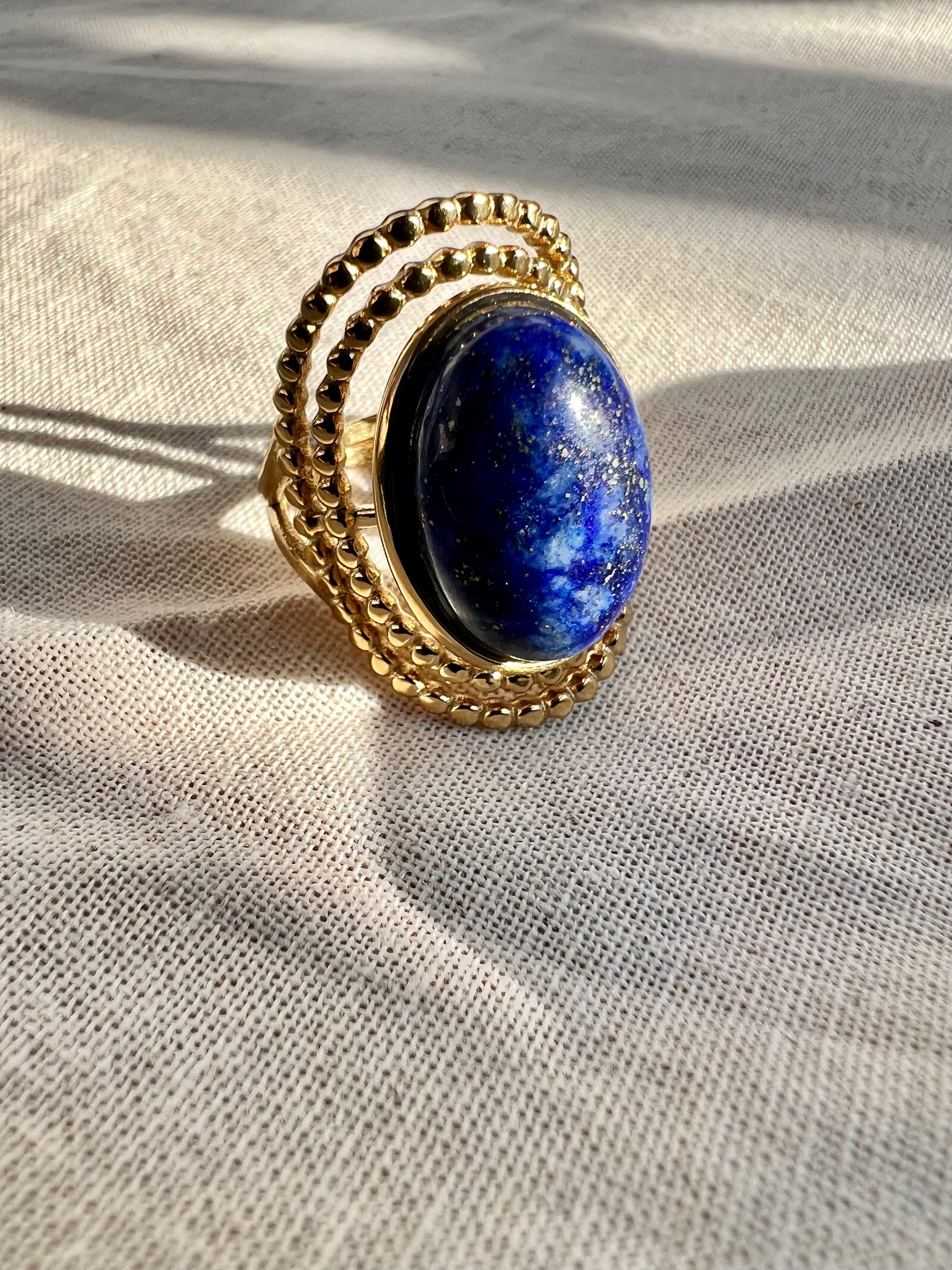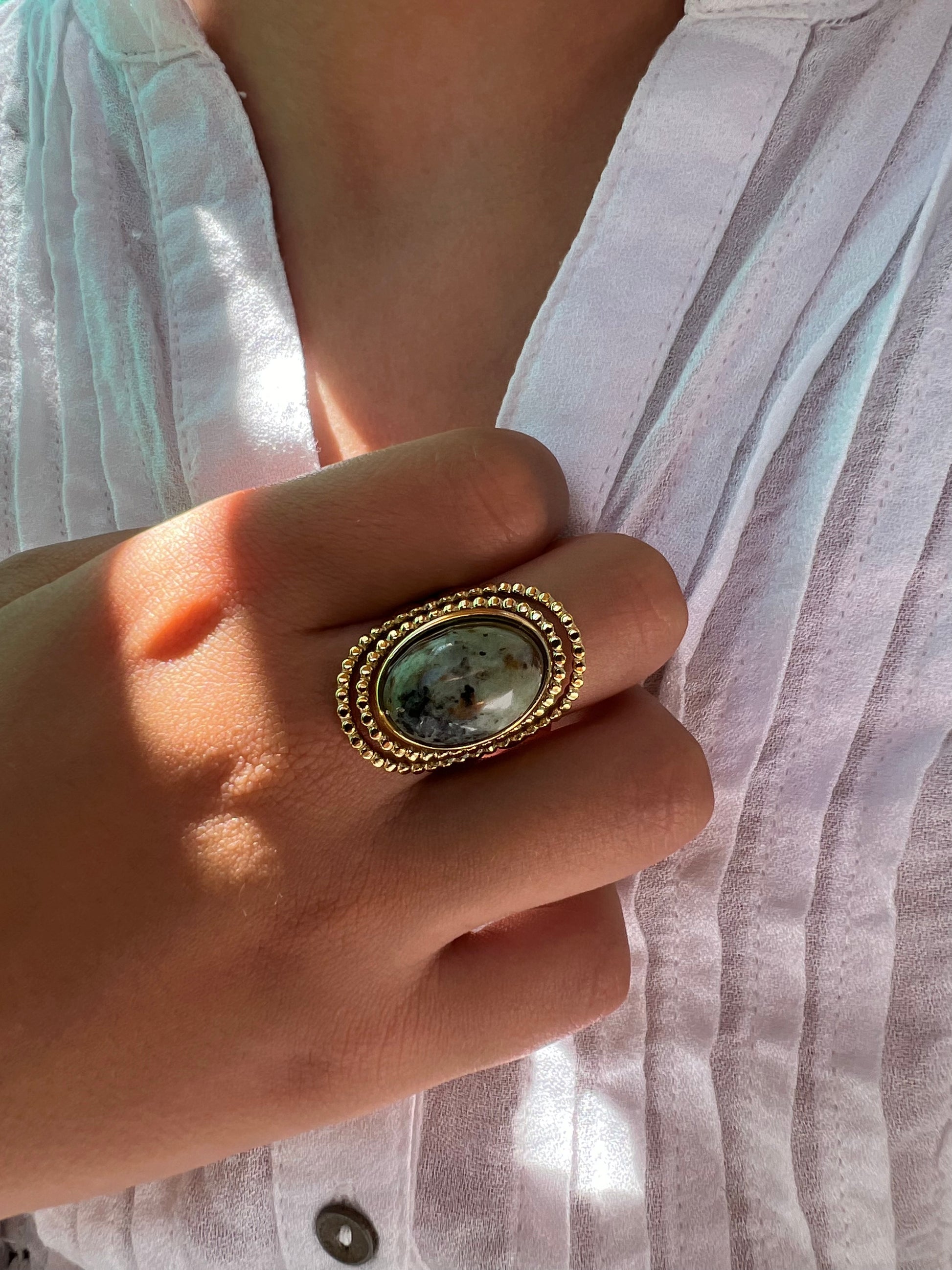 Disponible en nacre, turquoise africaine ou lapis lazuli, cette bague est une pièce forte qui allie caractère et élégance.
