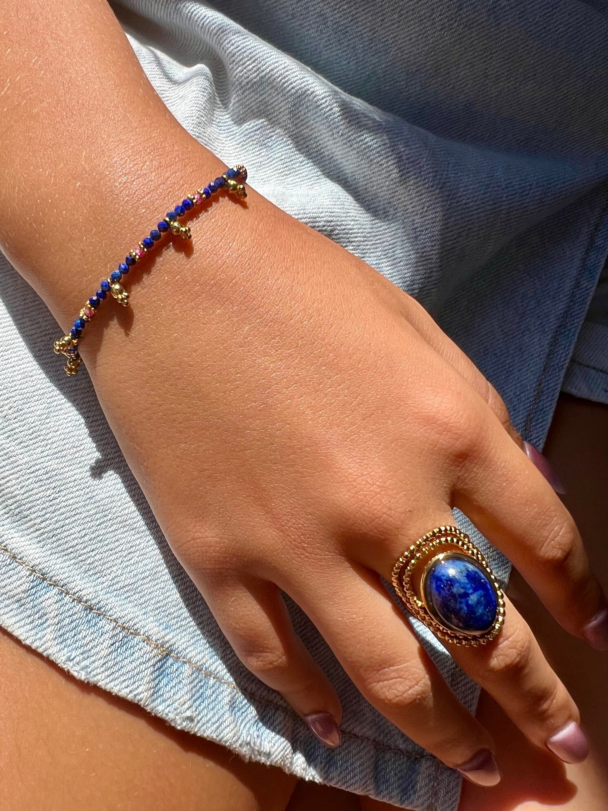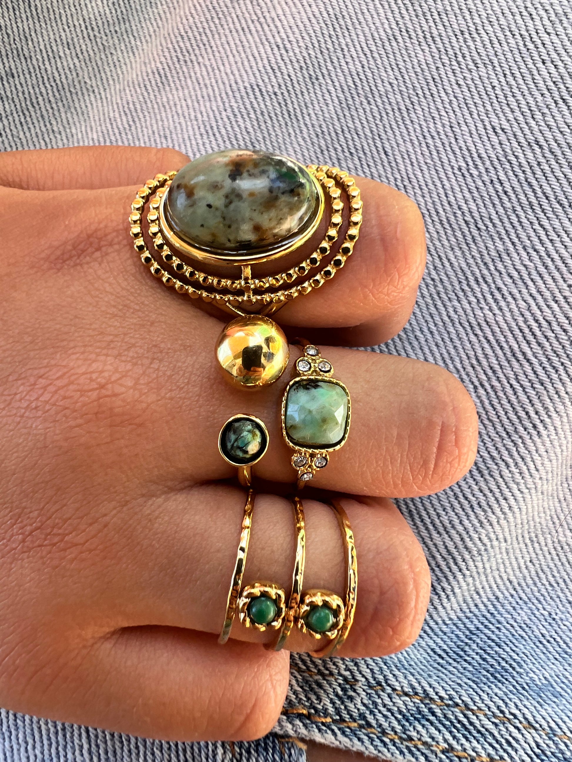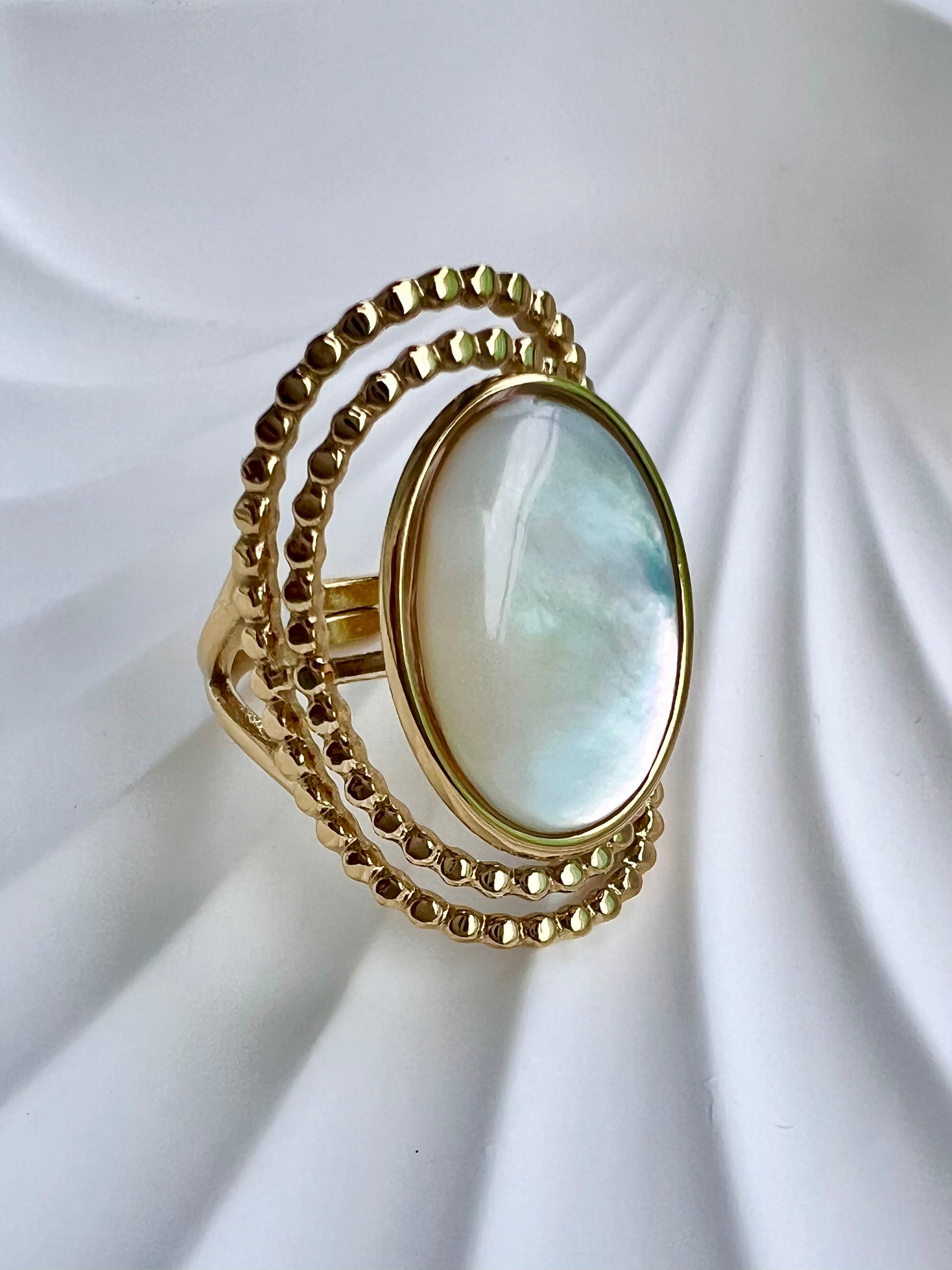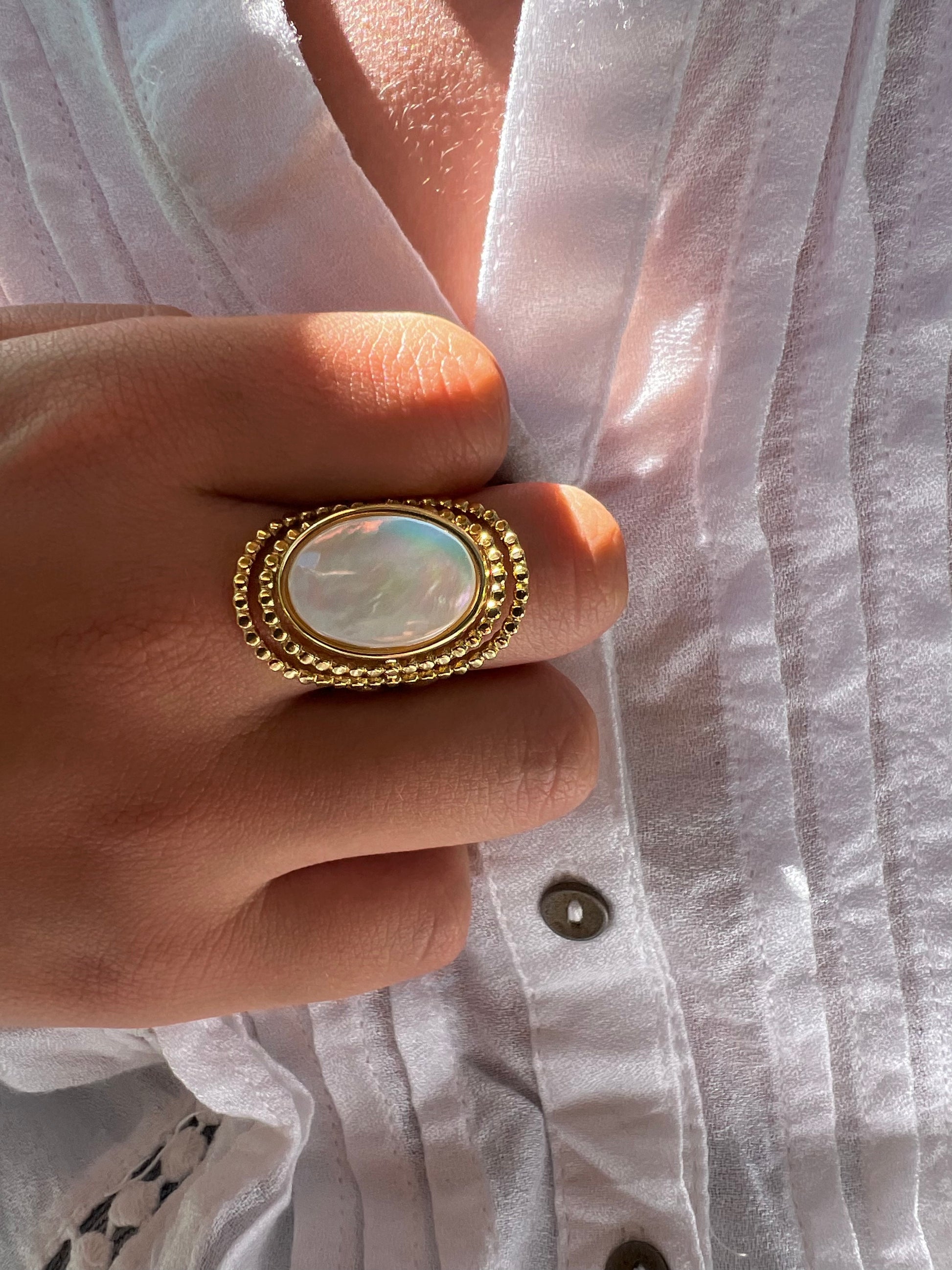 Disponible en nacre, turquoise africaine ou lapis lazuli, cette bague est une pièce forte qui allie caractère et élégance.