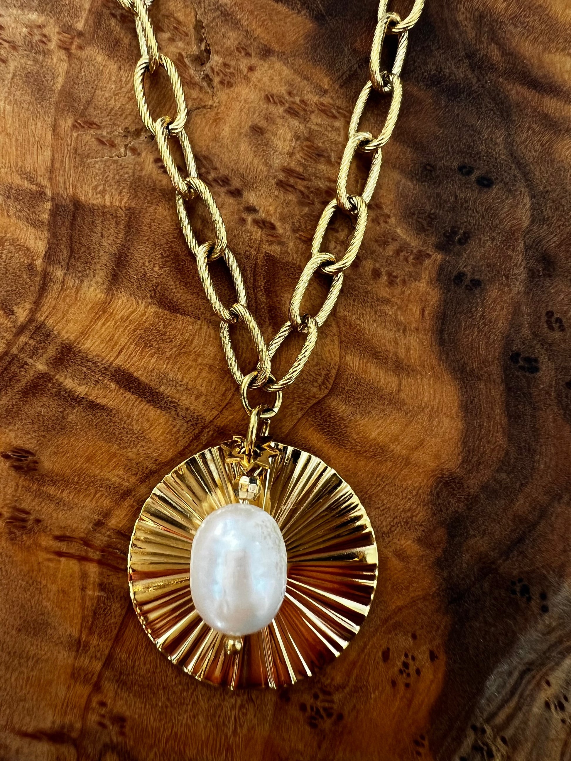 ✧ Collier en acier inoxydable, pampille texturée et perle d'eau douce.