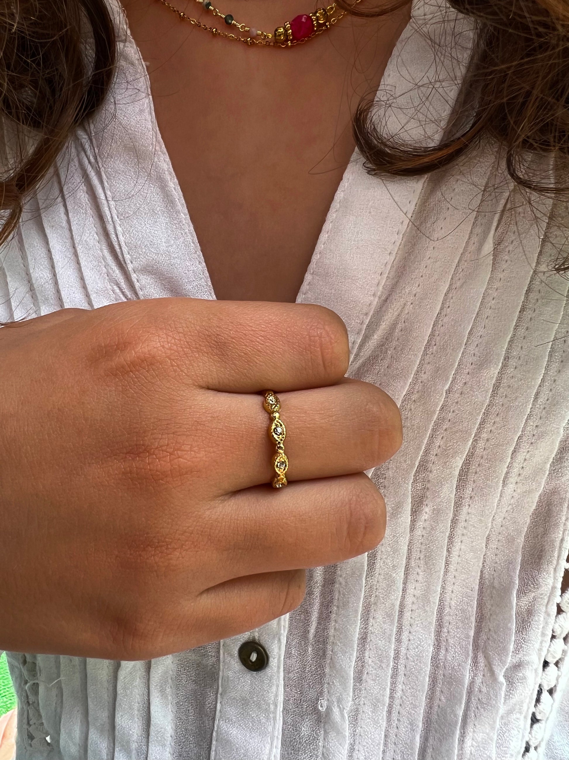 Craquez pour cette bague fine ornée d'oxydes de zirconium scintillants ✨. Son design délicat habille la main avec élégance. Conçue en acier inoxydable, elle est dorée, ajustable, hypoallergénique et résistante à l'eau 💧, parfaite au quotidien comme pour les grandes occasions.