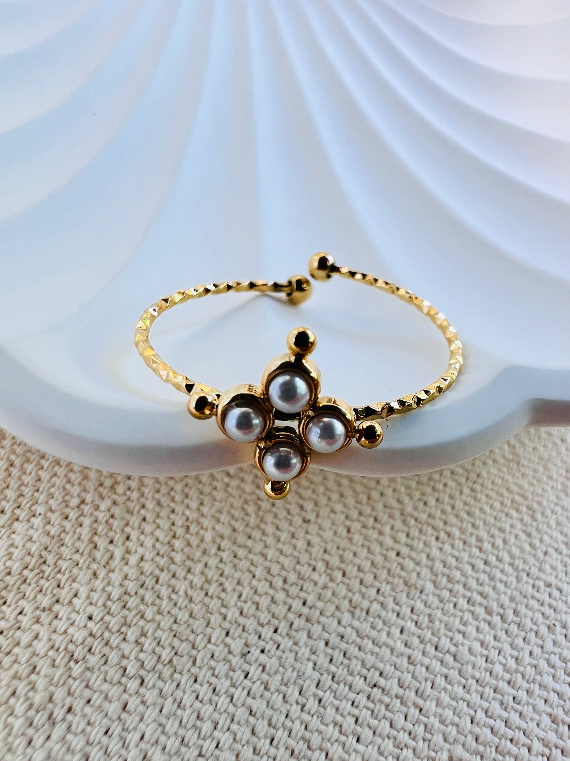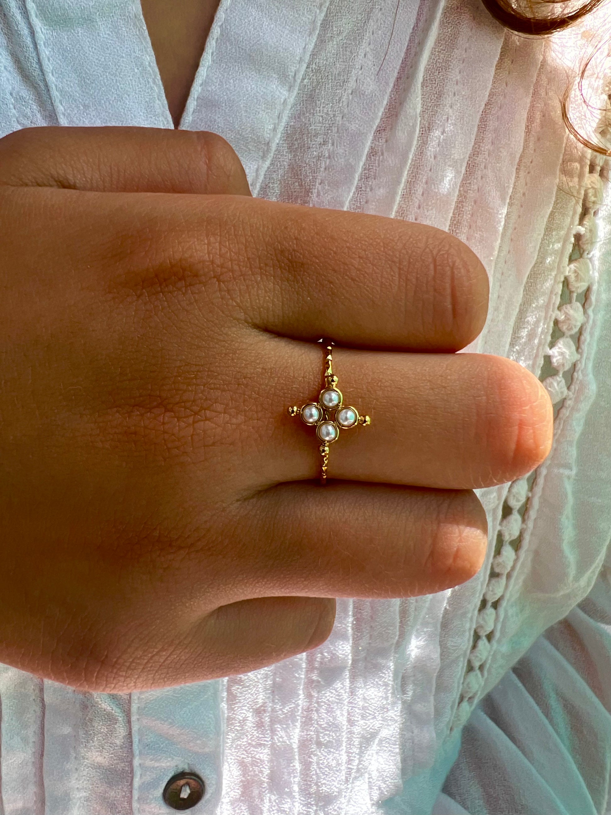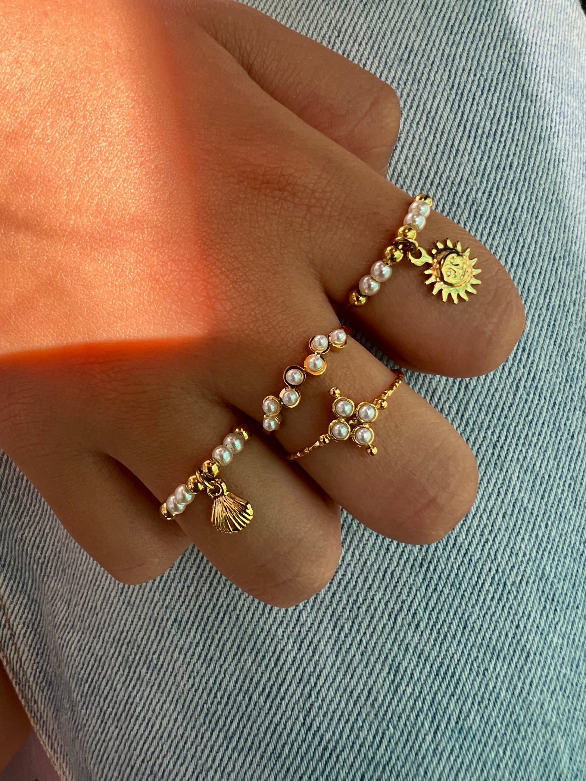 La bague PERLE, fine et minimaliste, cette bague en acier inoxydable doré adopte une délicate forme d’étoile, ornée de petites perles en acrylique blanches.