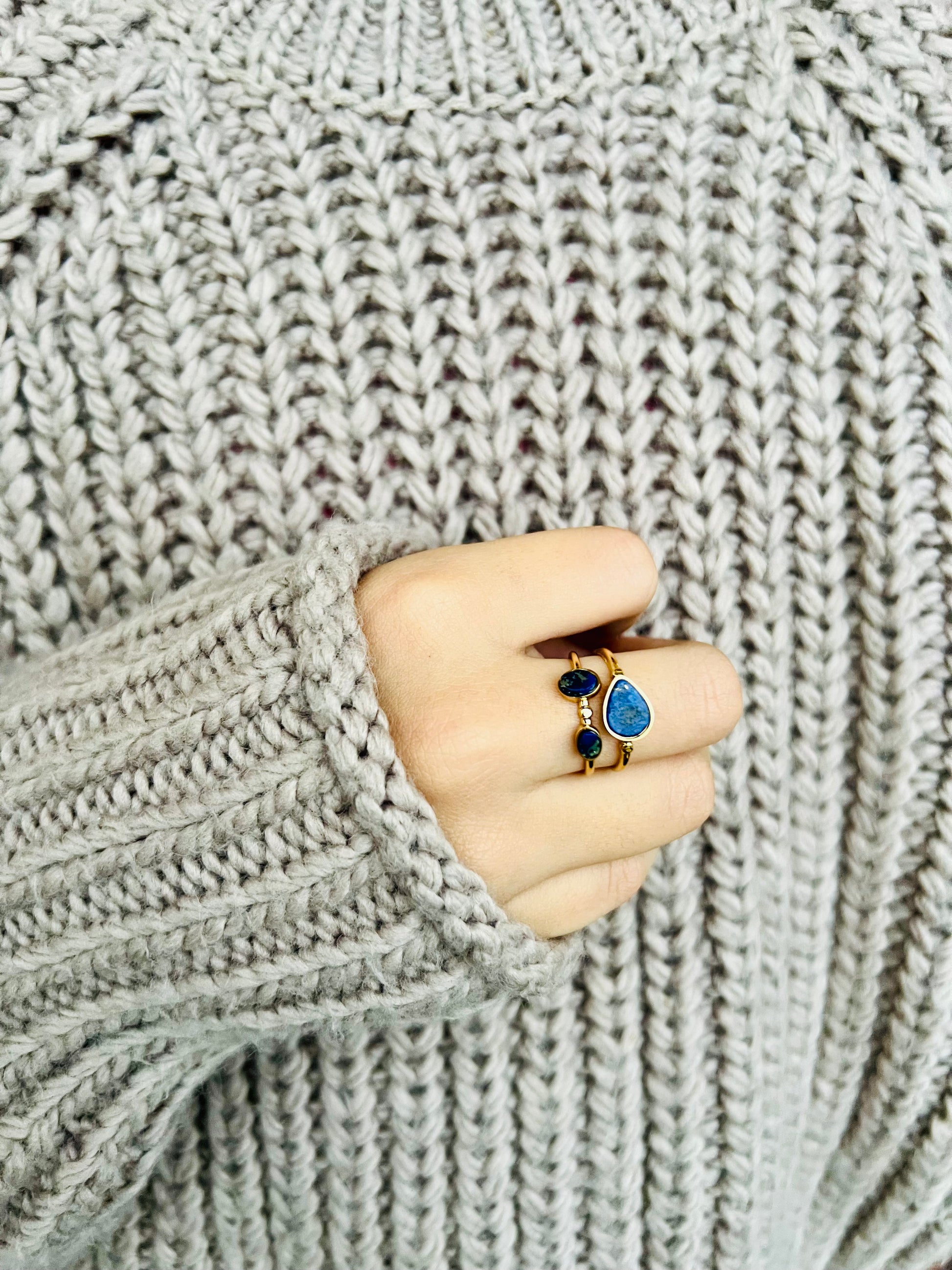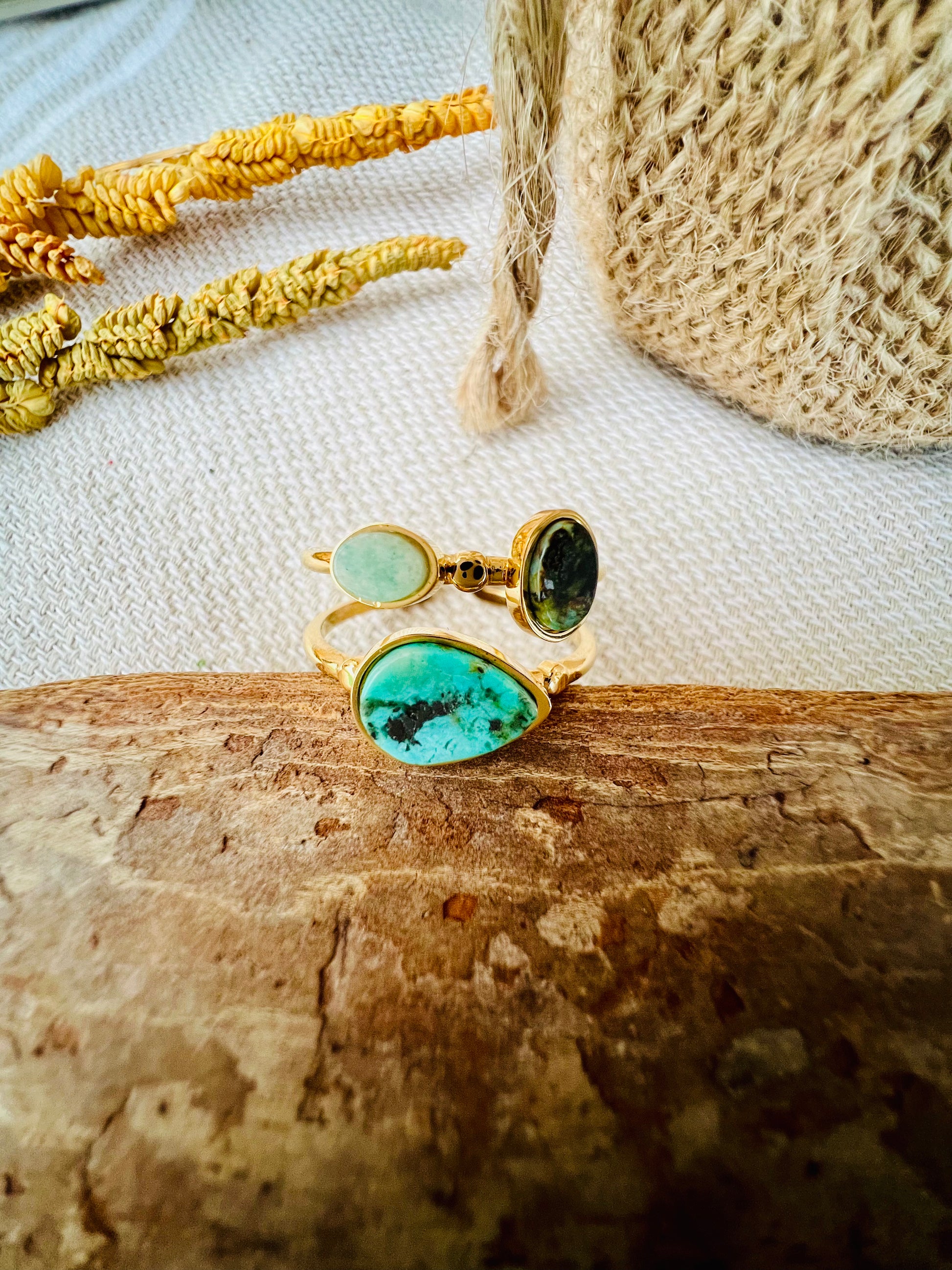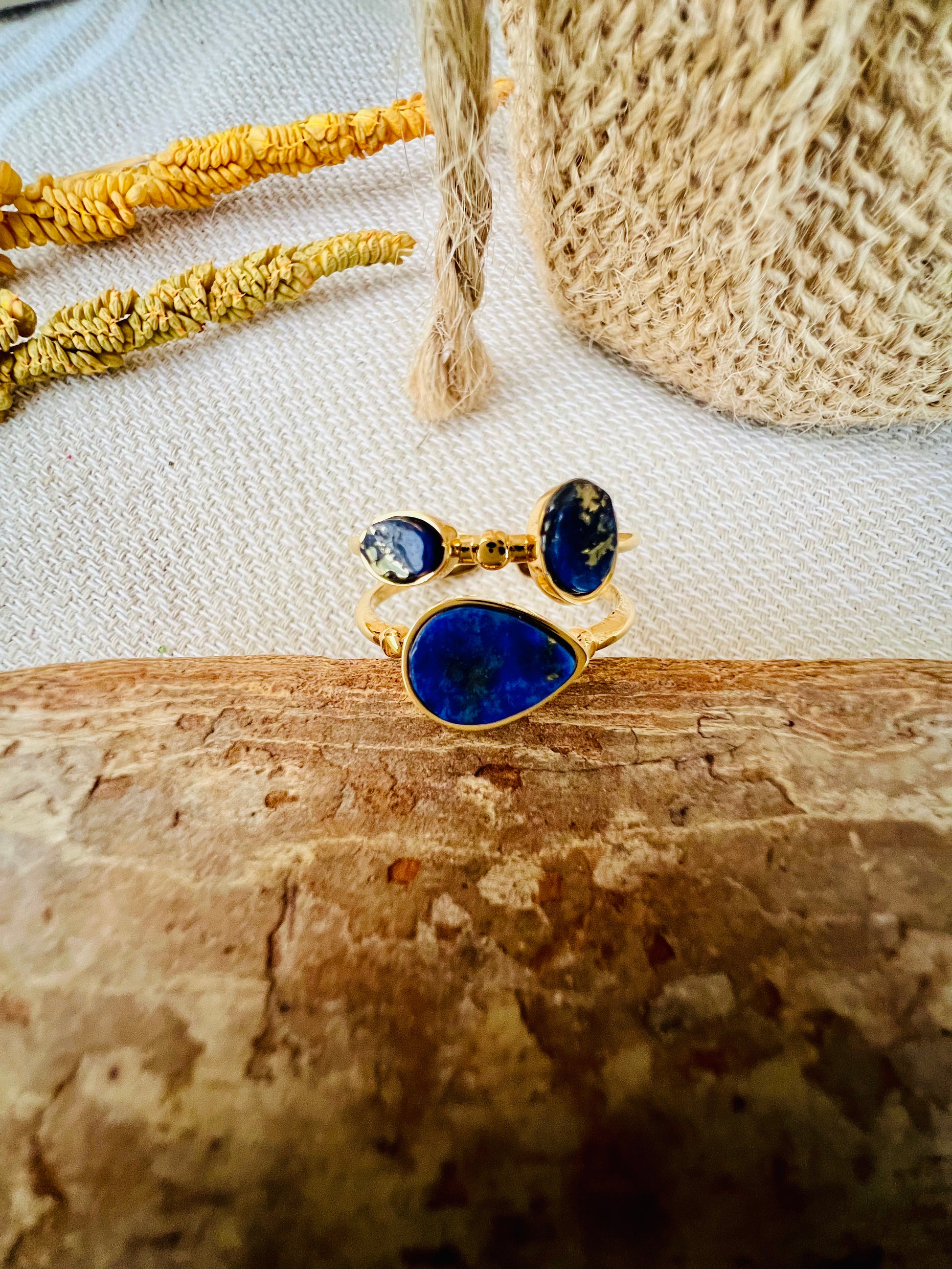 La bague contemporaine PRIYA à deux rangs met en valeur la beauté de la turquoise africaine, du lapis lazuli et de la nacre blanche, offrant une élégance subtile et un charme unique. Un bijou parfait pour rehausser votre style au quotidien.