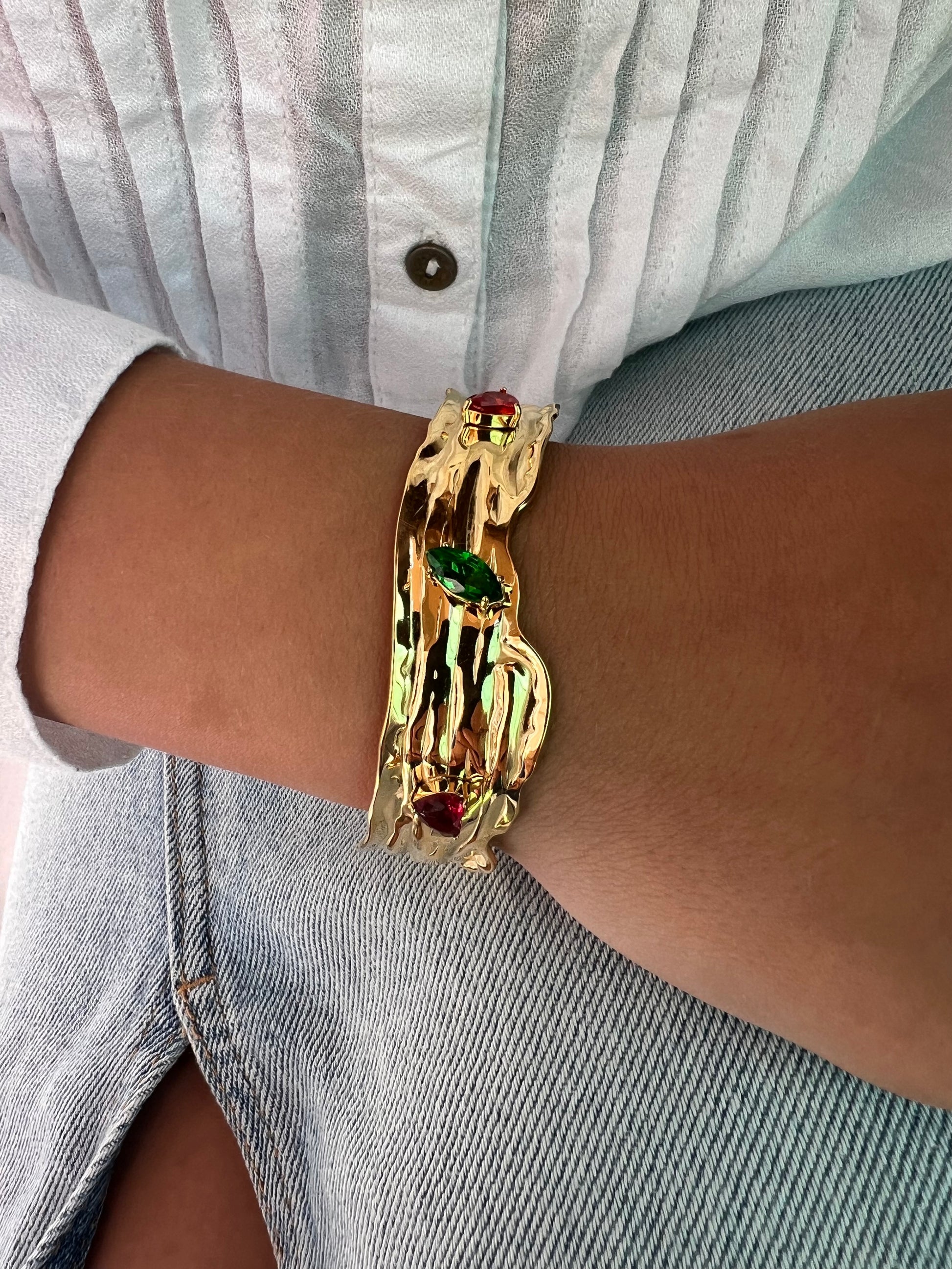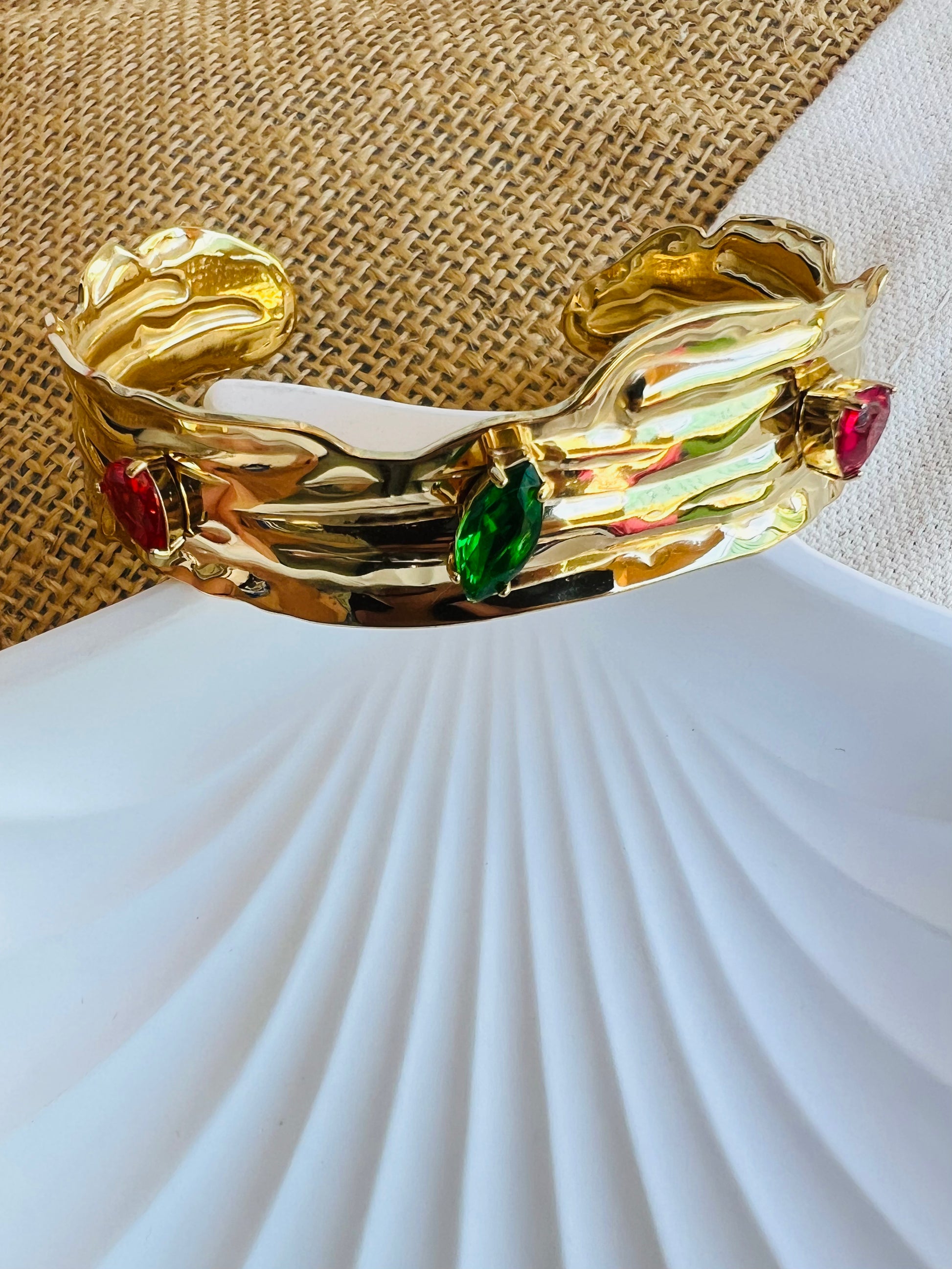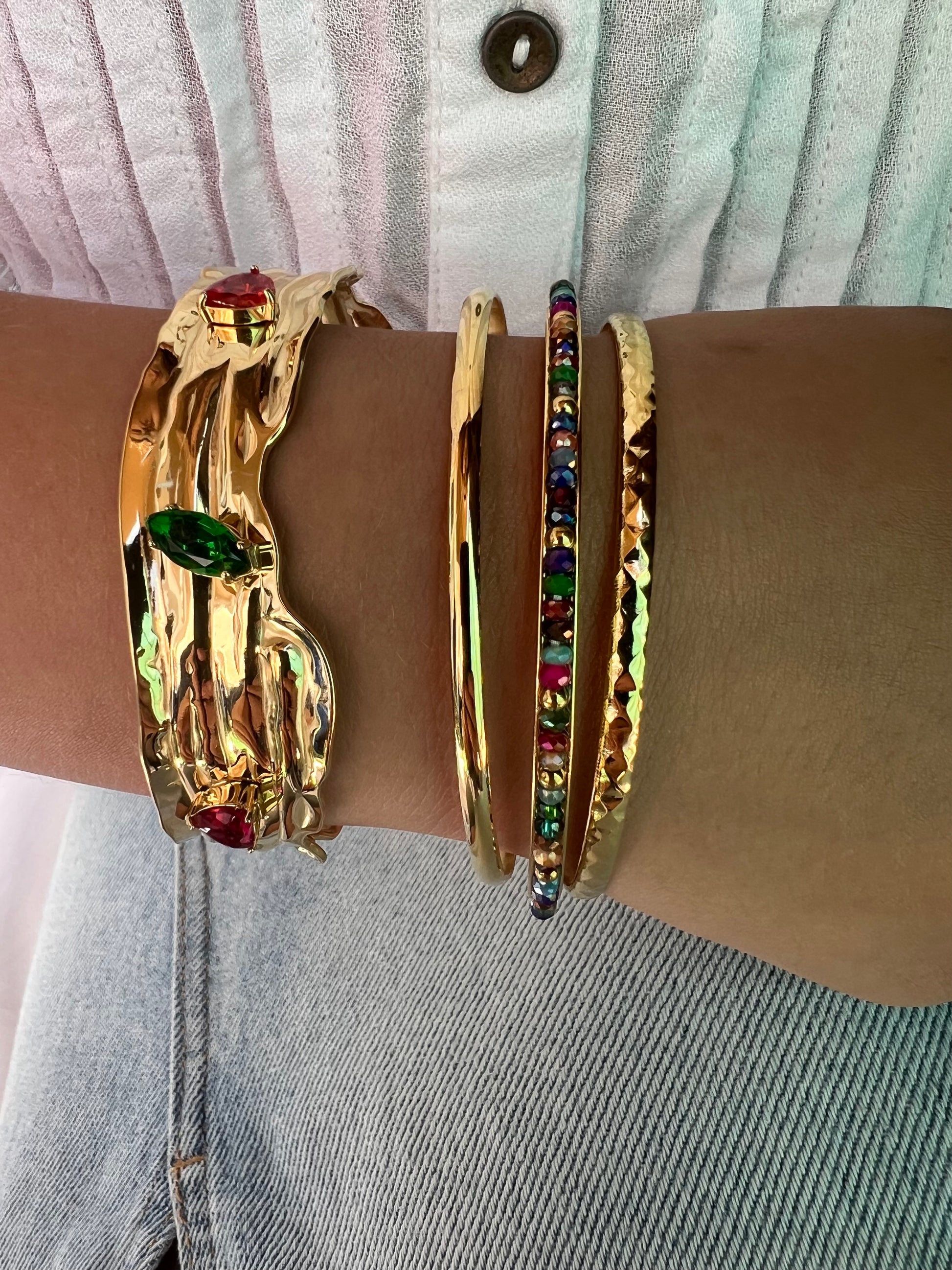 ✧ Bracelet type jonc large ondulé et texturé en acier inoxydable doré parcouru de trois cristaux (forme goutte, coeur et navette)