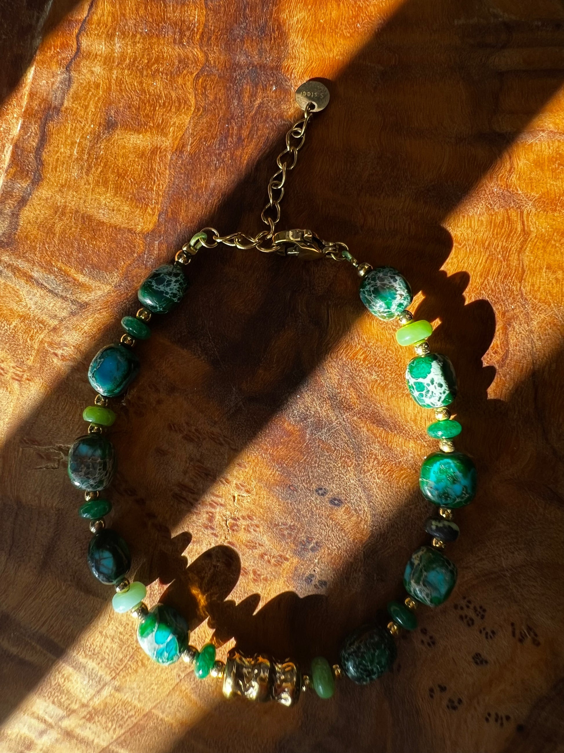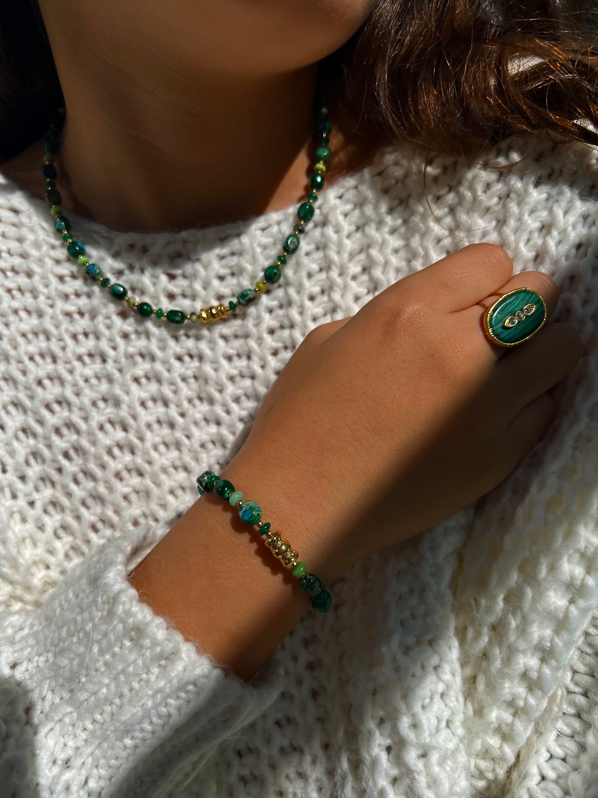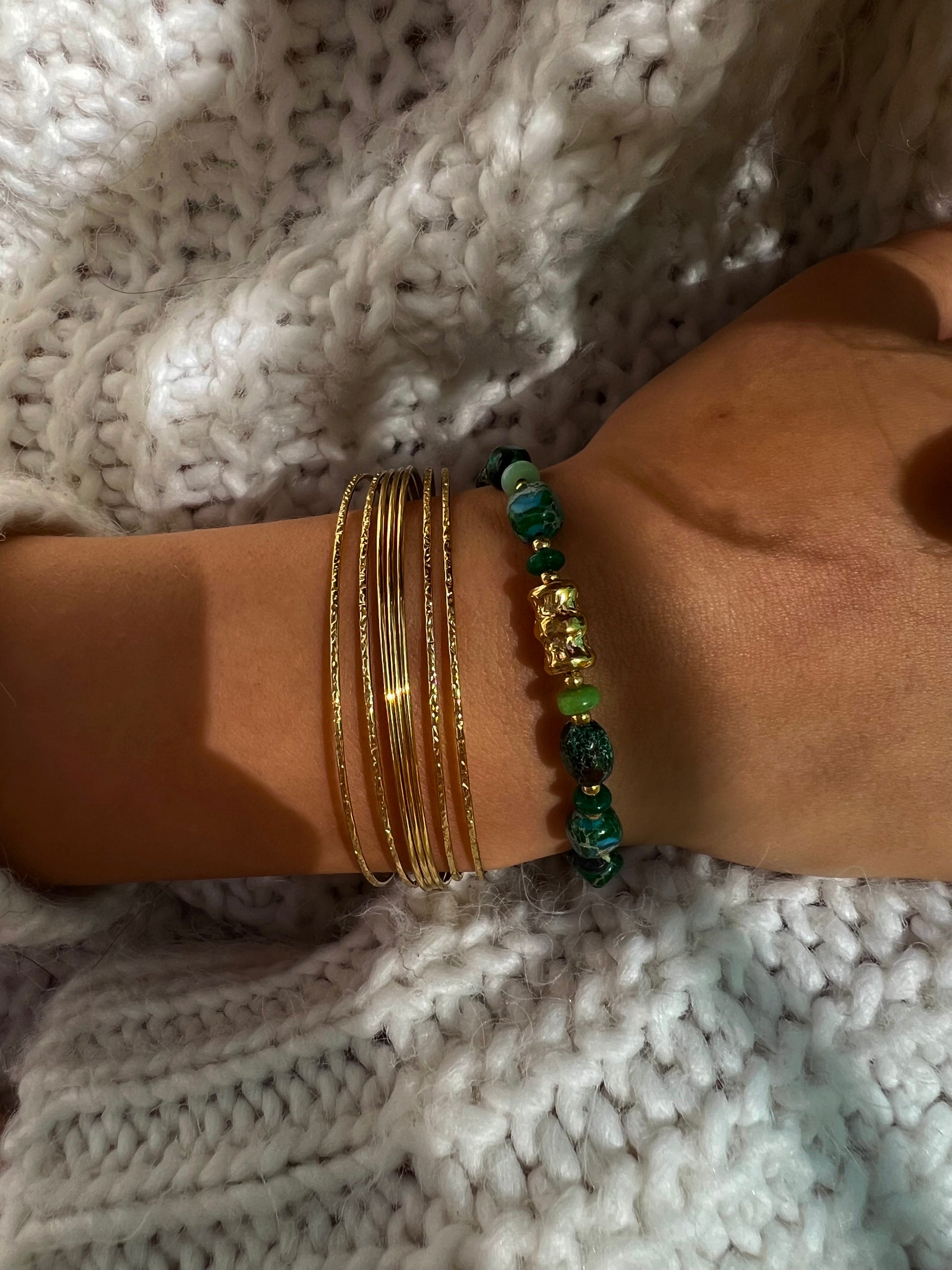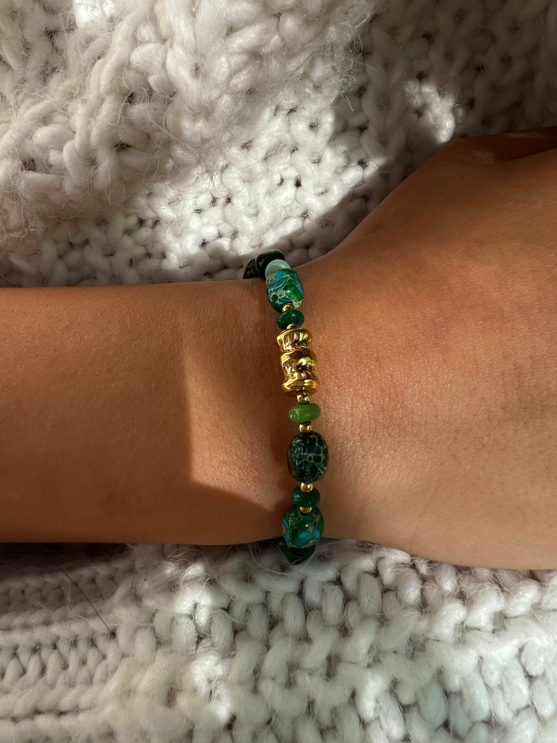 ✧ Bracelet doré en acier inoxydable et pierres naturelles vertes.