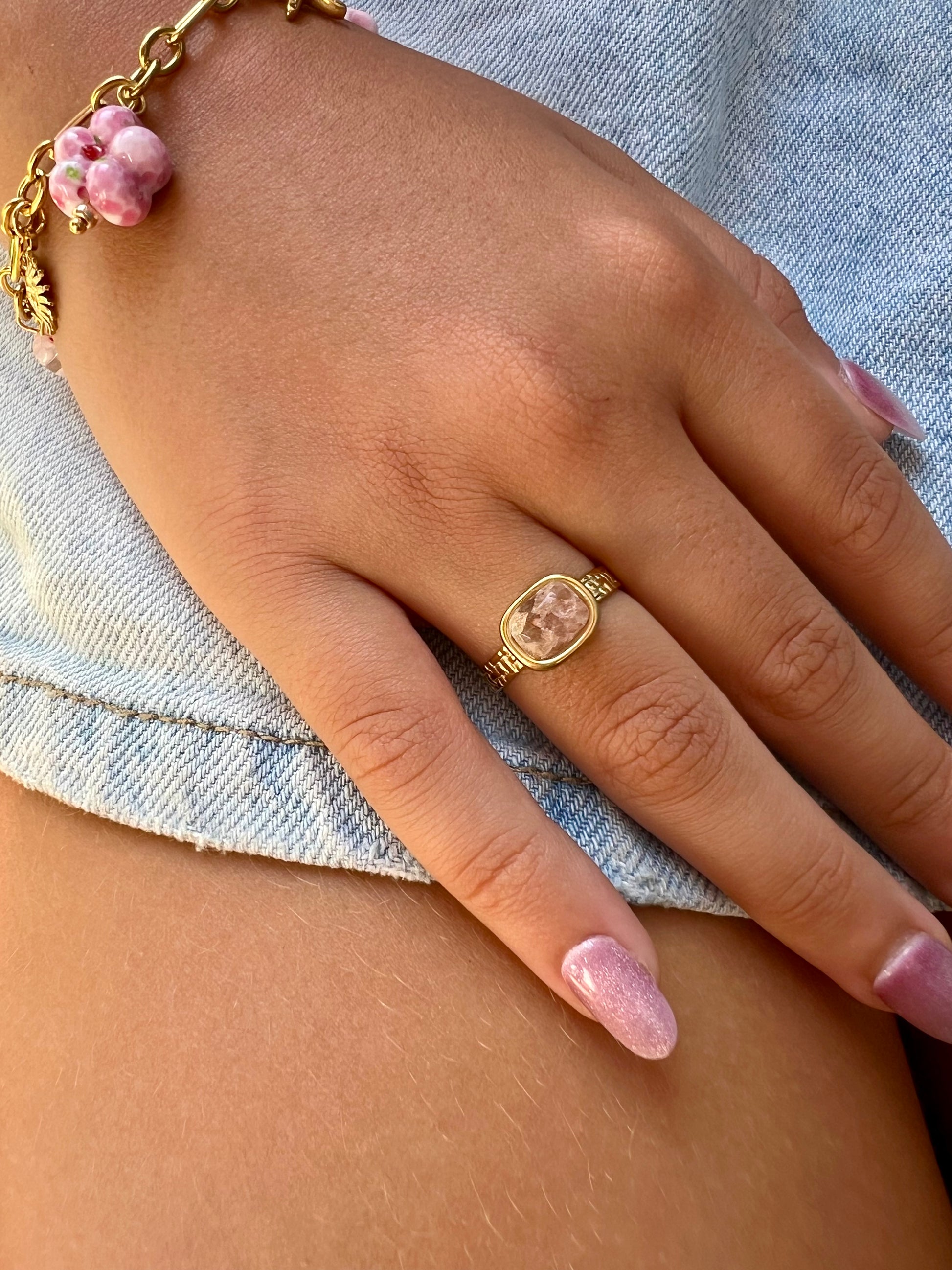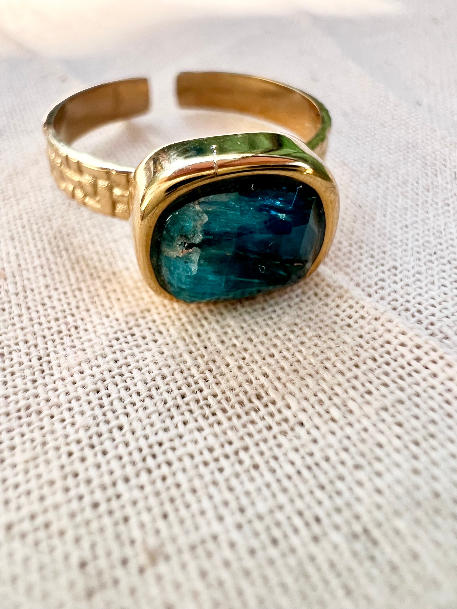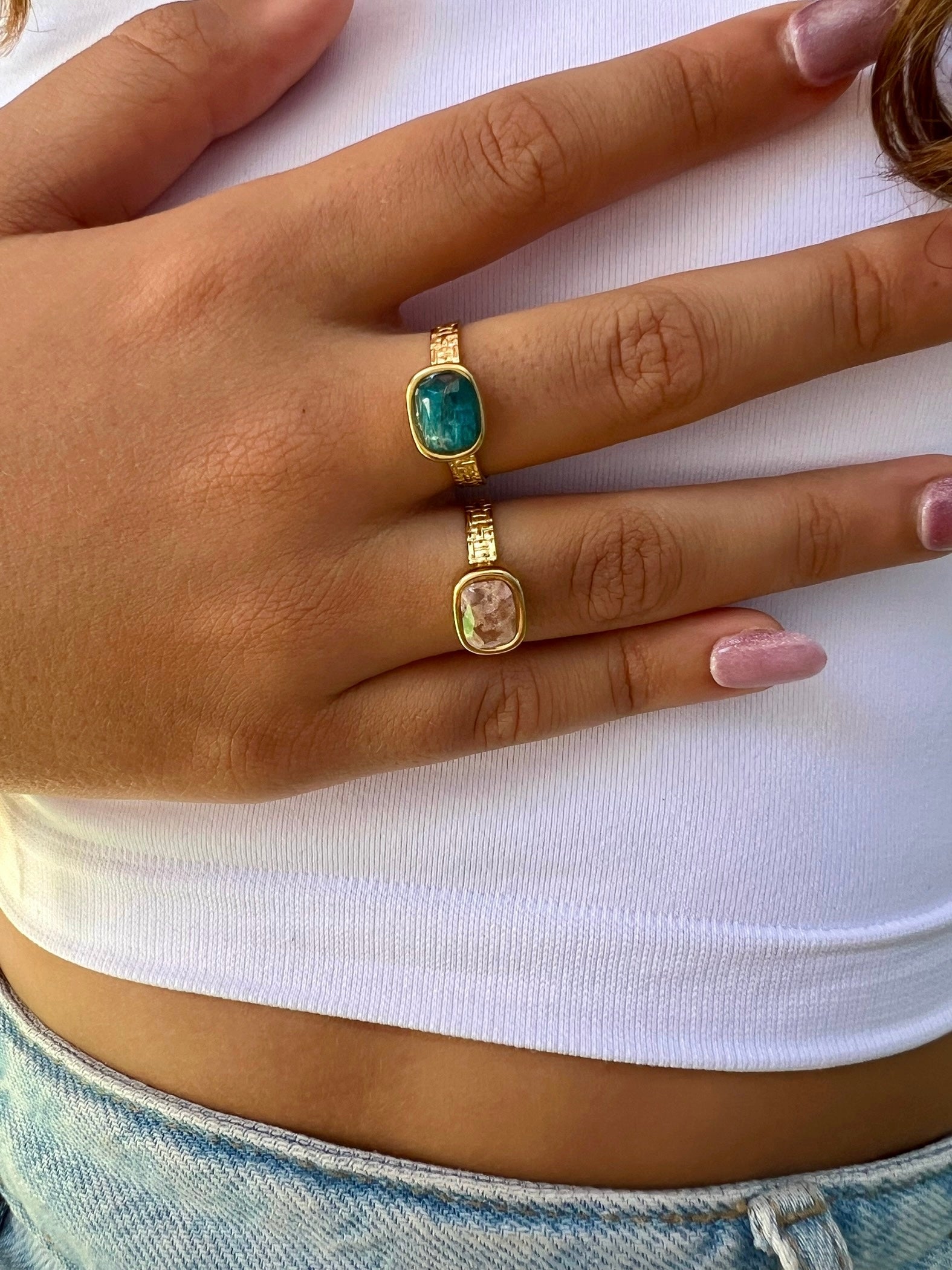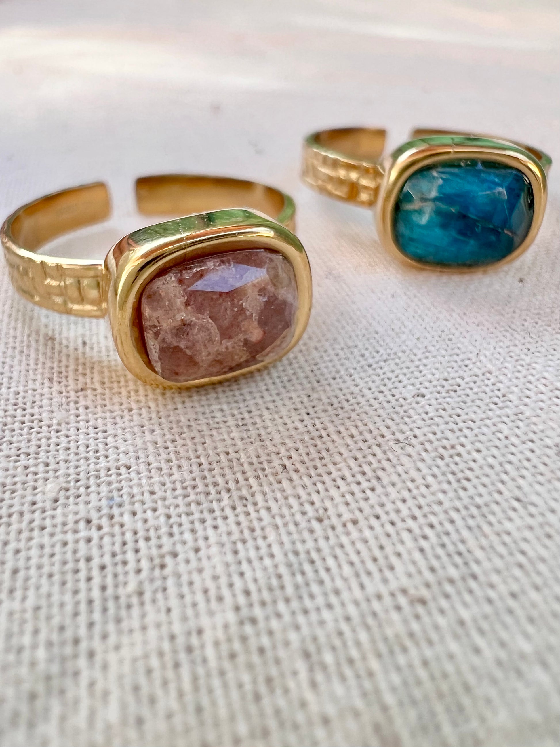 Élégante et intemporelle, la bague Sabrina se distingue par sa pierre rectangulaire naturelle en quartz fraise ou apatite bleue 💠.