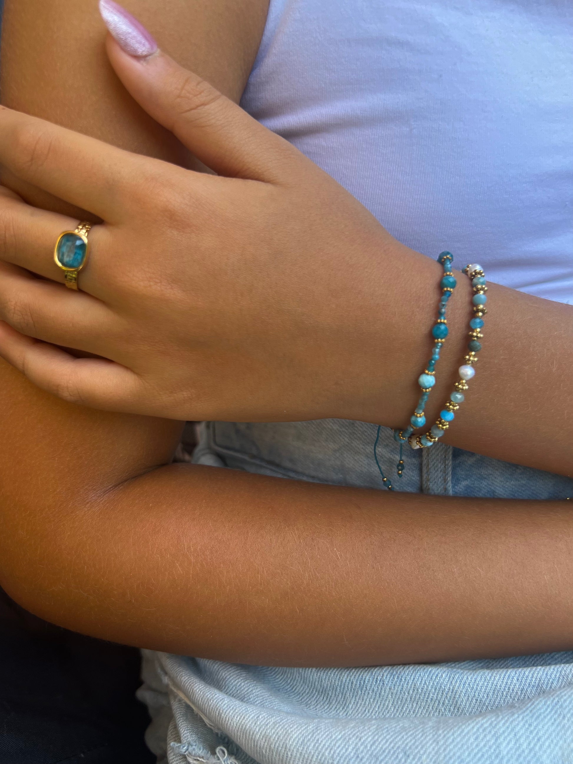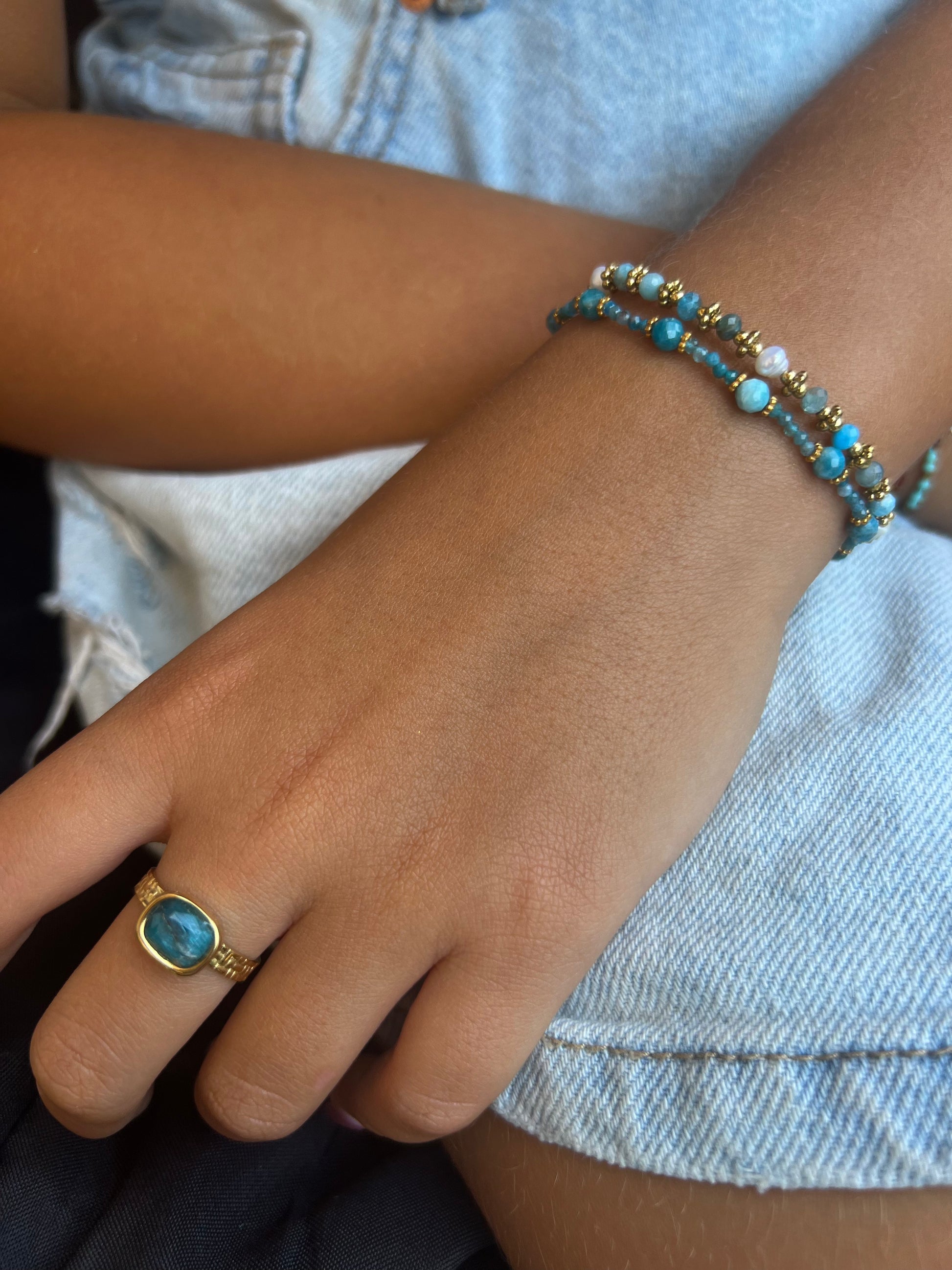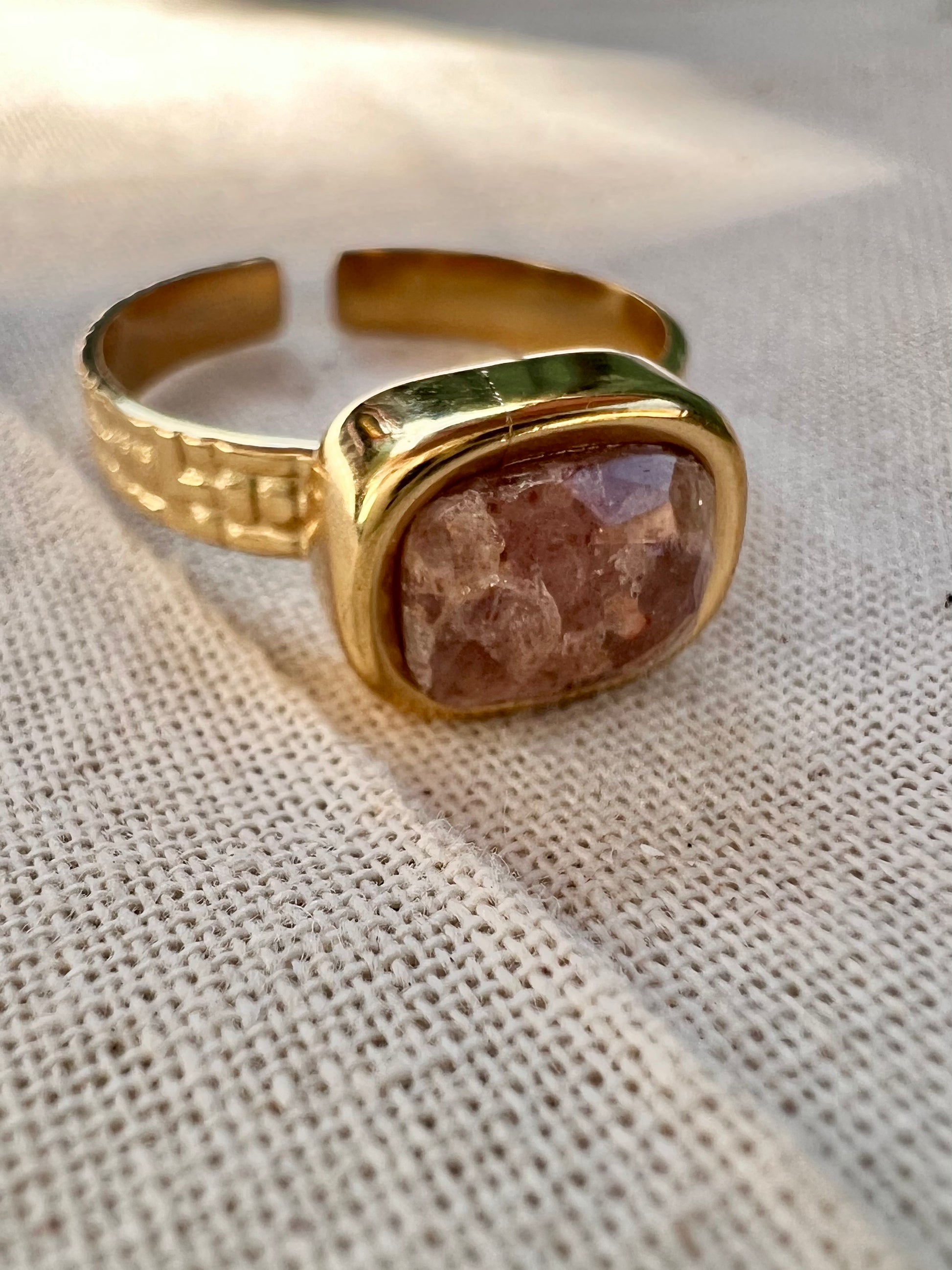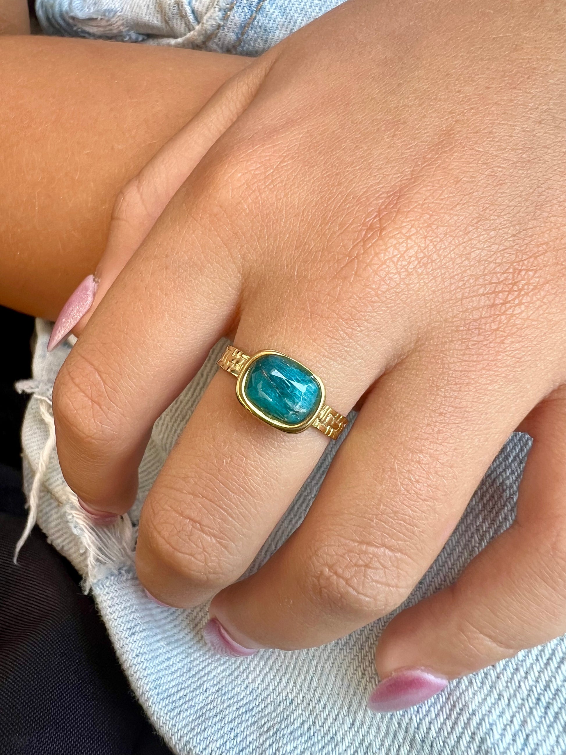 Élégante et intemporelle, la bague Sabrina se distingue par sa pierre rectangulaire naturelle en quartz fraise ou apatite bleue 💠.