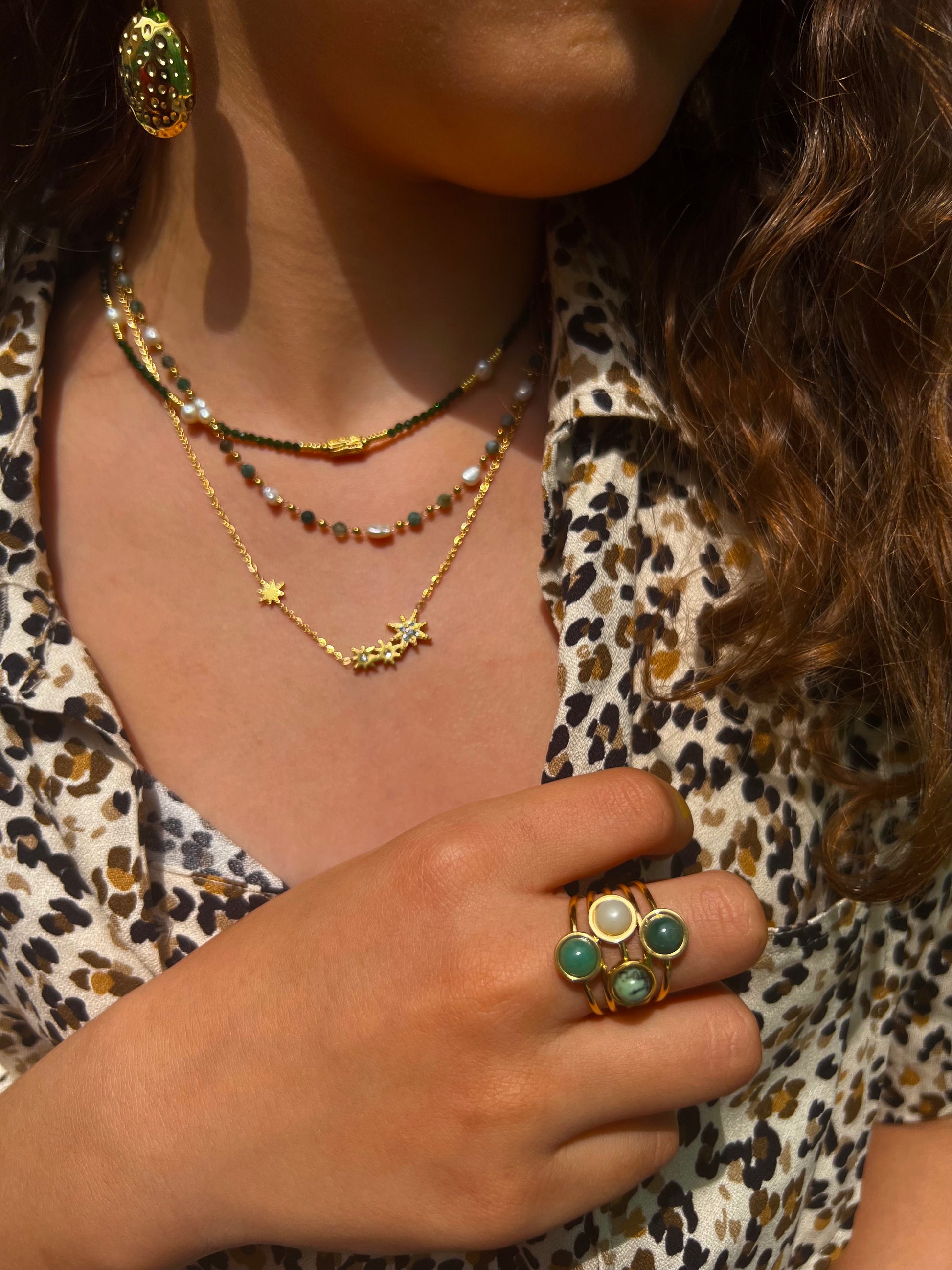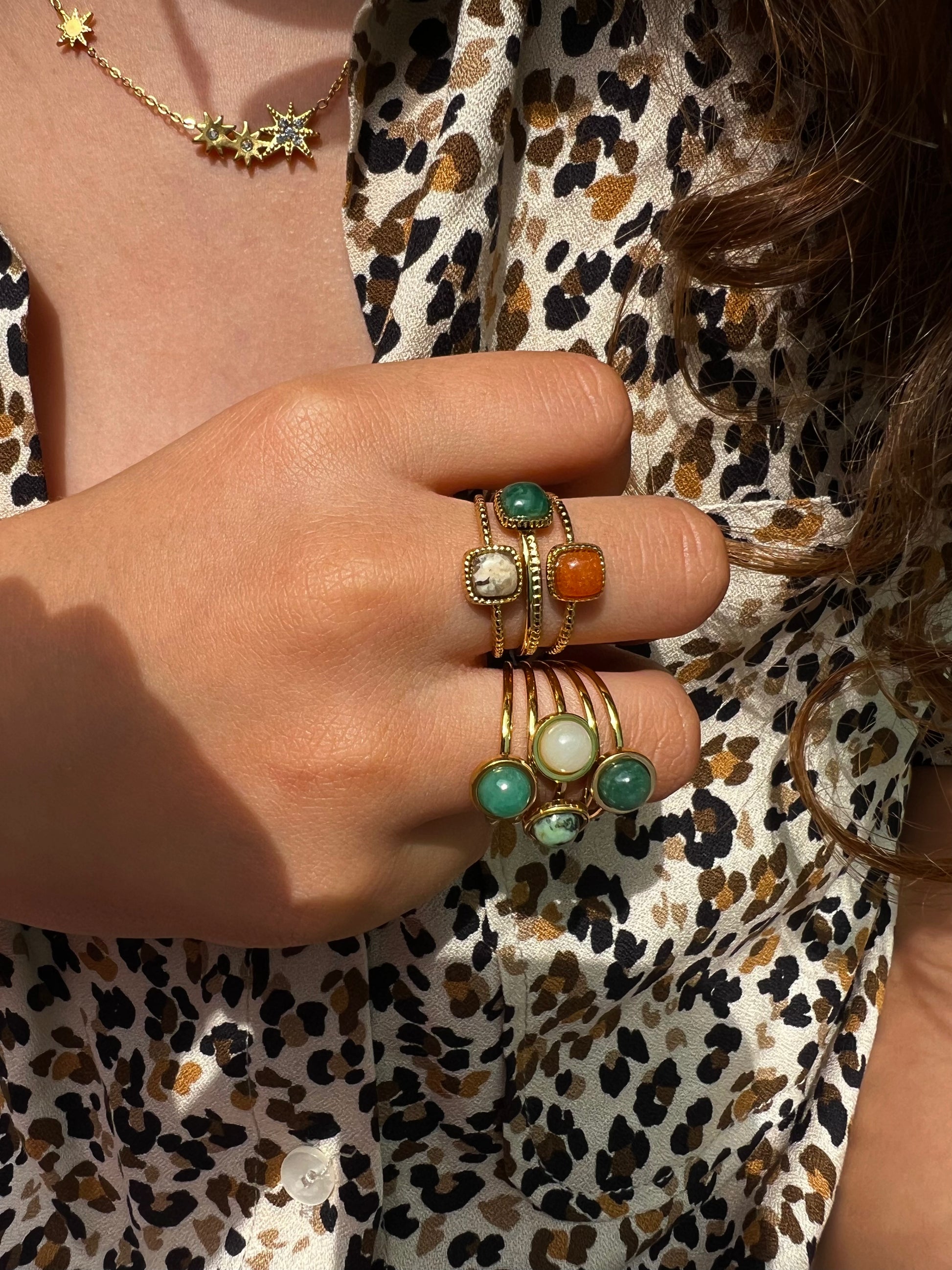 ✧ Bague dorée en acier inoxydable constituée de 5 lignes et 4 cabochons ronds en turquoise africaine.