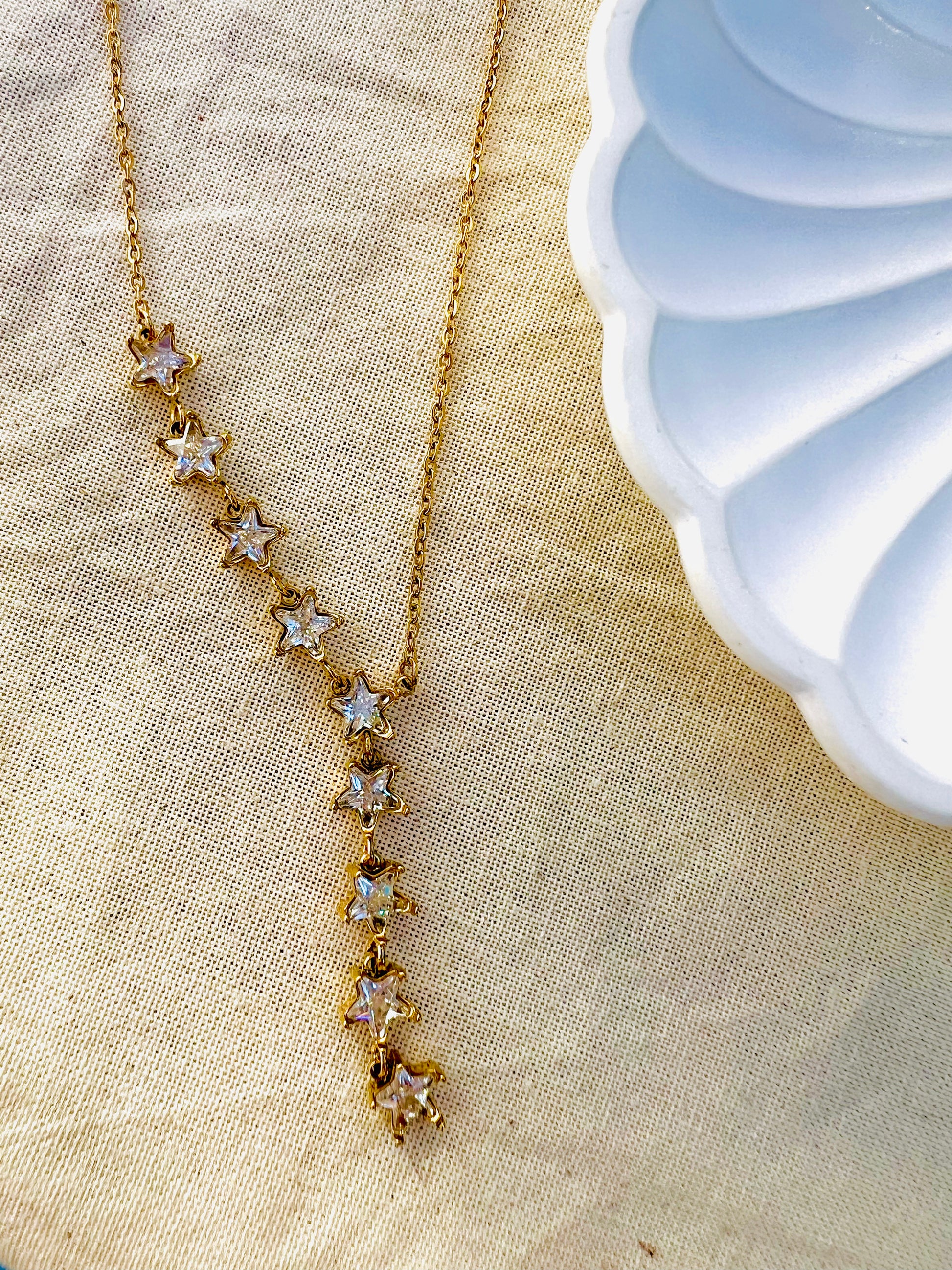 ✧ Collier Y en acier inoxydable orné d'étoiles en oxyde de zirconium de pierres naturelles et de perles d'eau douce.
