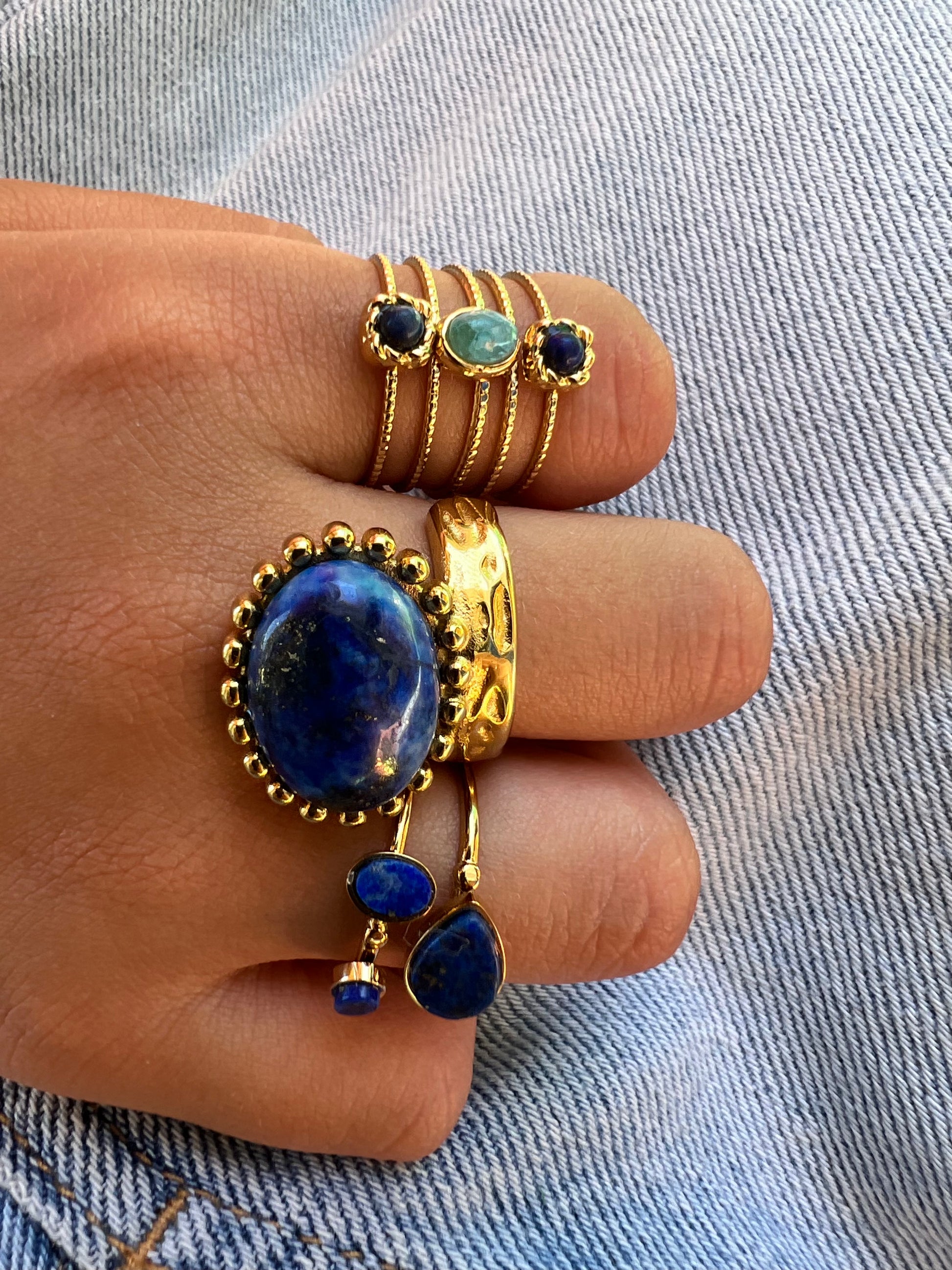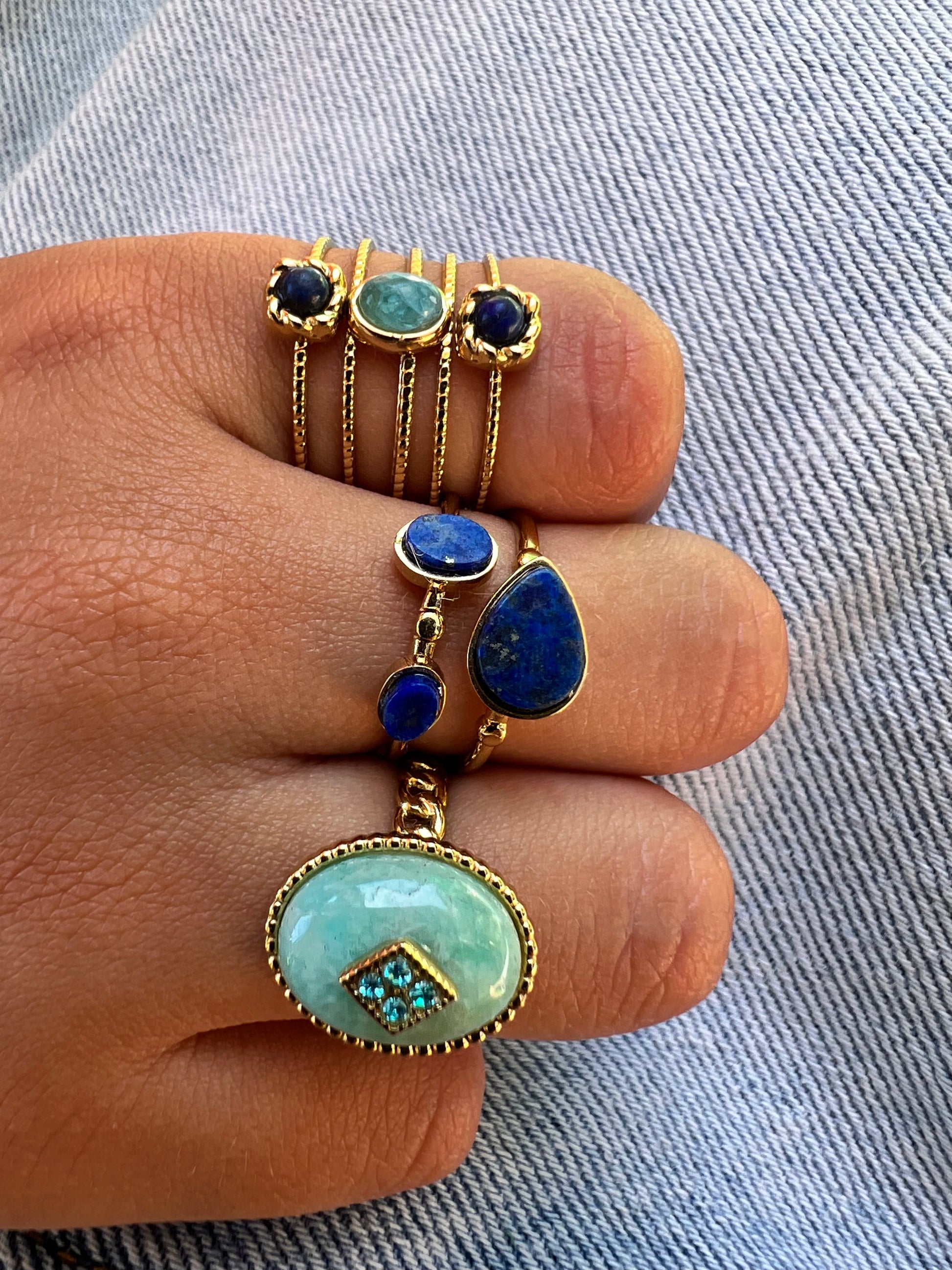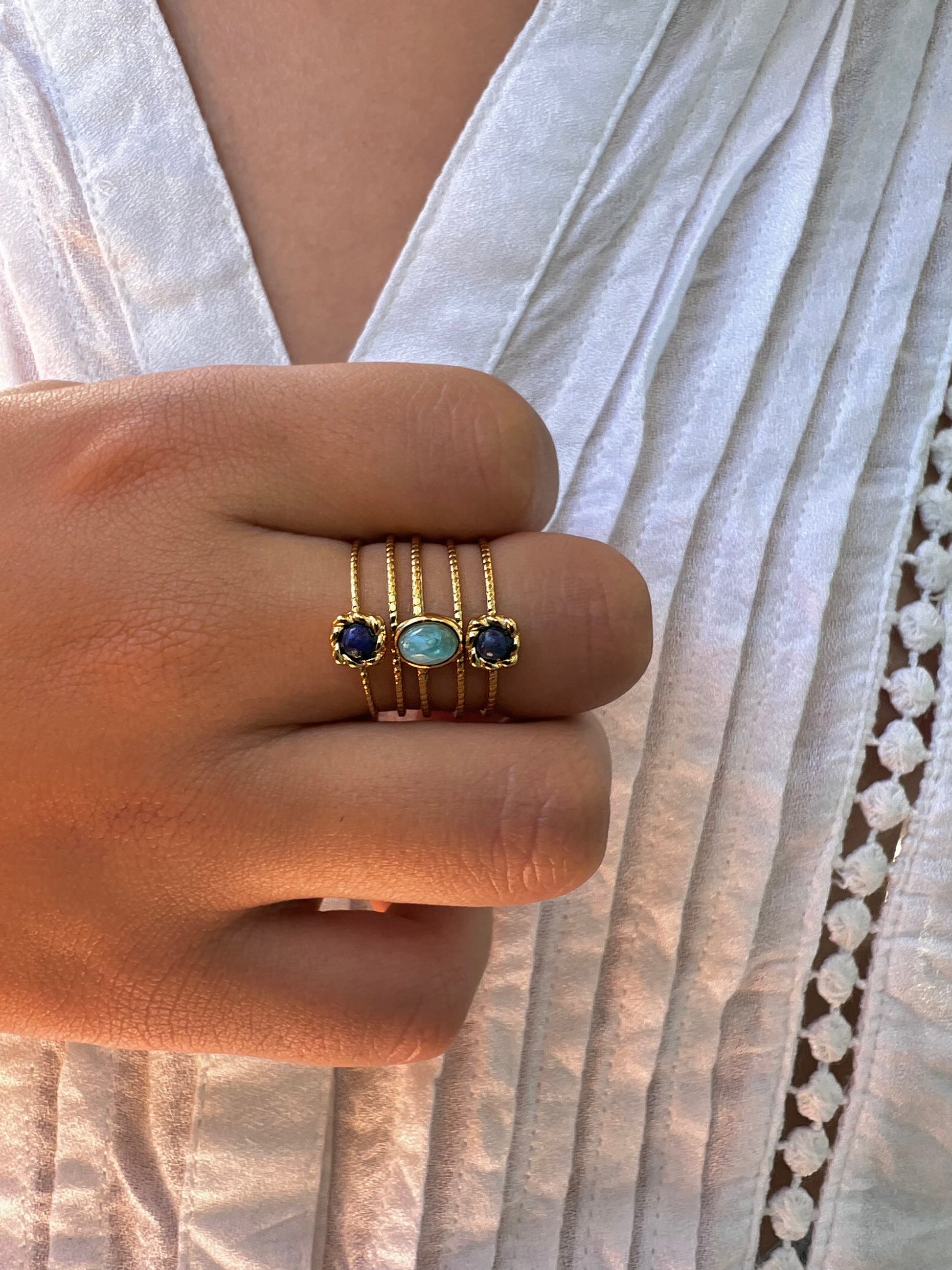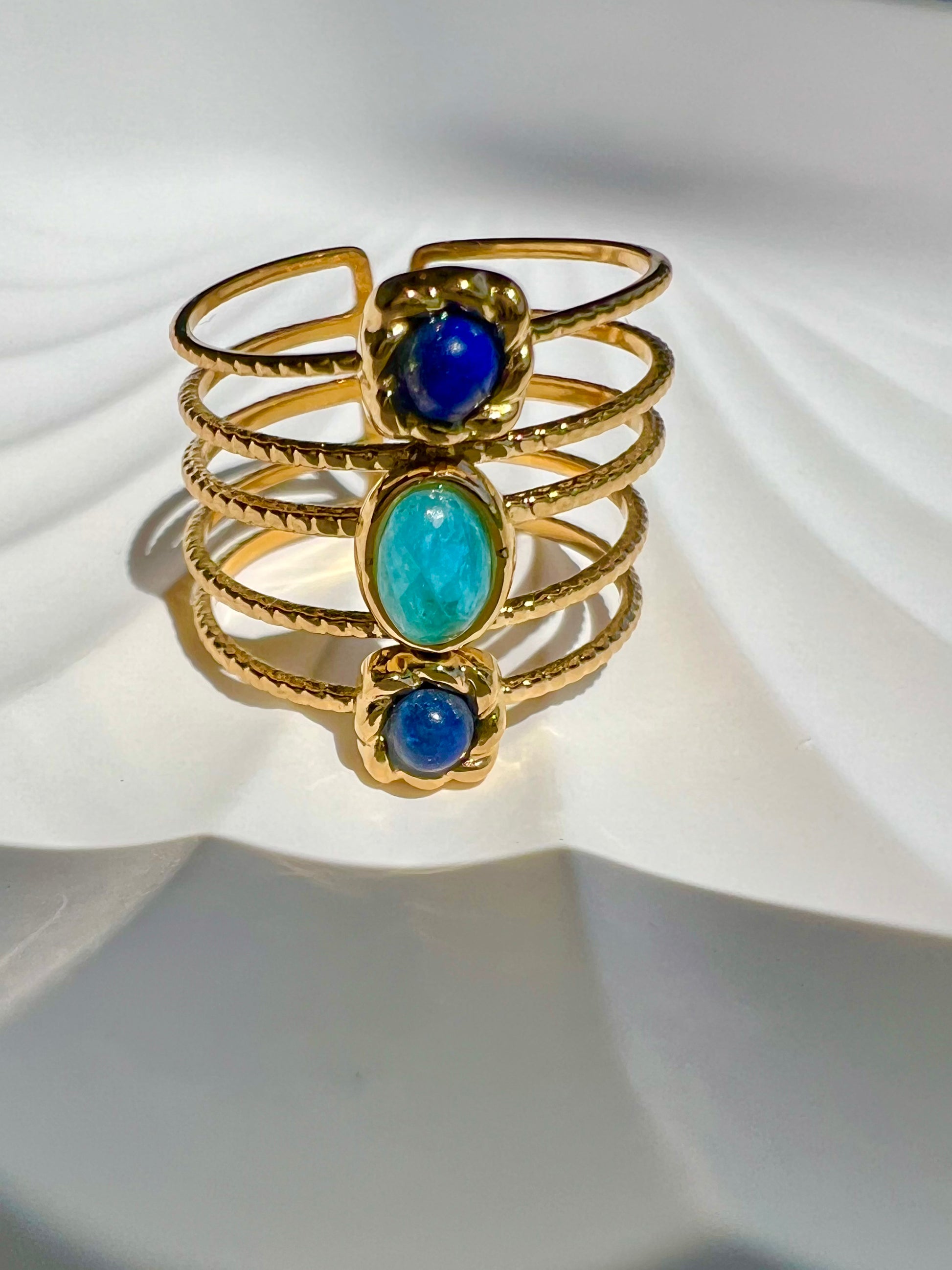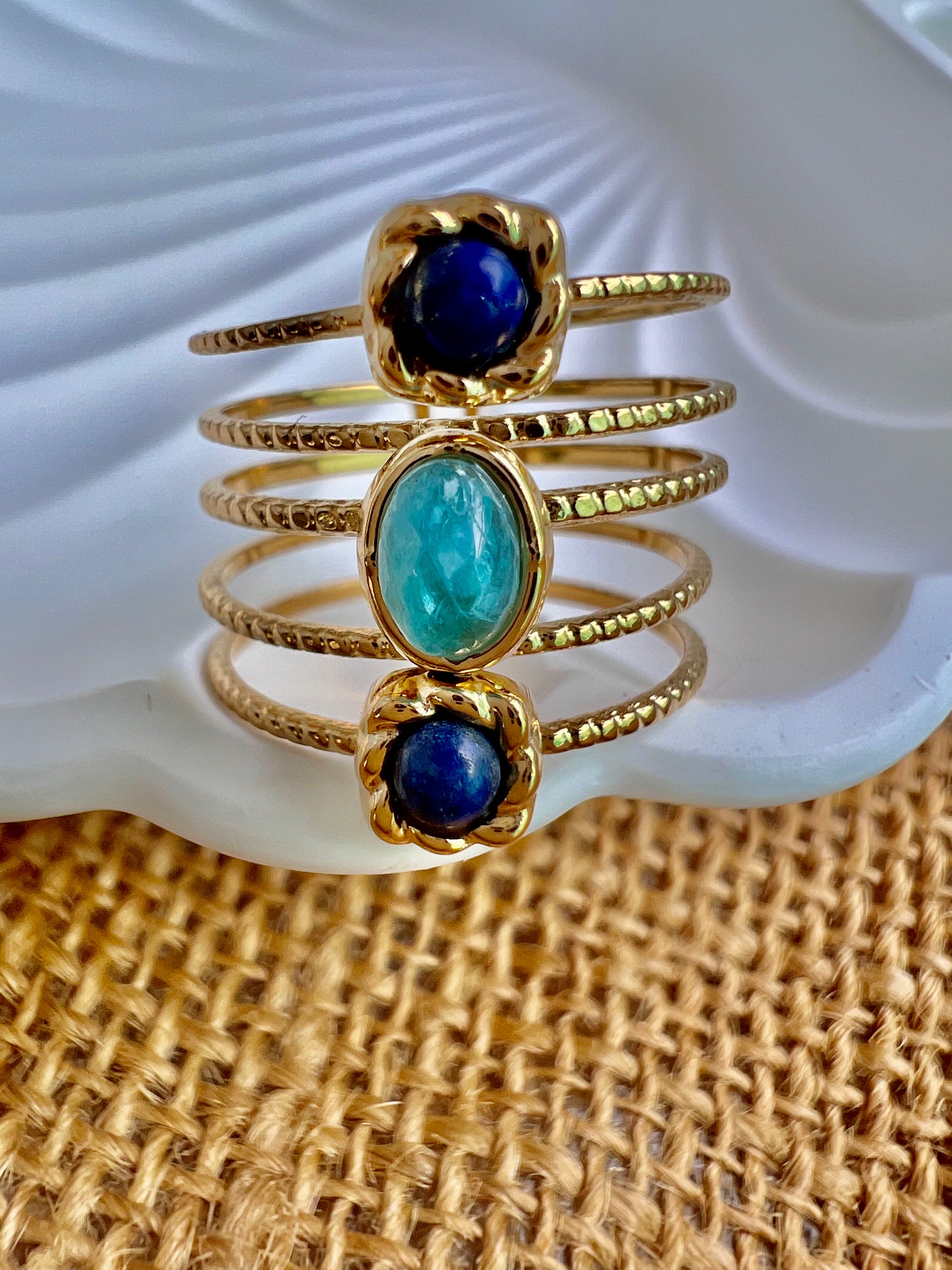 Bague SOÉLIE en acier inoxydable au design audacieux, composée de 5 rangs martelés et ornée de trois pierres naturelles : deux apatites encadrant une amazonite centrale. L’équilibre parfait entre force et douceur, texture et éclat, pour une allure affirmée et solaire.