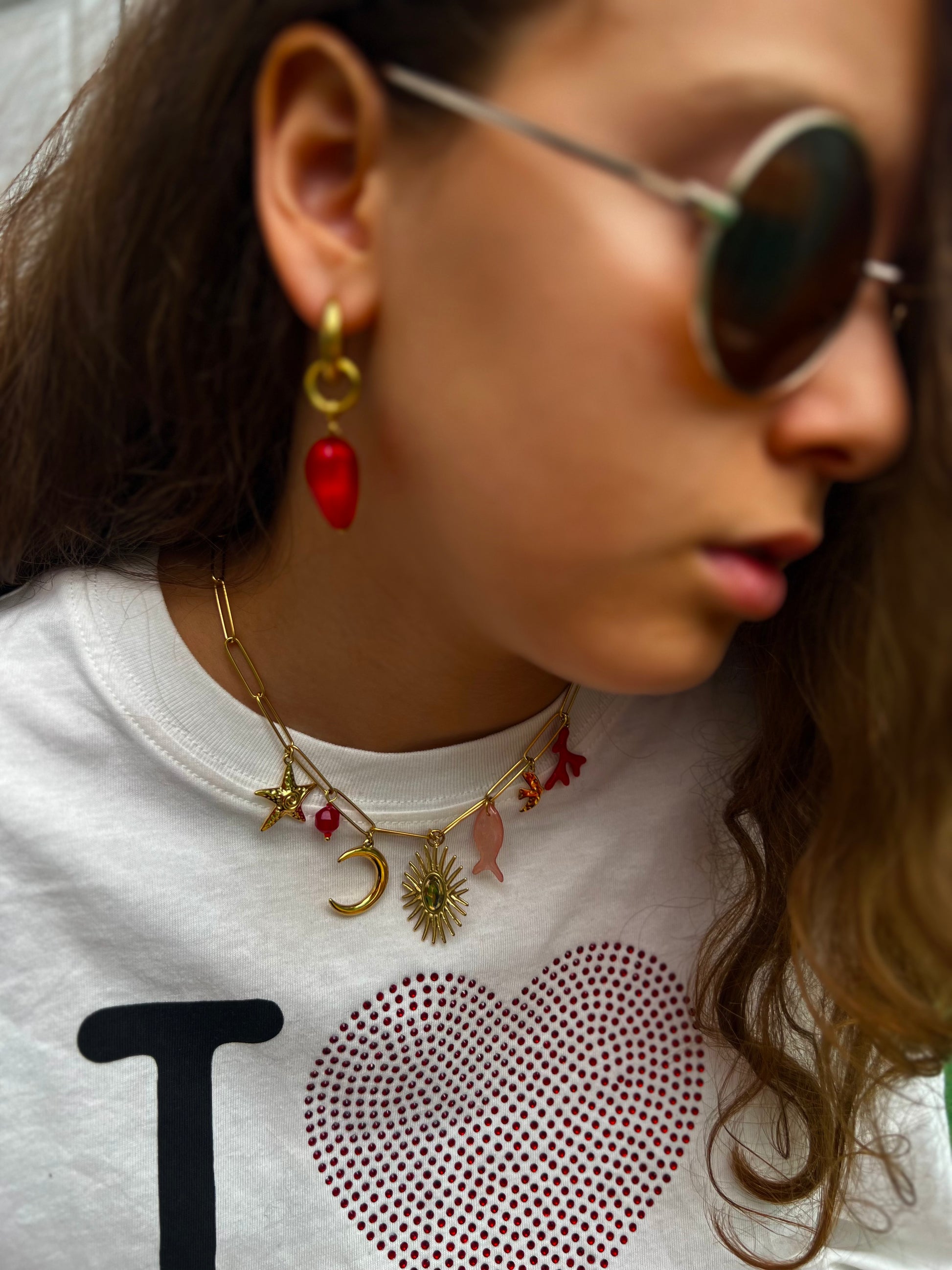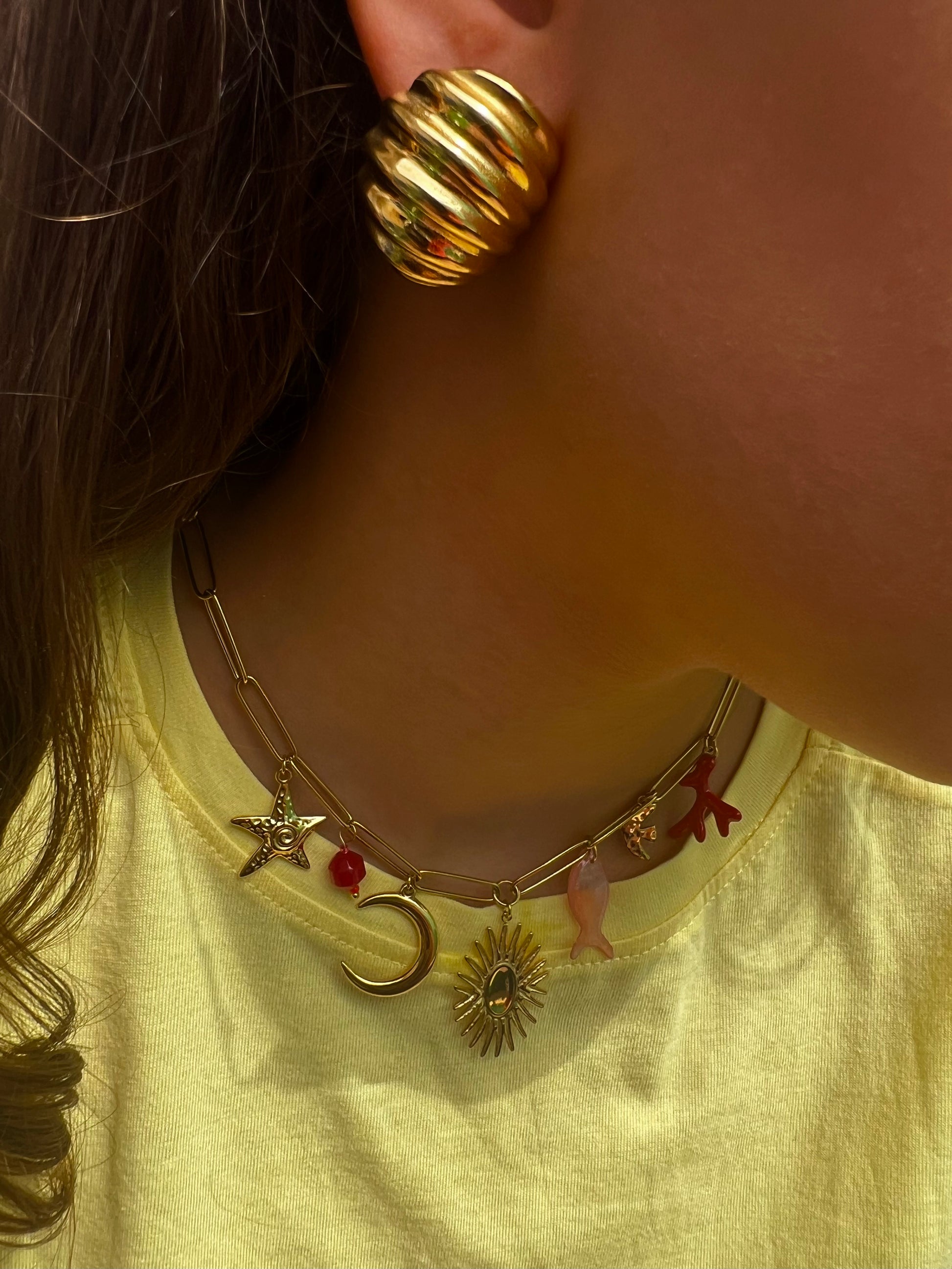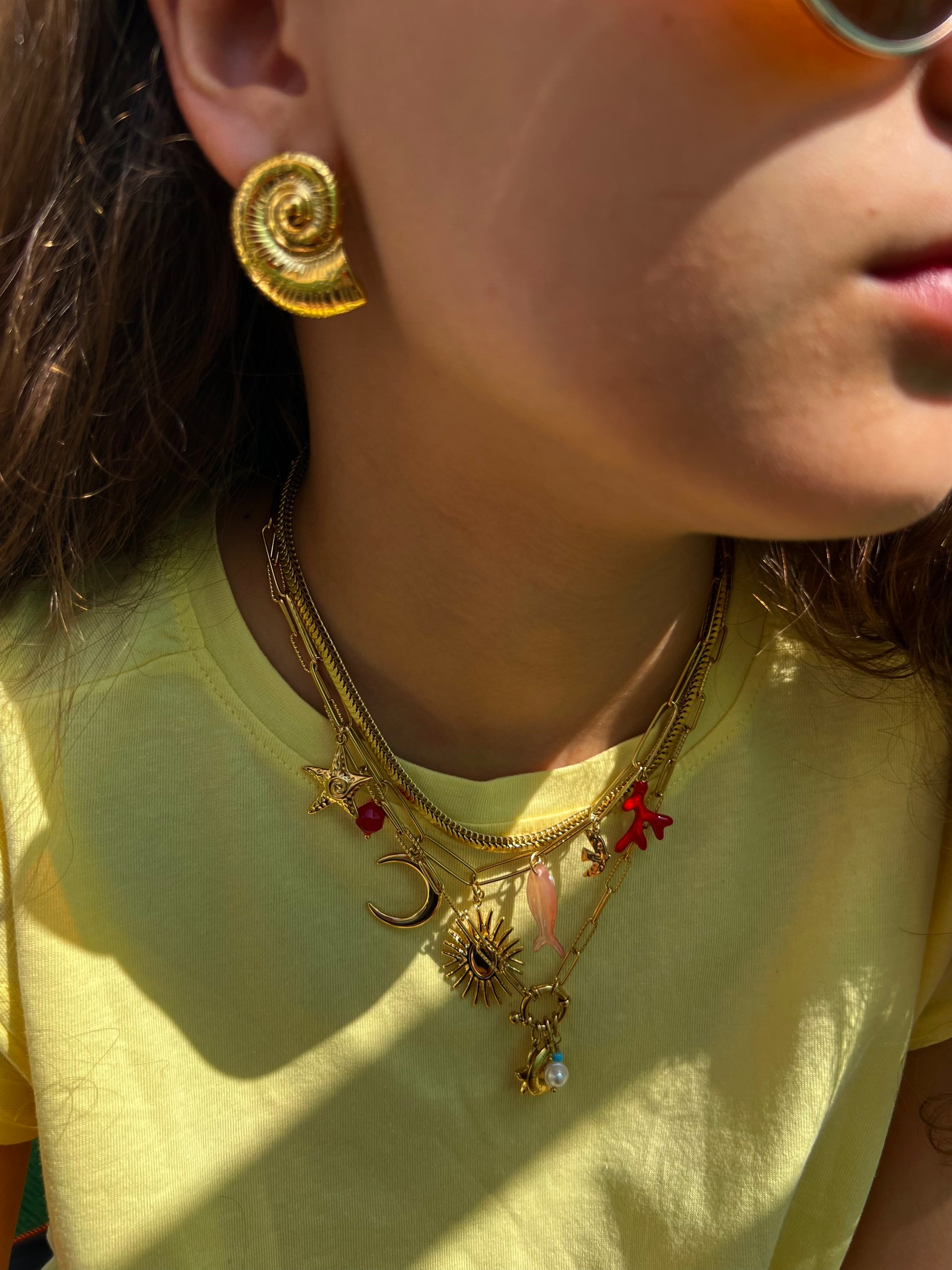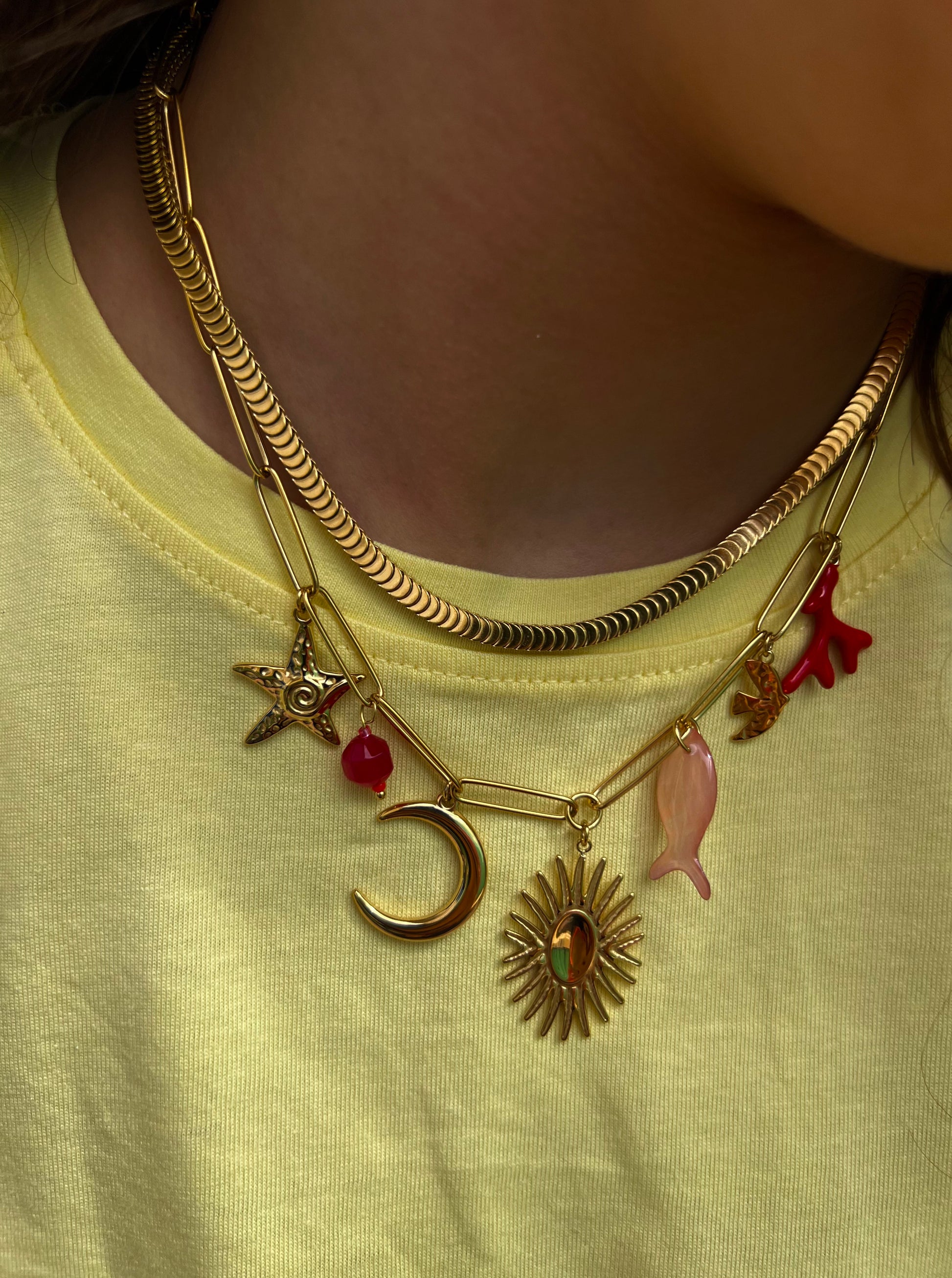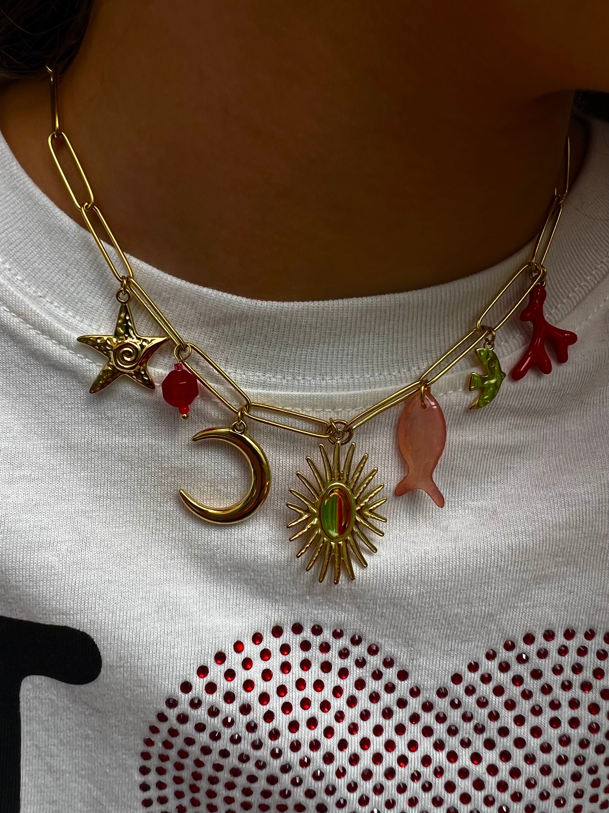 ✧ Collier maille en acier inoxydable, breloques (corail émaillé, oiseau, poisson en acétate, soleil ovale, étoile de mer) et pierres naturelles.