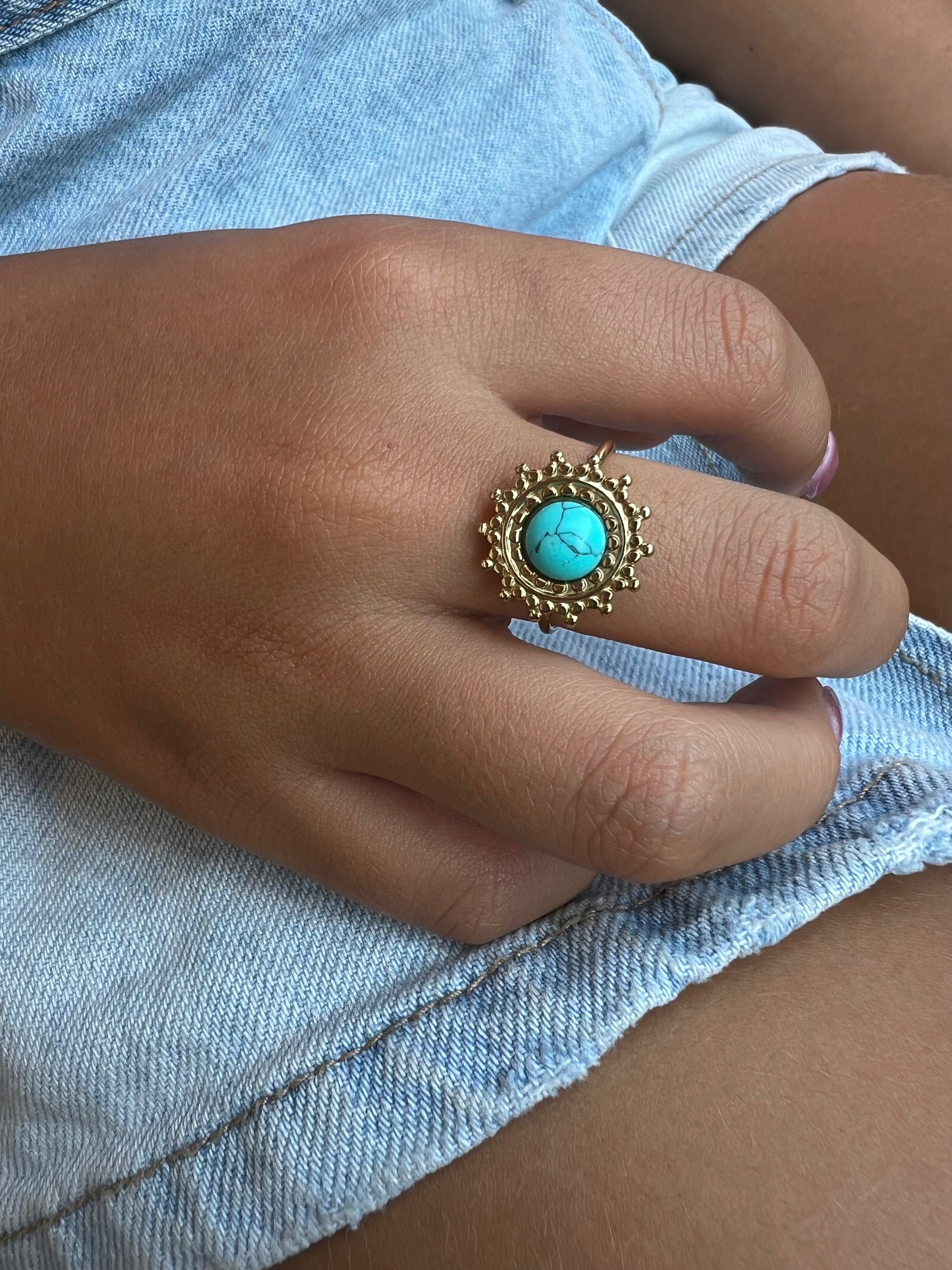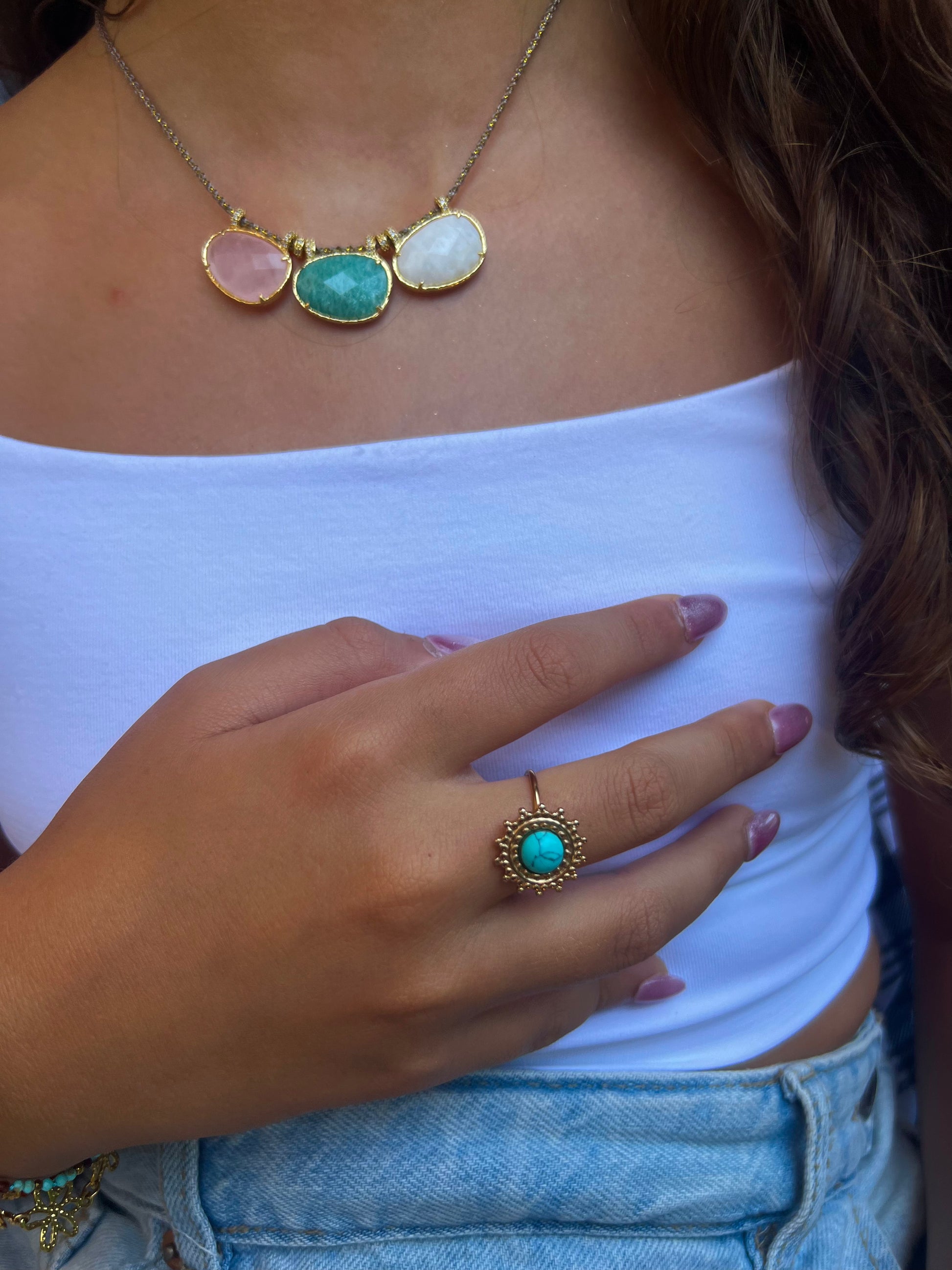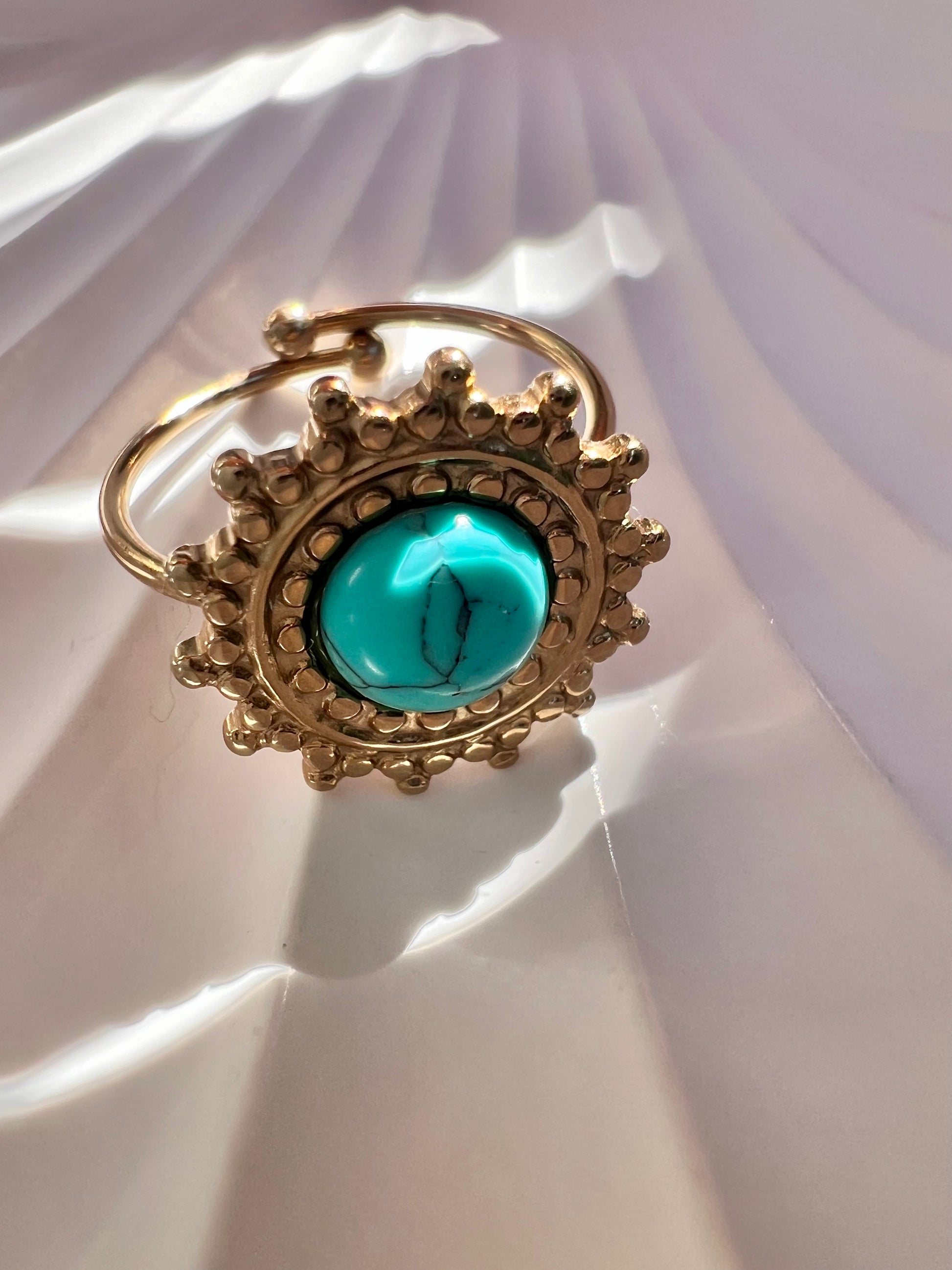En son centre, une pierre howlite bleue capte la lumière pour un éclat lumineux et vibrant.