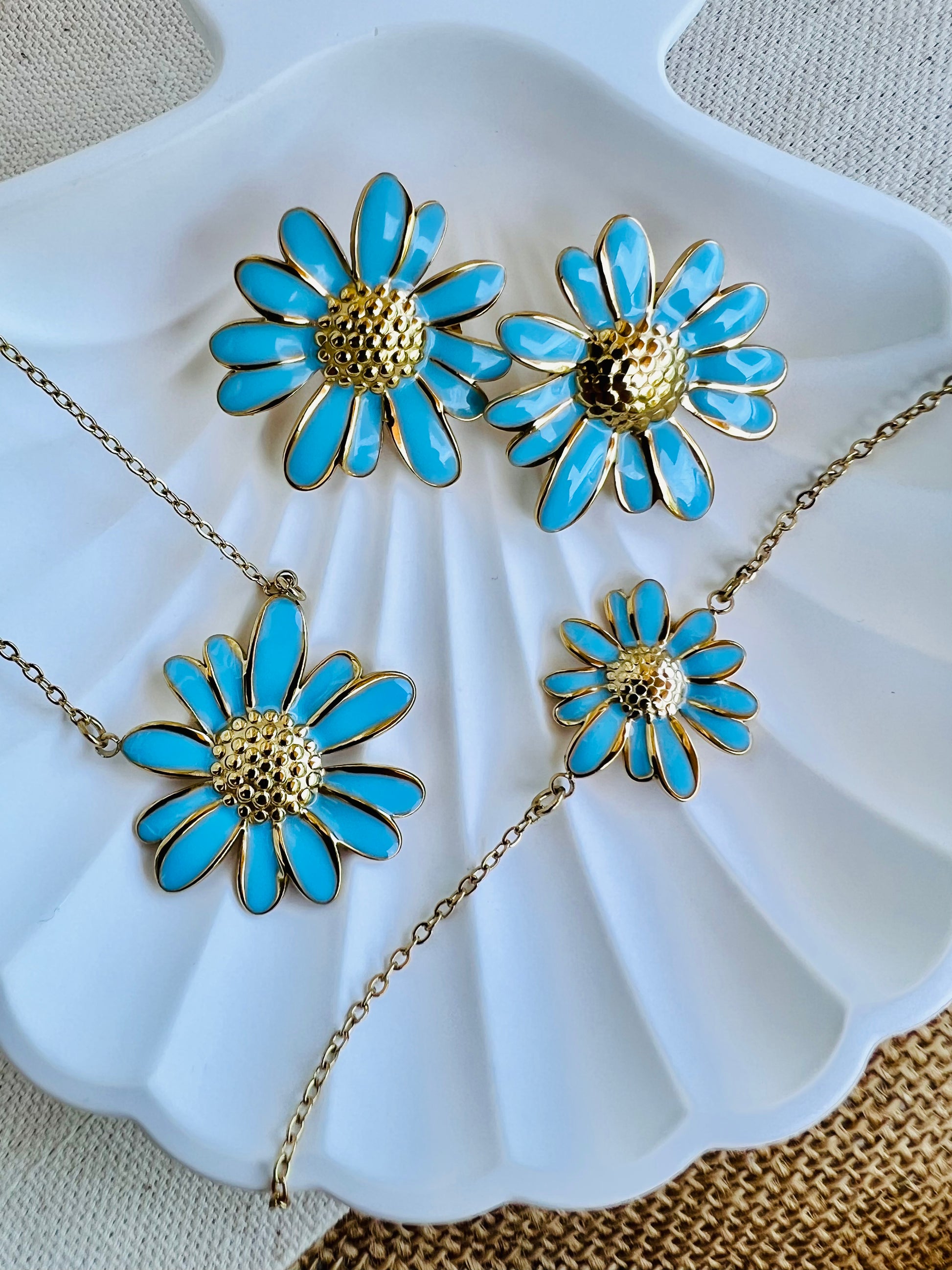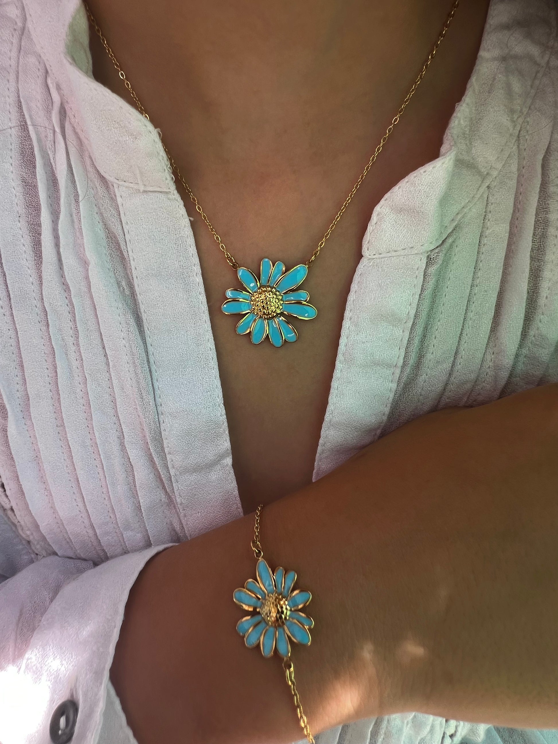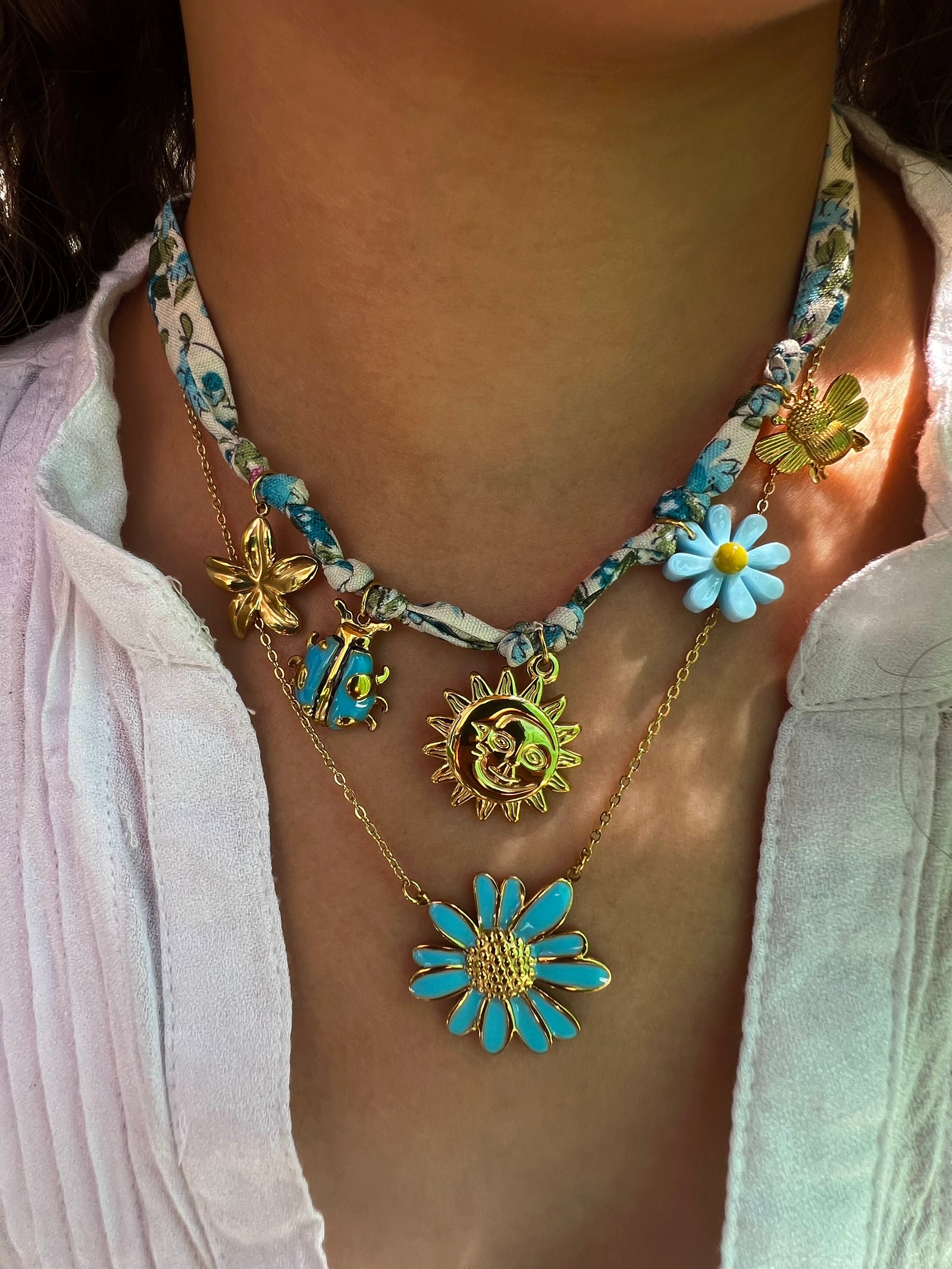 ✨ Collier SYBILLE en acier inoxydable doré, composé d’une fine chaîne ornée d’un pendentif marguerite émaillée dans un éclatant bleu. 🌼💙 Une pièce chic et délicate qui ajoute une touche fleurie à vos tenues estivales.