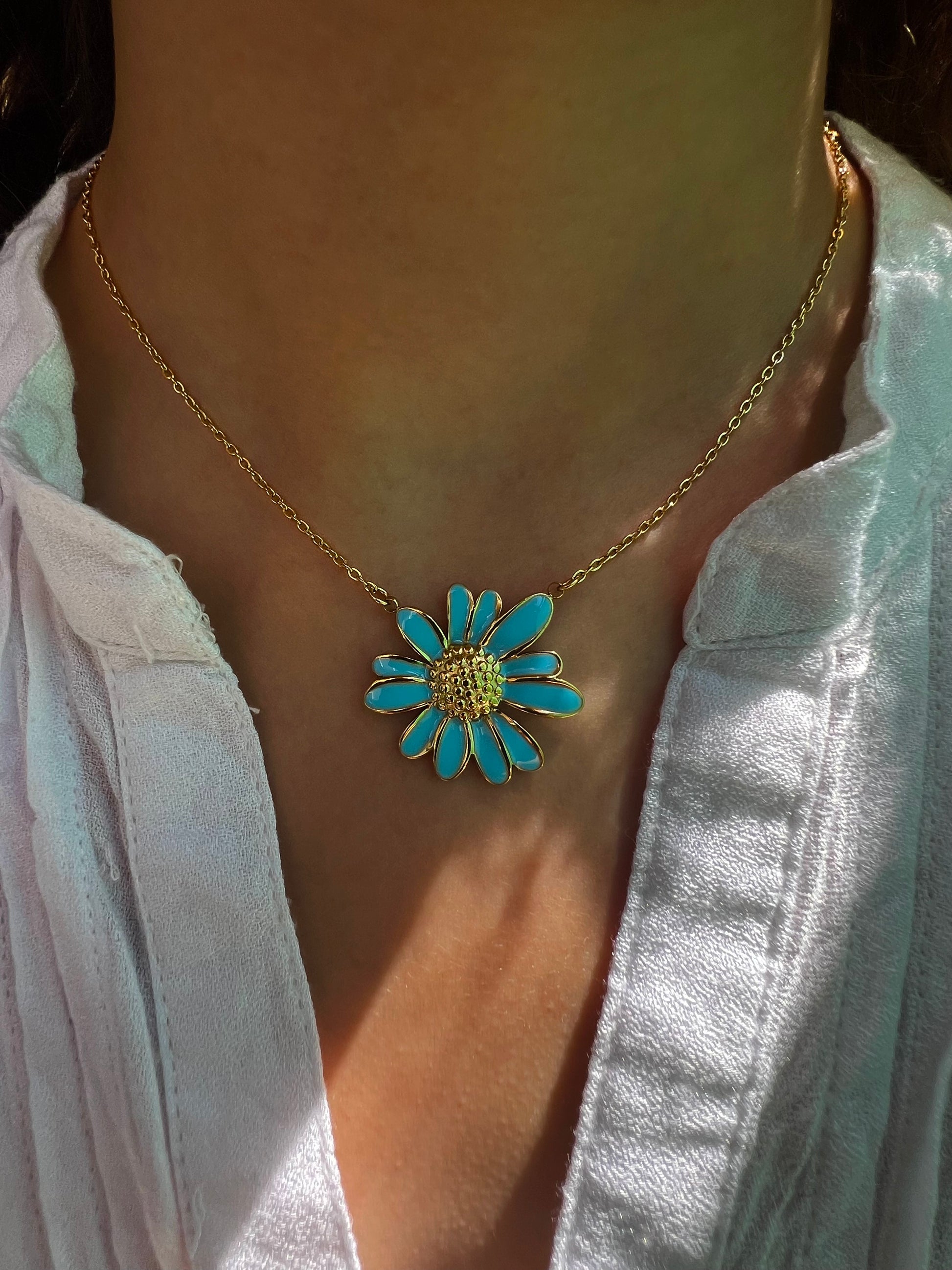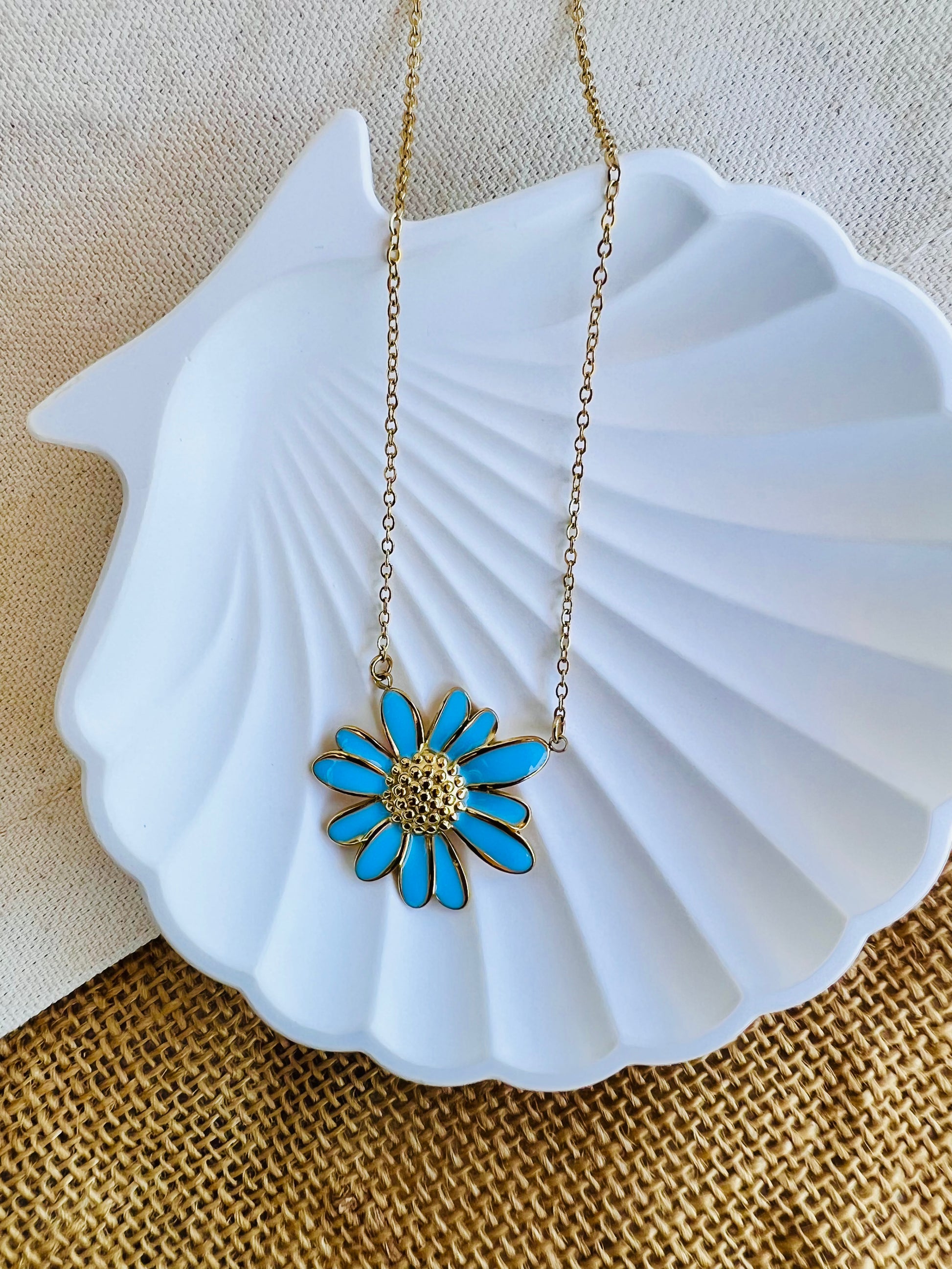 ✧ Collier en acier inoxydable doré agrémenté d’un pendentif en forme de marguerite émaillée dans un ton éclatant.