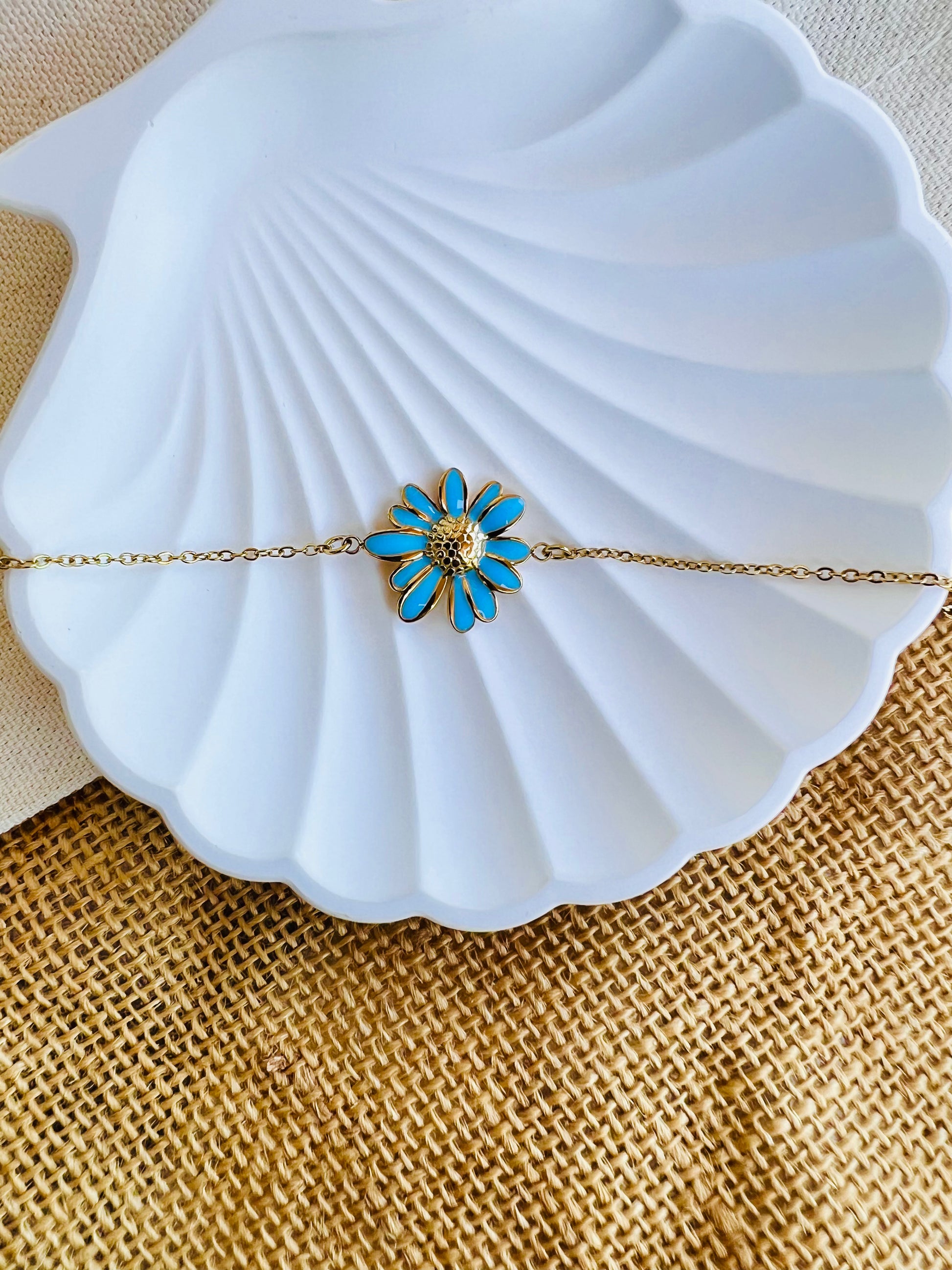 ✨ Bracellet SYBILLE en acier inoxydable doré, composé d’une fine chaîne ornée d’un pendentif marguerite émaillée dans un éclatant bleu. 🌼💙 Une pièce chic et délicate qui ajoute une touche fleurie à vos tenues estivales.