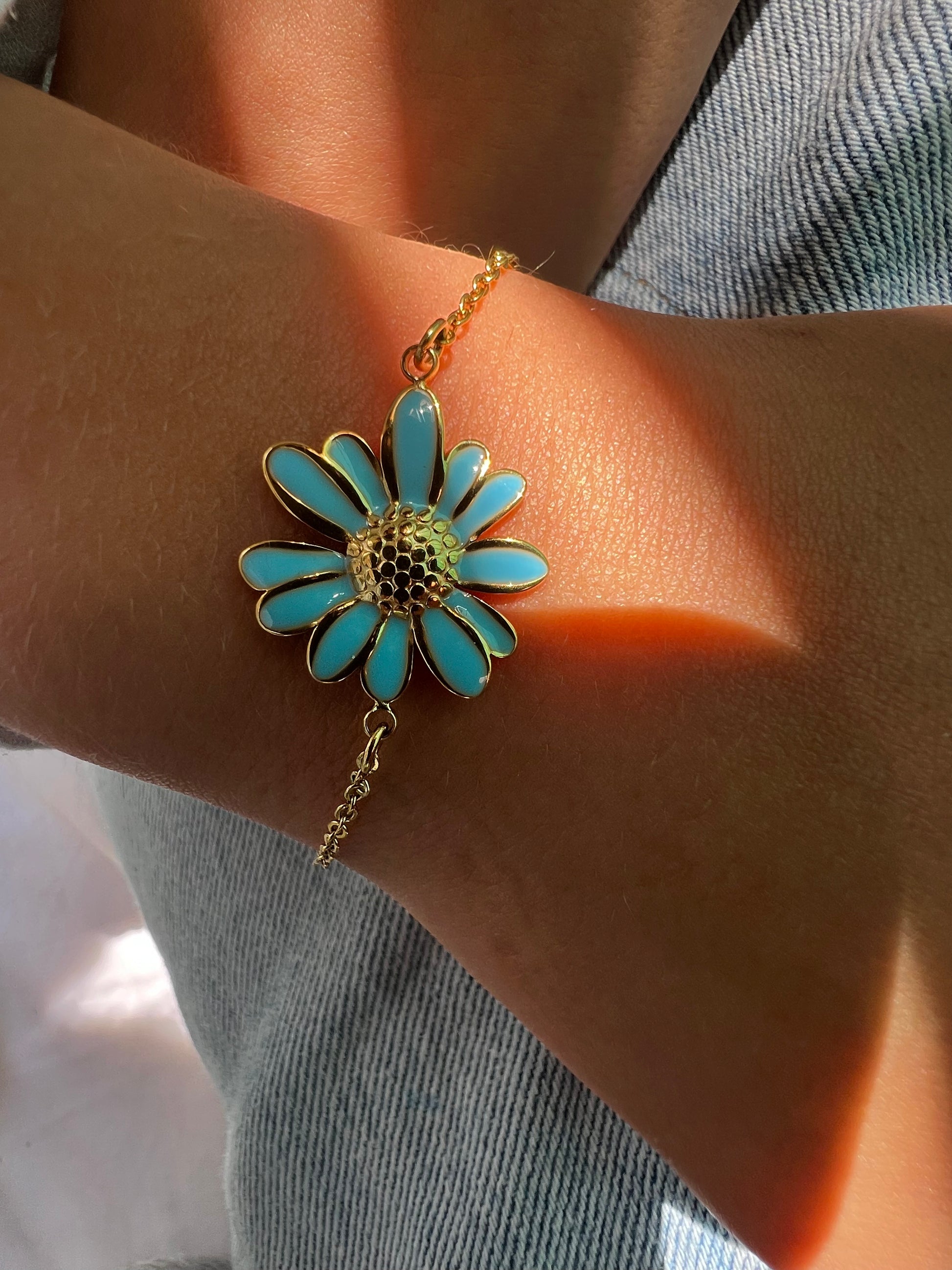✧ Bracelet en acier inoxydable doré agrémenté d’un pendentif en forme de marguerite émaillée dans un ton éclatant.