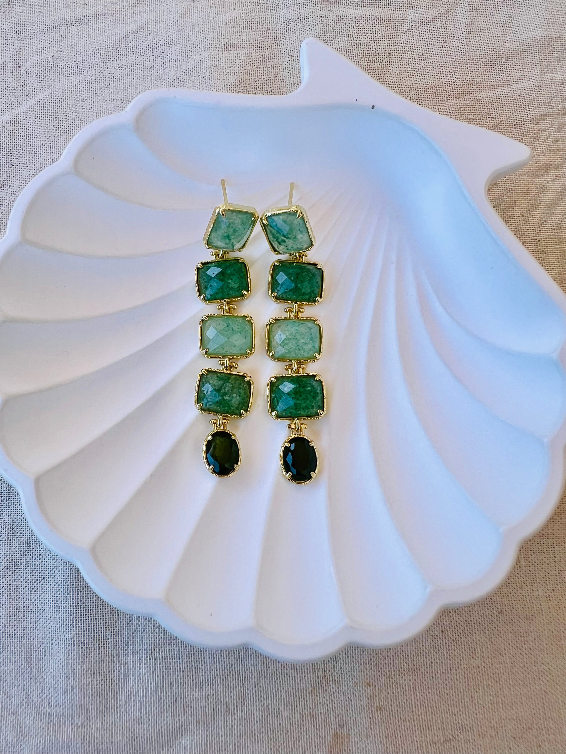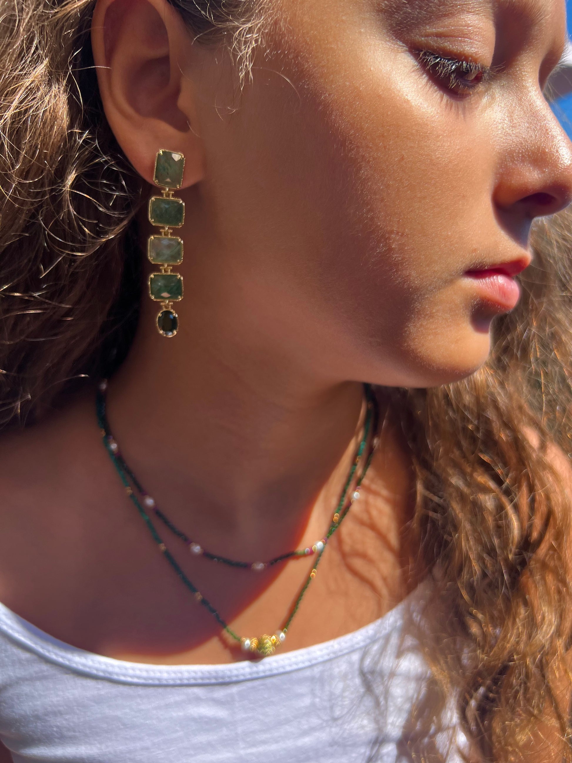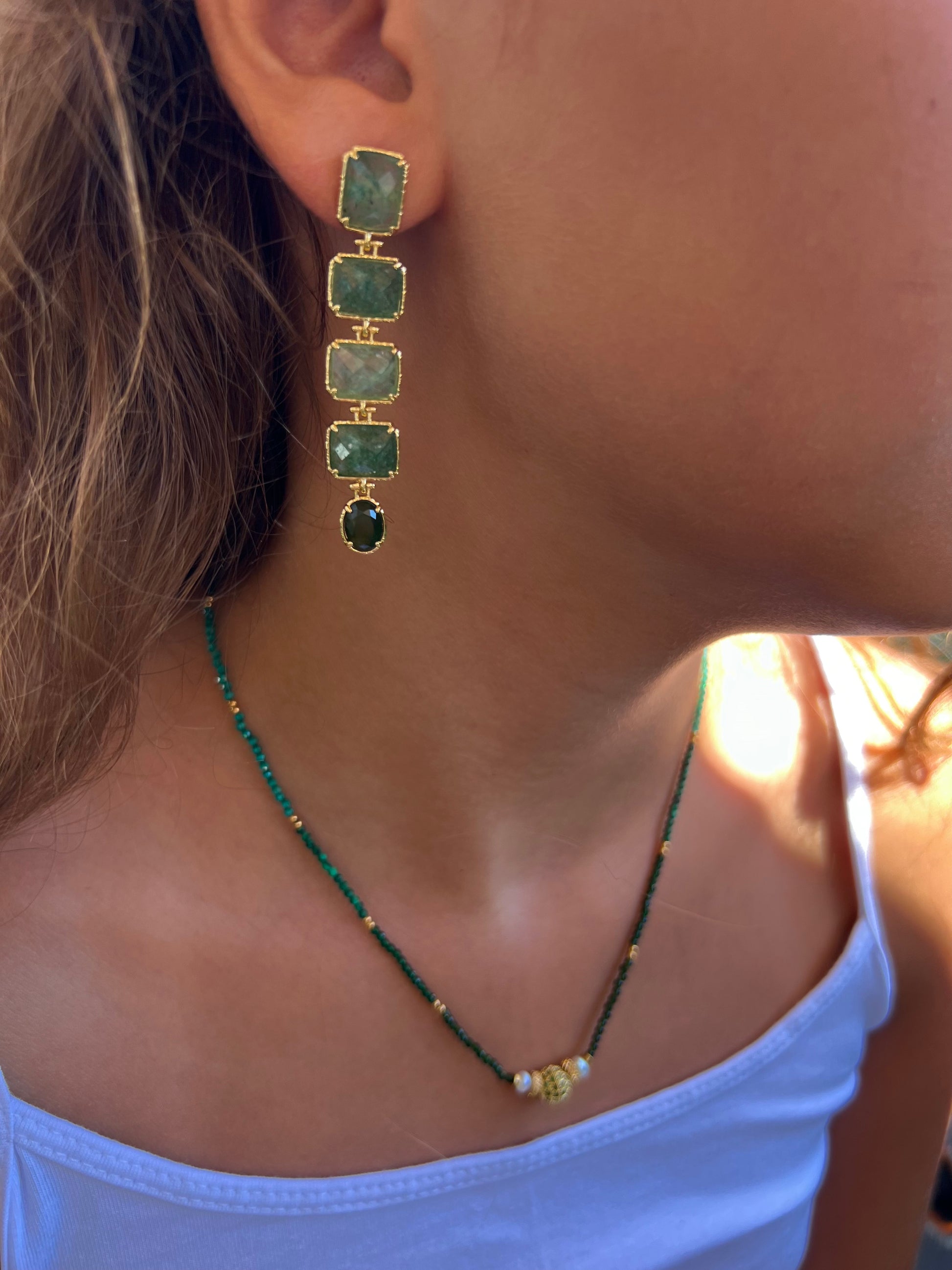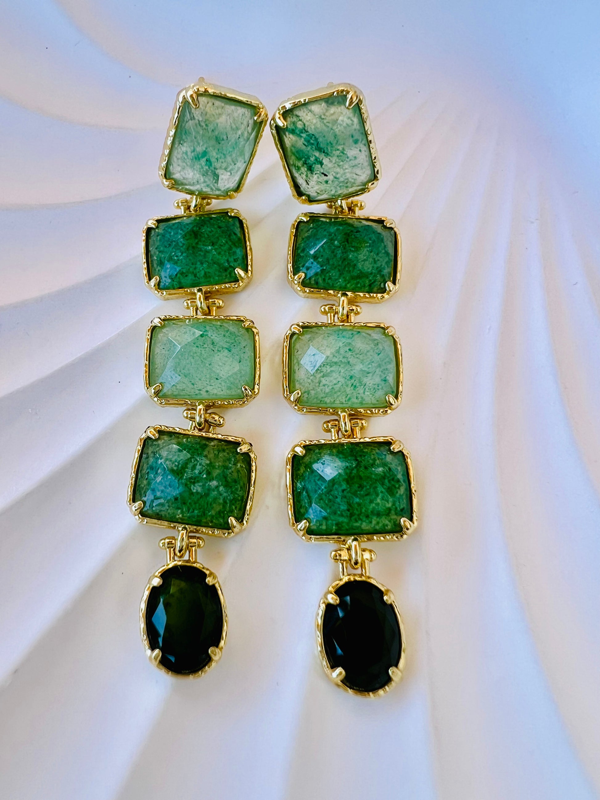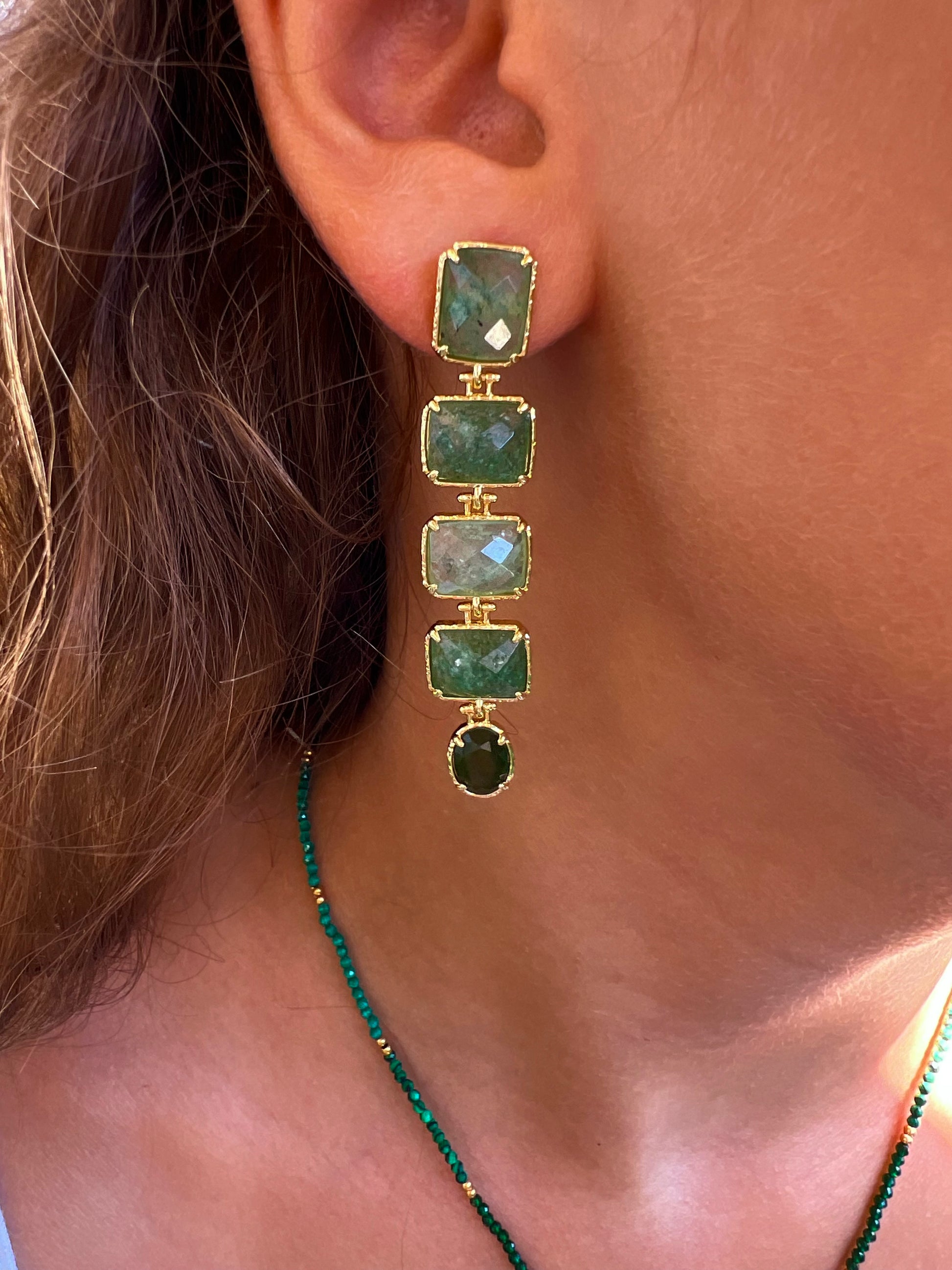 Élégantes et modernes ✨, les boucles pendantes Talyne en laiton présentent quatre pierres rectangulaires dont deux quartz fraise verts scintillants, sublimées par une délicate fleur en zirconium.