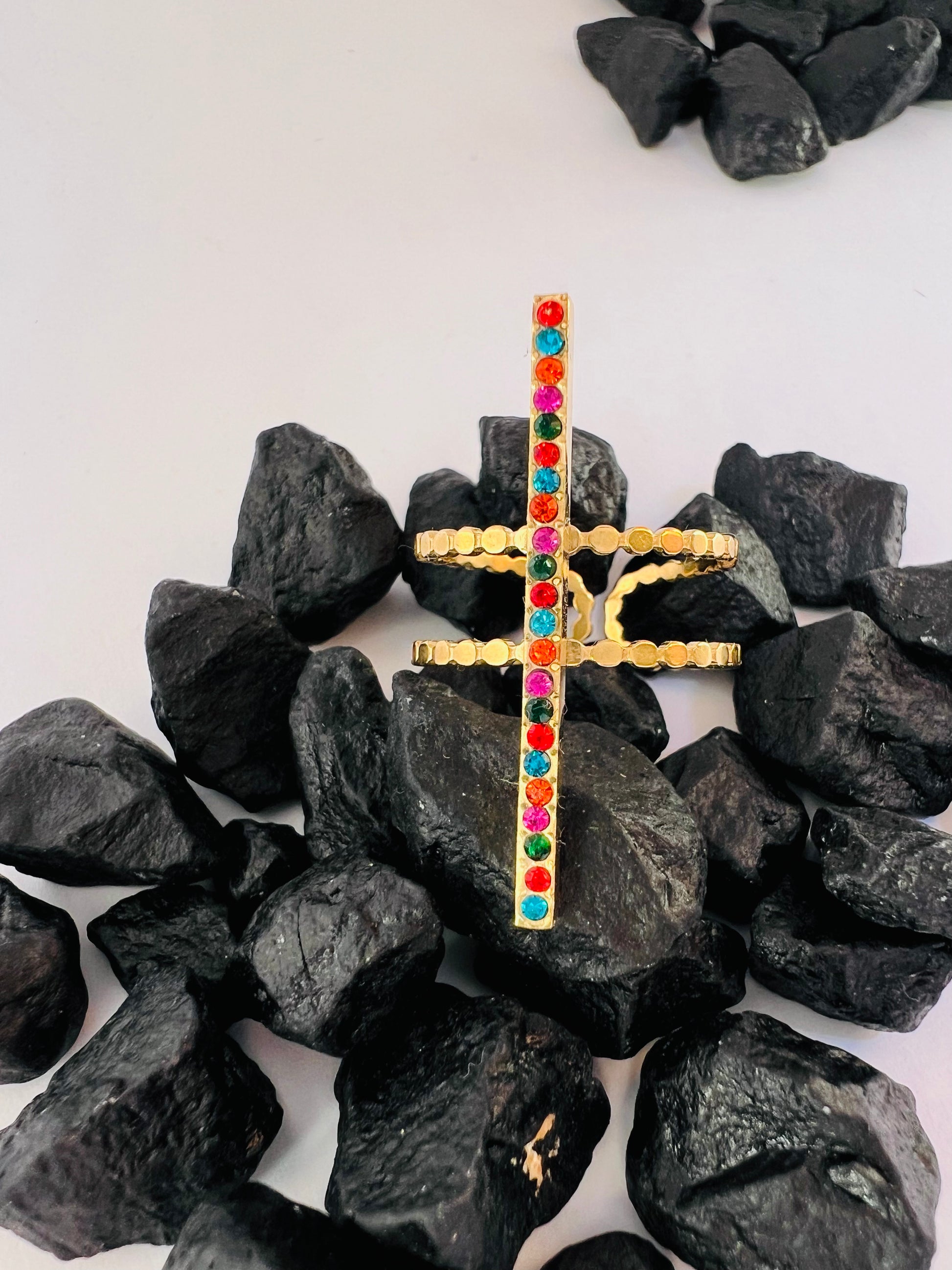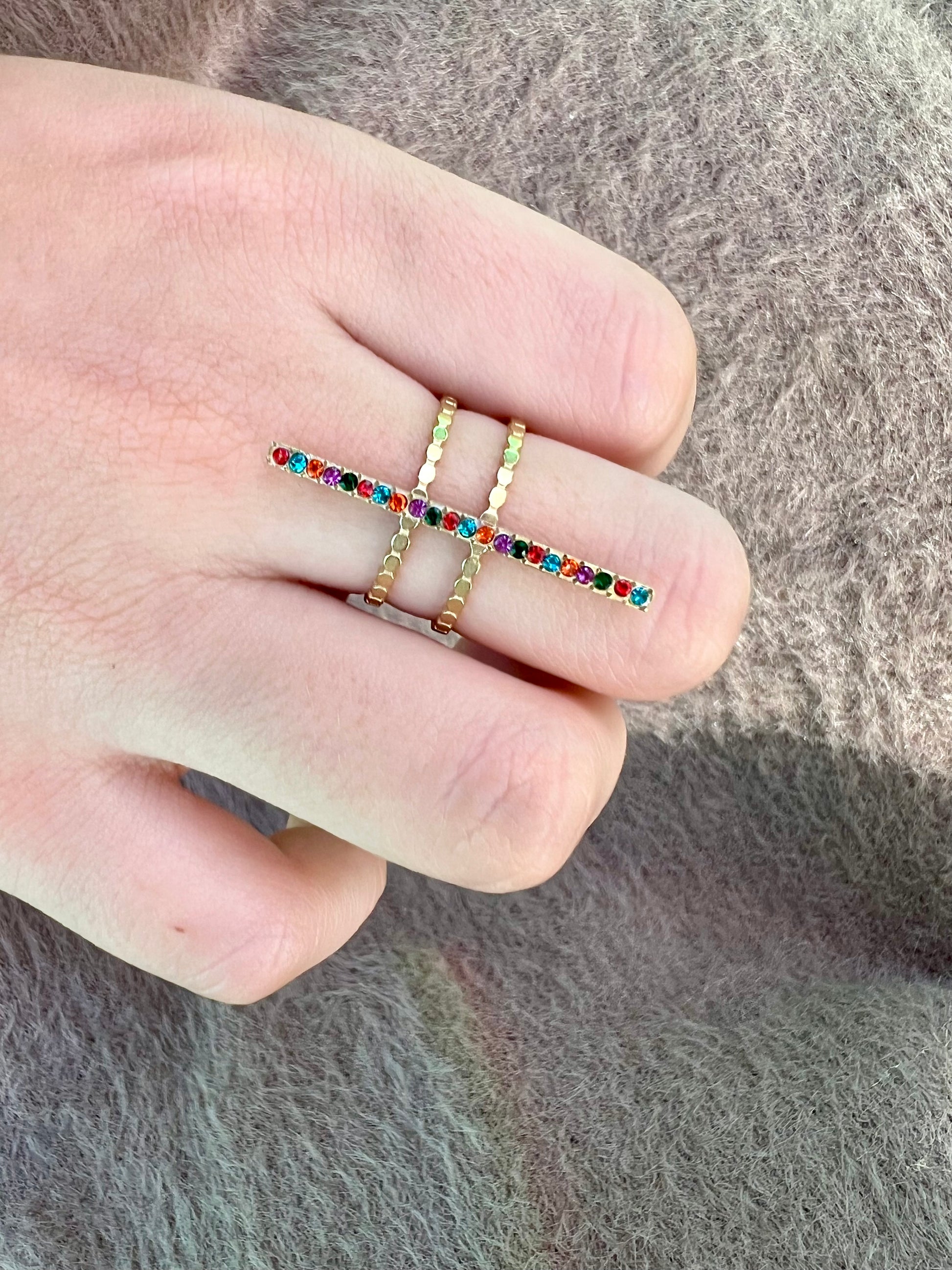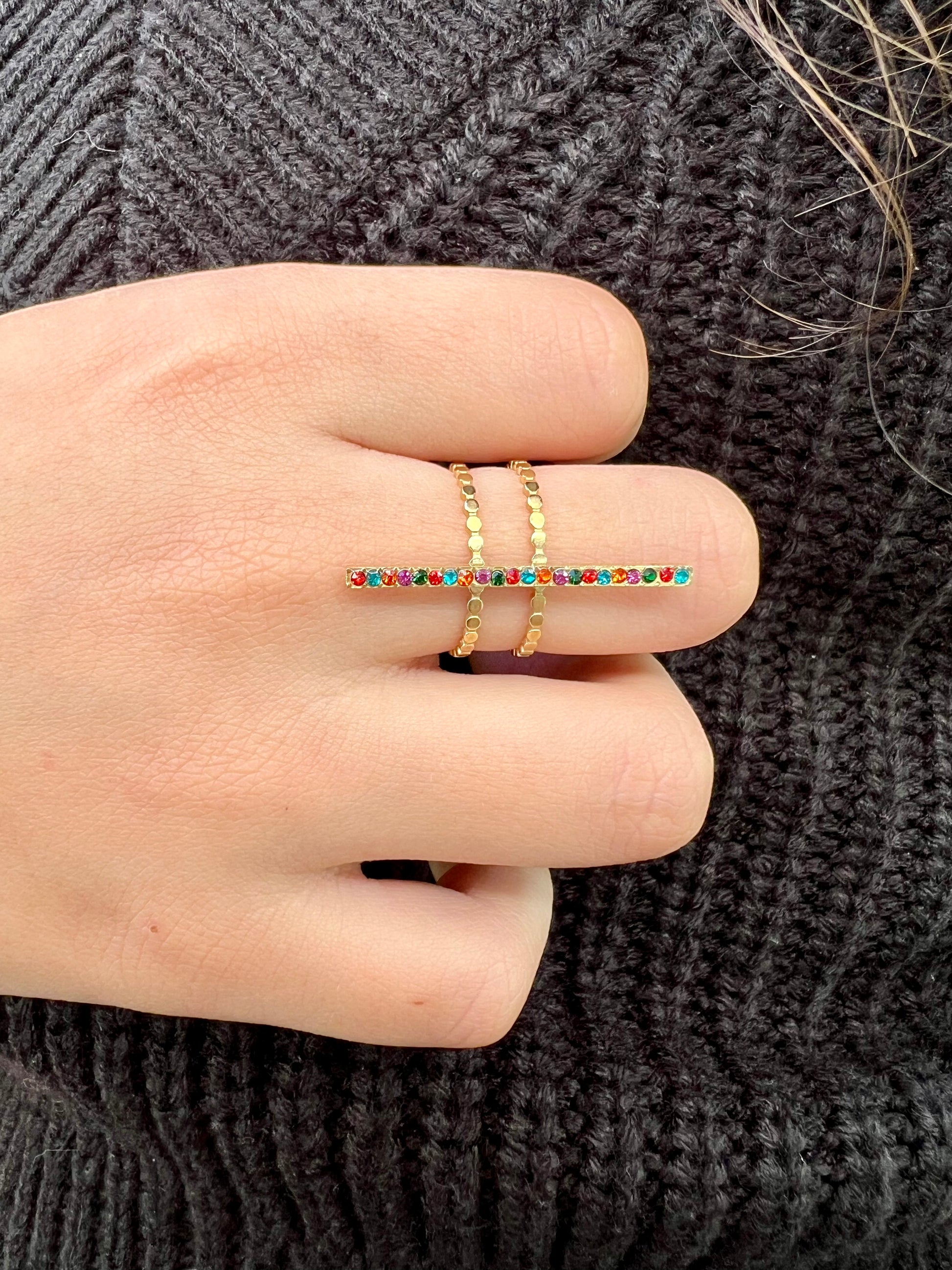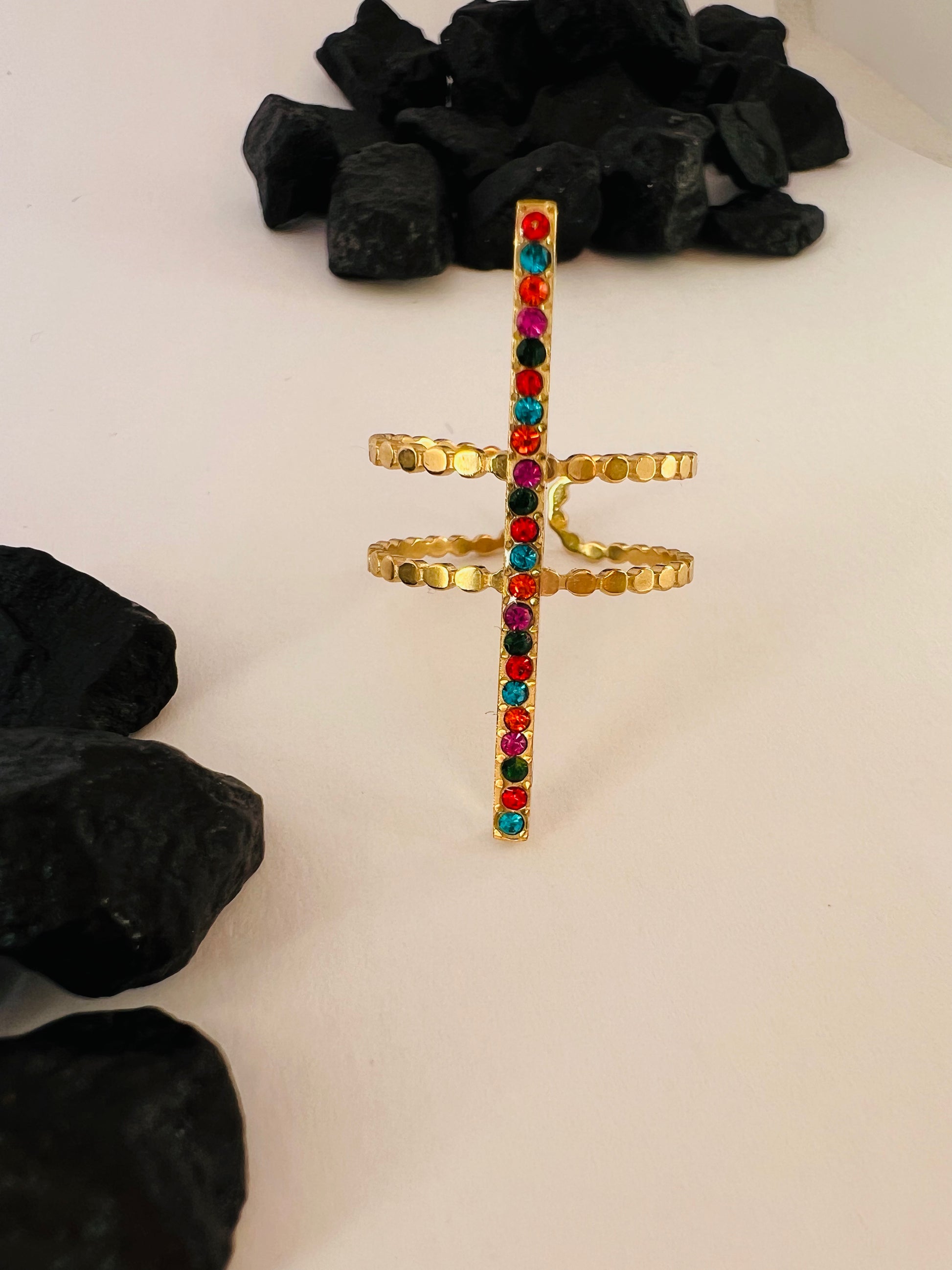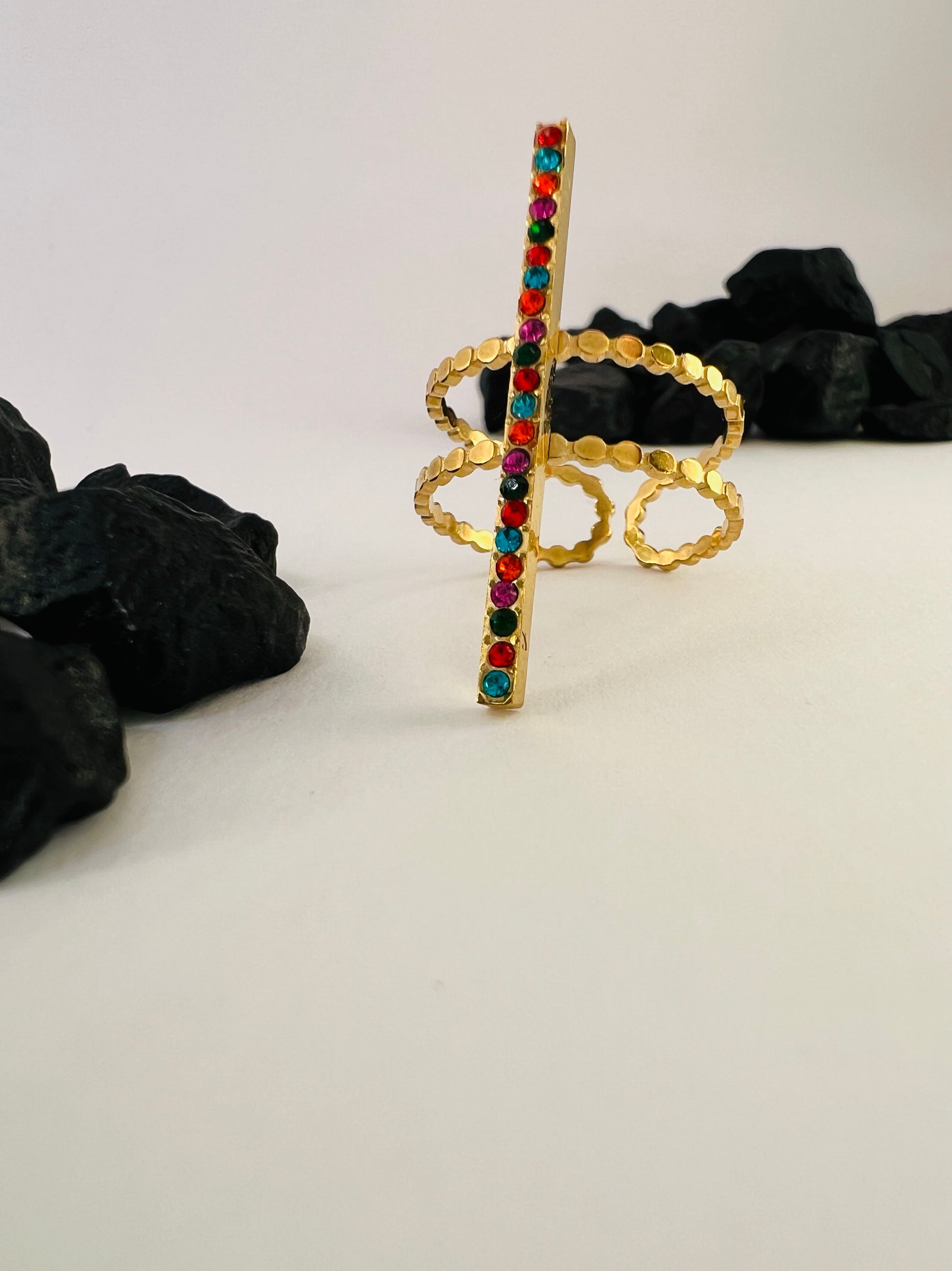 ✧ Bague dorée en acier inoxydable et strass colorés.