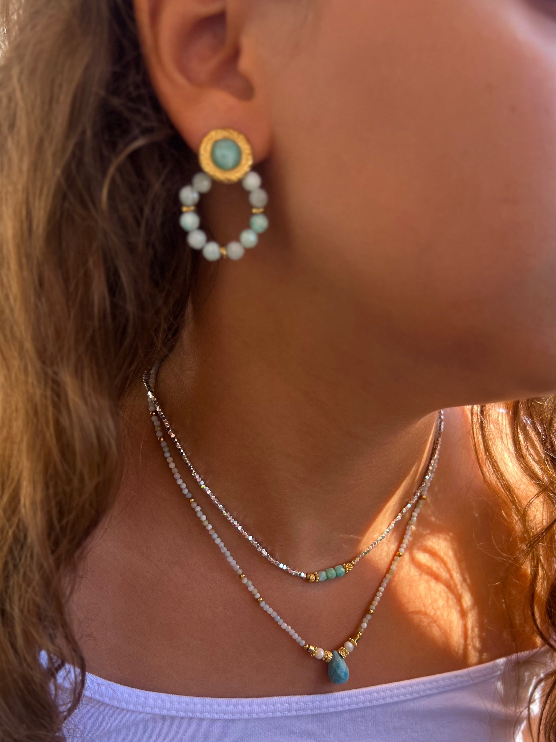 Le collier Tyliane reflète douceur et harmonie 🌿. Finement perlé en amazonite, il est orné de deux perles d’eau et d’élégantes gouttes en apatite, créant un bijou raffiné et équilibré.