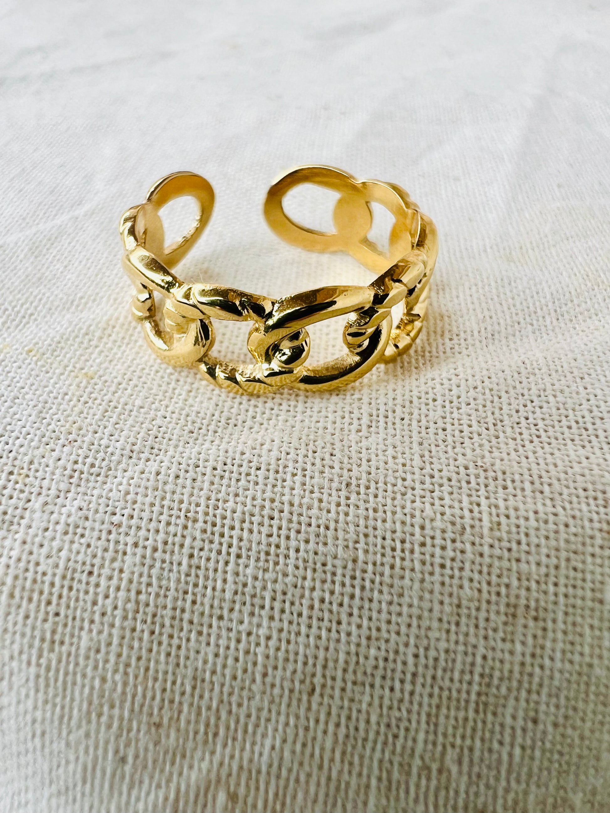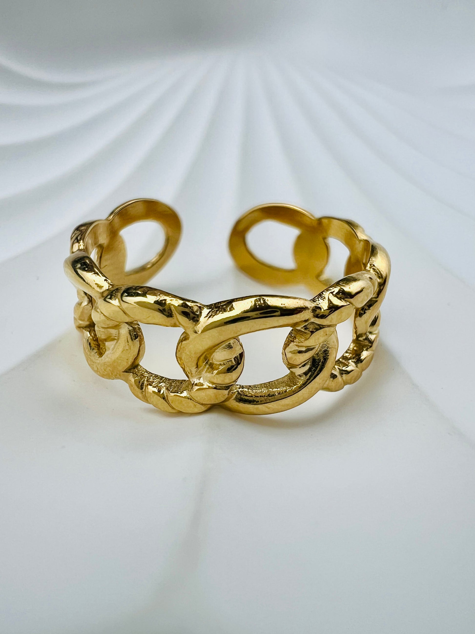 ✧ Bague dorée en acier inoxydable en maille ajourée.