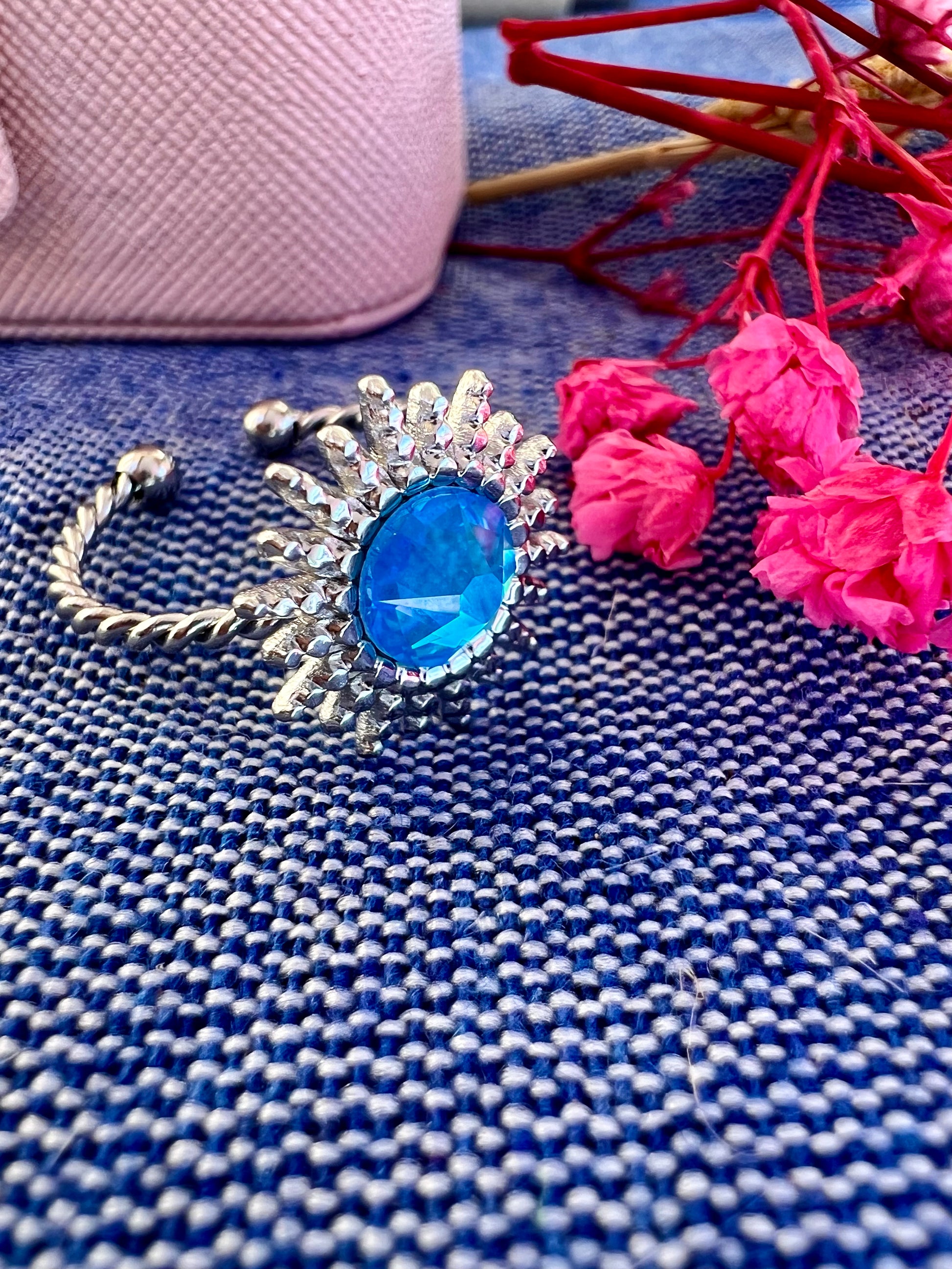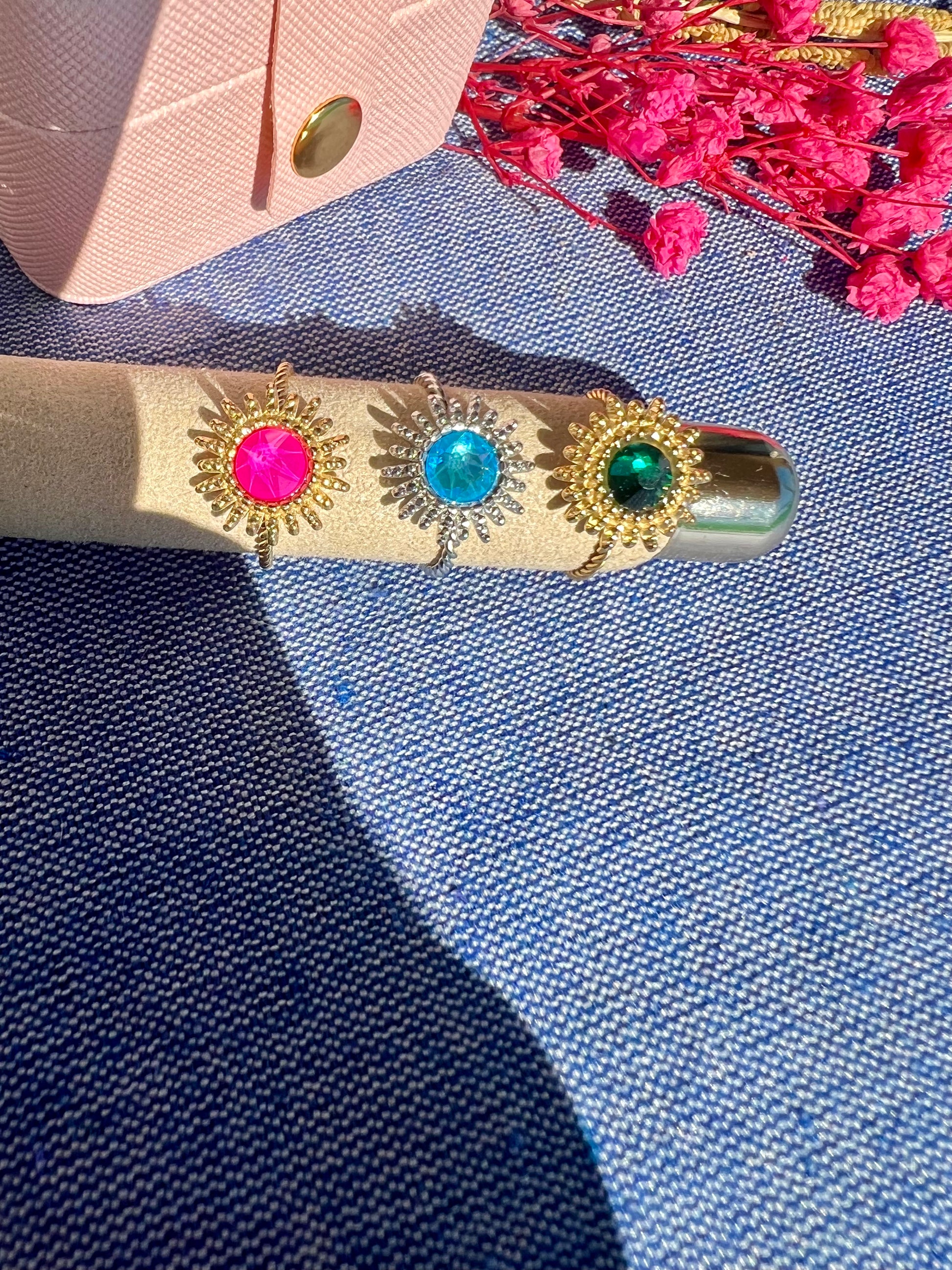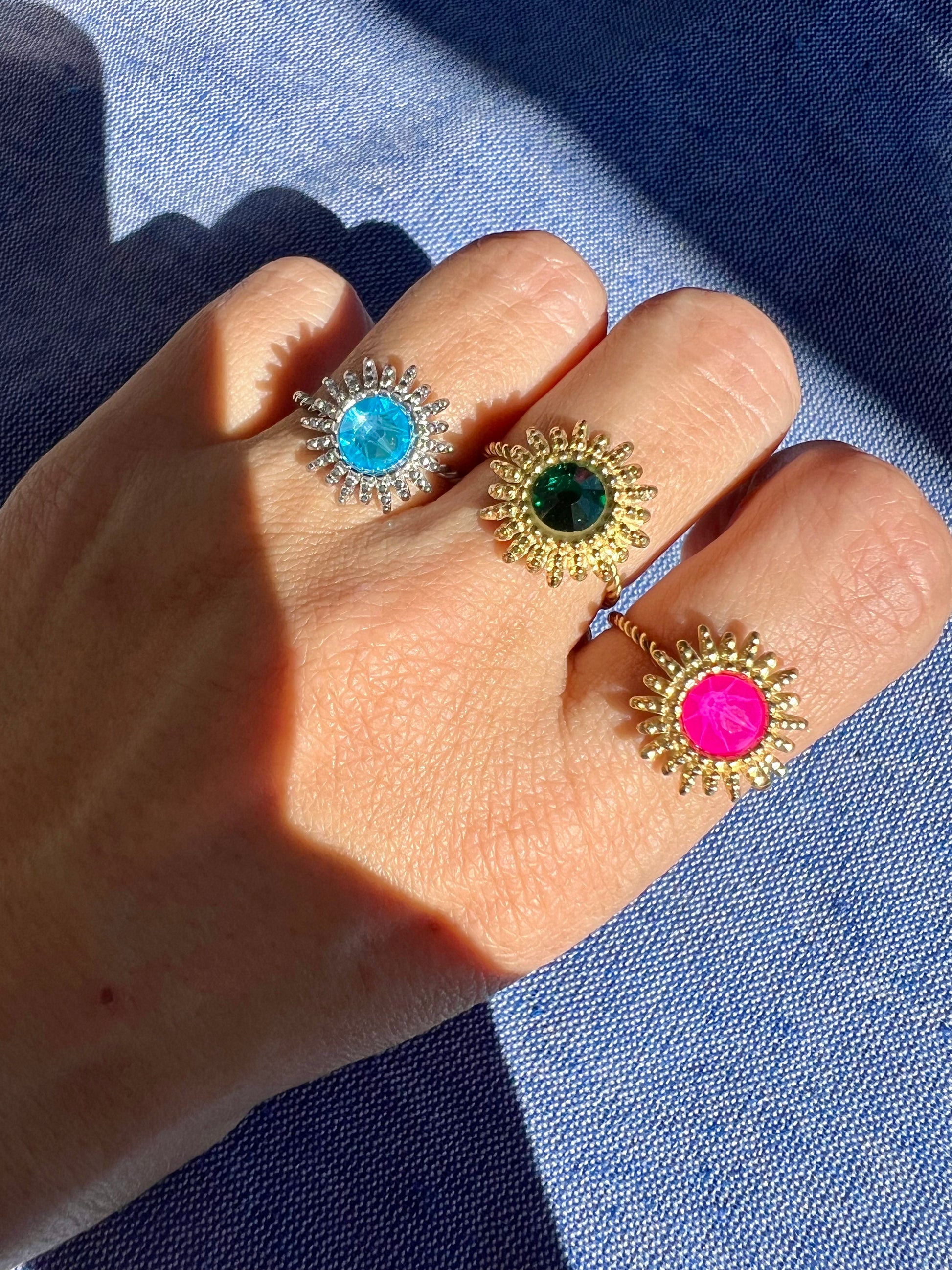 La bague YLÉANA est ornée d'un cristal, représentant un design rayonnant et éclatant. Son motif évoque la chaleur et la lumière, ajoutant une touche de glamour à n'importe quelle tenue. Un accessoire parfait pour celles qui aiment briller !